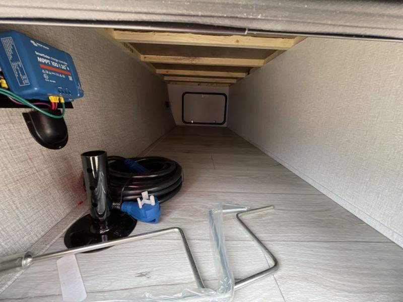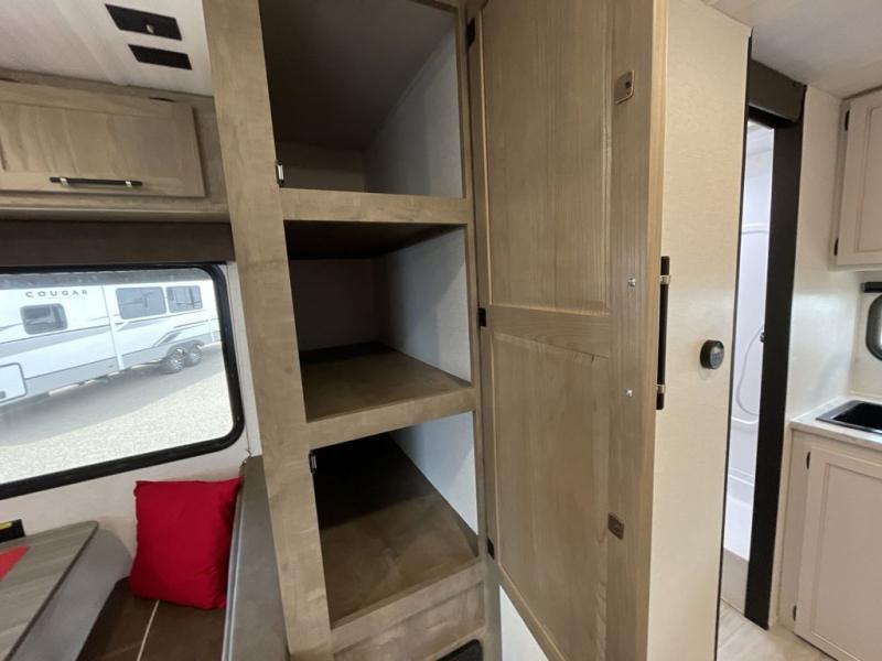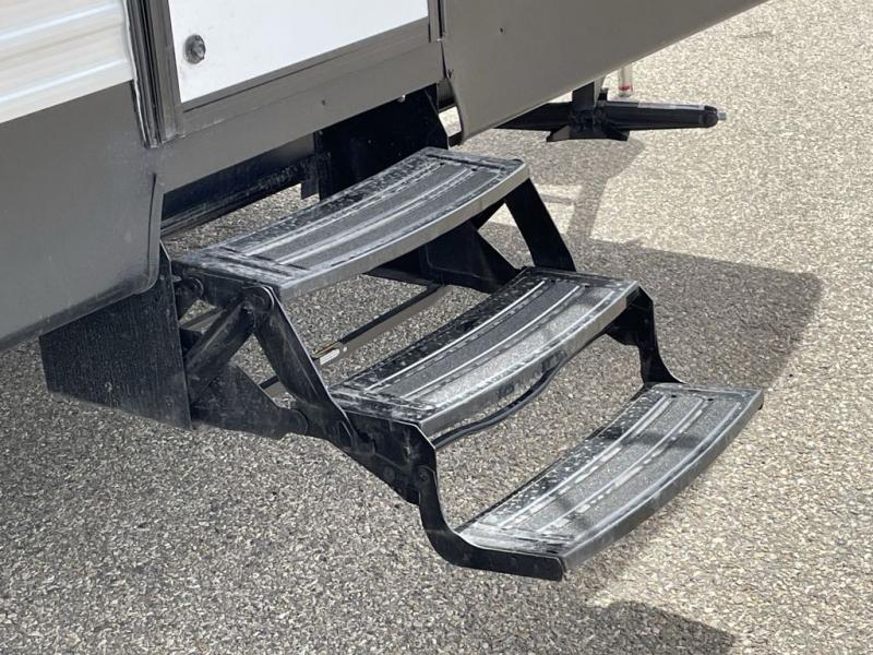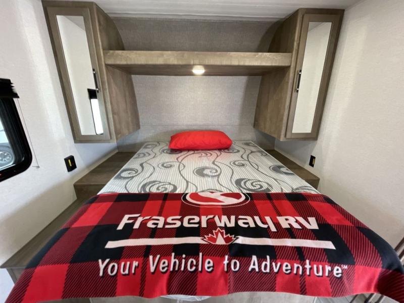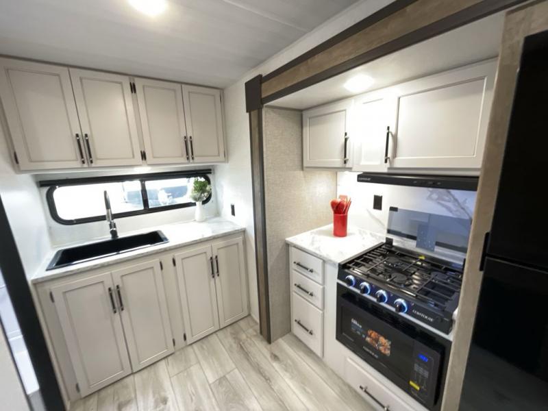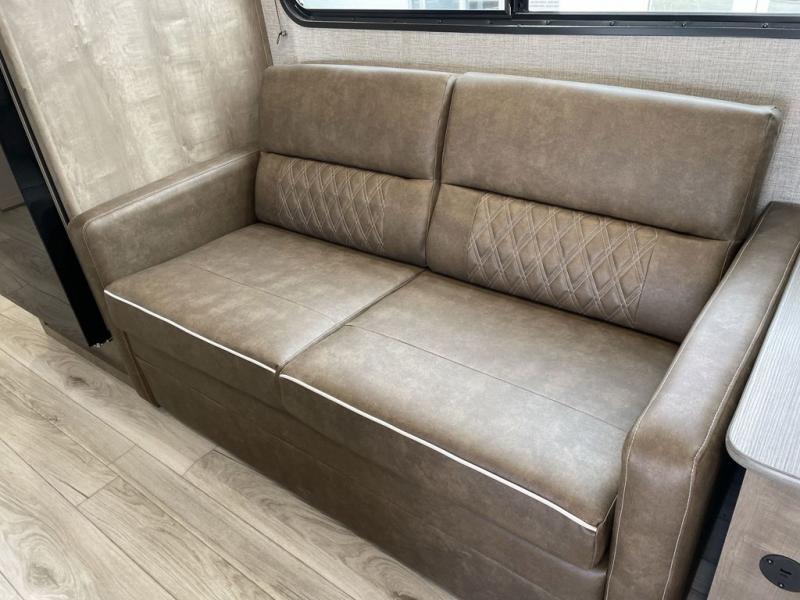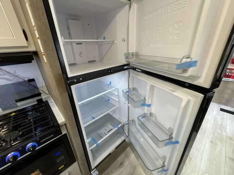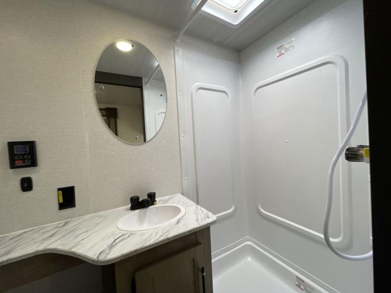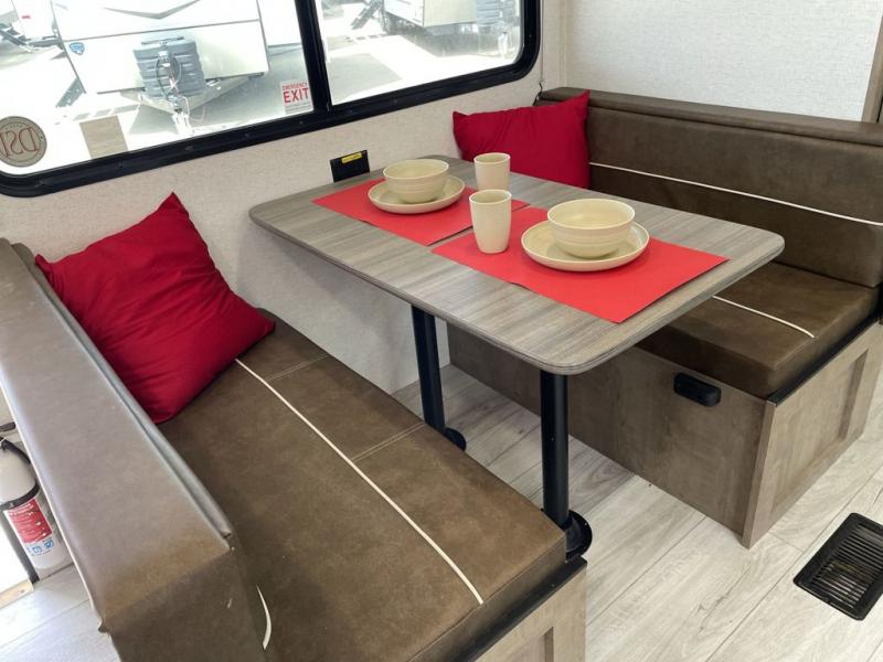 Trips to your favorite camping spot just got better in this open concept travel trailer. The large slide out houses the tri-fold sofa with an end table, three burner cooktop, refrigerator, and overhead cabinet for storage. You can clean up each day in the rear corner full bath with a shower skylight and a sliding door to save on space, and the other rear corner includes the spacious sink and counter space to prep meals. A booth dinette provides a place to dine, play games, and even let a guest sleep over. When you're ready to sleep, the queen bed up front is sure to bring a great night's rest, and there is a privacy curtain here for added convenience. You are sure to appreciate the laundry chute that allows you to throw clothes directly into the pass-through storage!
