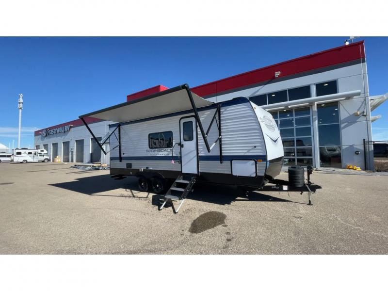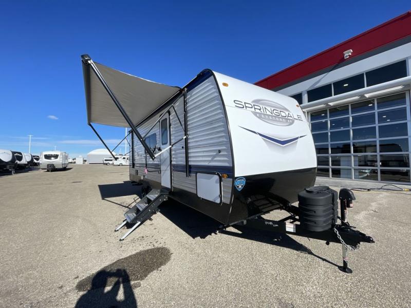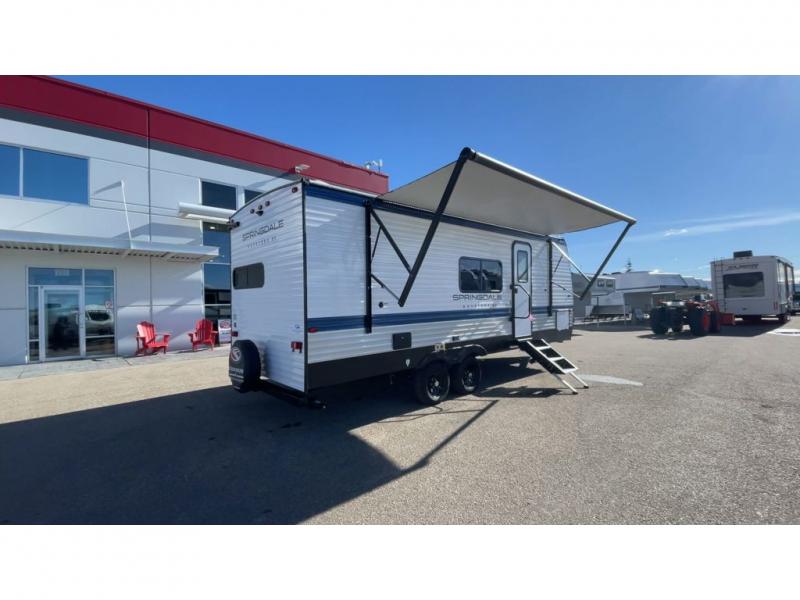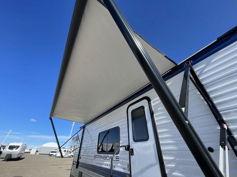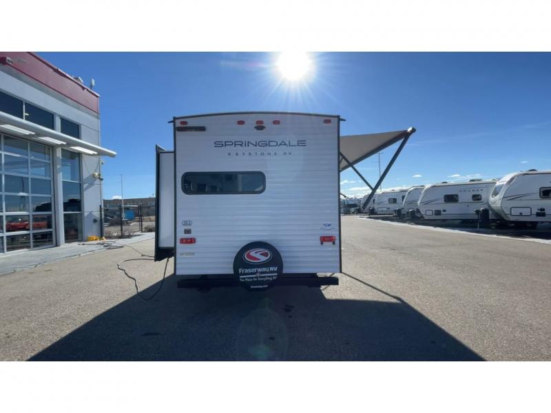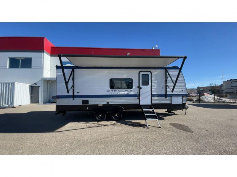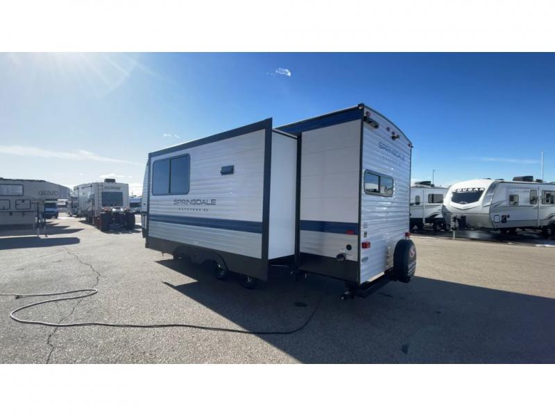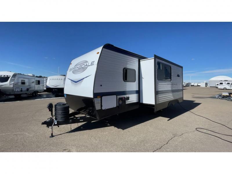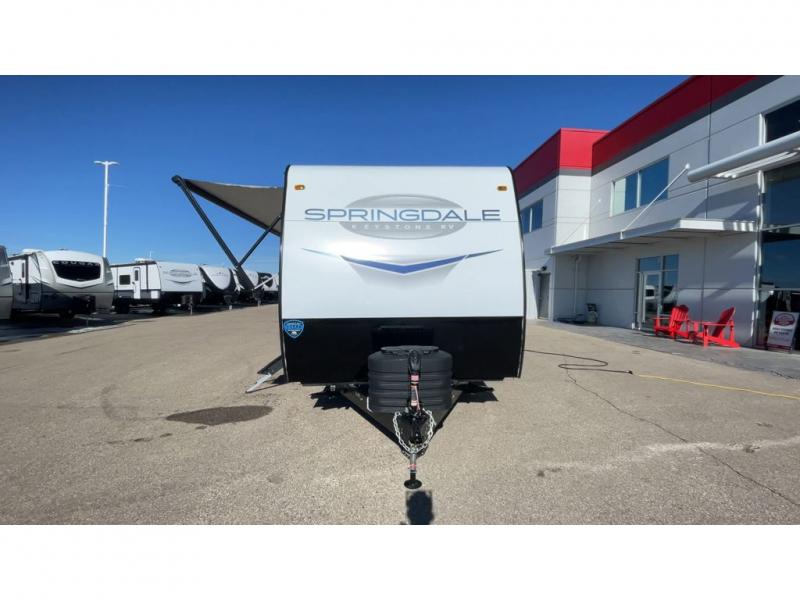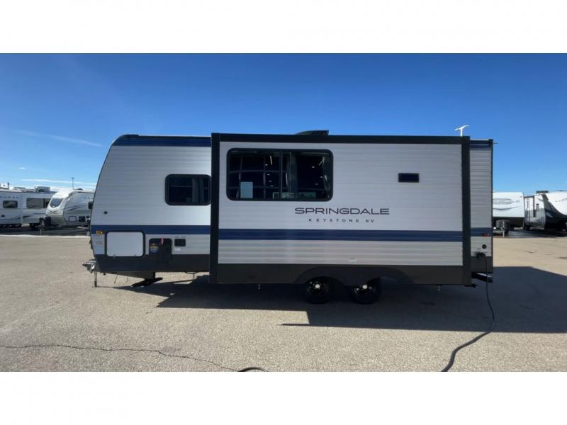 With any Springdale travel trailer by Keystone you will enjoy convenient amenities and comfortable camping features at every turn. The aluminum exterior will be easy to clean, and the power awning provides protection against the hot summer sun. There is also an exterior shower, a walkable roof, and an XL entry assist handle to safely enter and exit the unit. You will find many comforts inside, including a stainless steel sink, ample storage space for your belongings, and cozy sleeping spaces. Start a new adventure today in a Springdale travel trailer!
