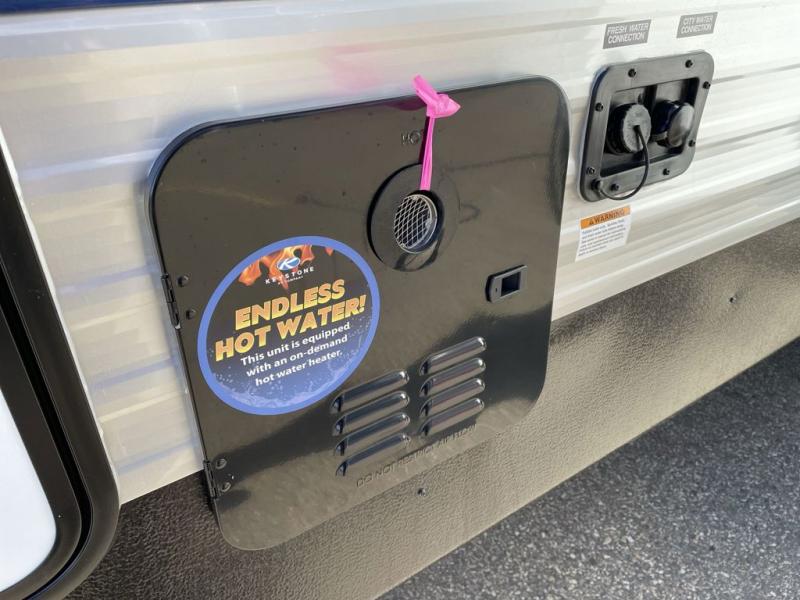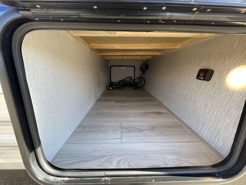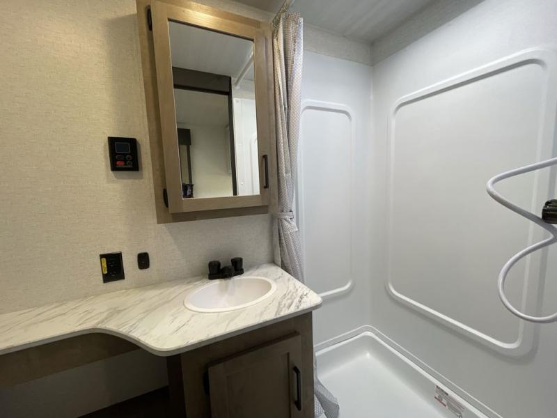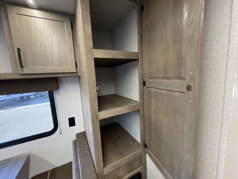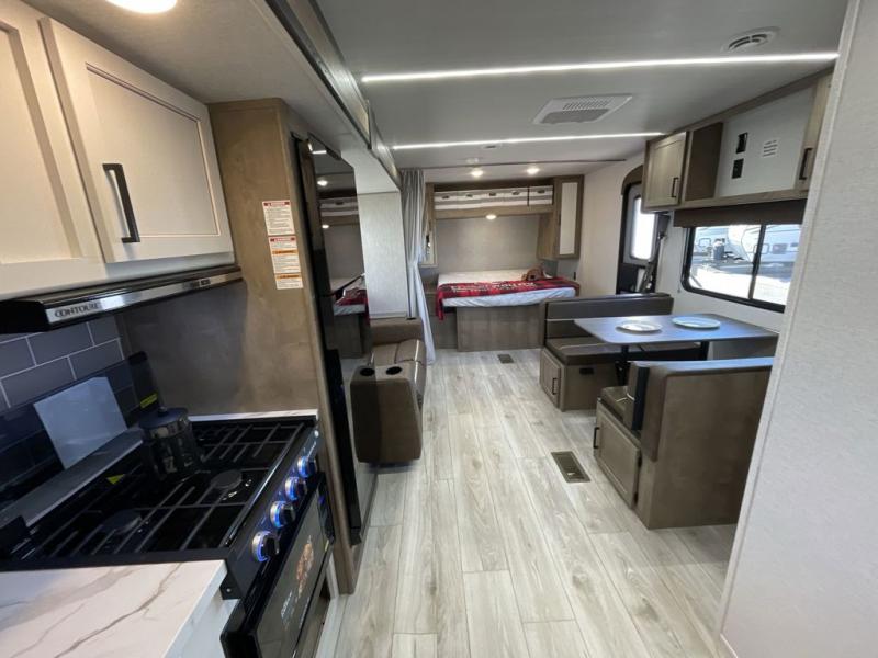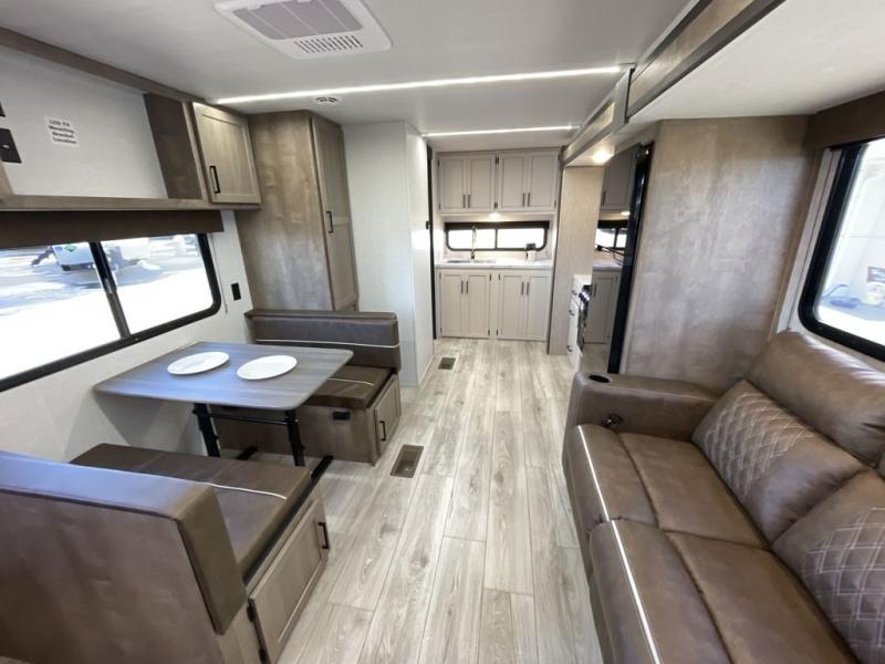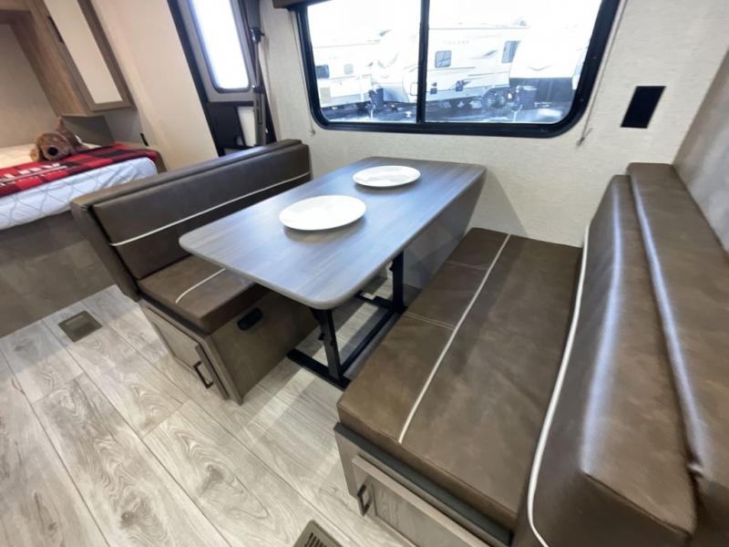 Trips to your favorite camping spot just got better in this open concept travel trailer. The large slide out houses the tri-fold sofa with an end table, three burner cooktop, refrigerator, and overhead cabinet for storage. You can clean up each day in the rear corner full bath with a shower skylight and a sliding door to save on space, and the other rear corner includes the spacious sink and counter space to prep meals. A booth dinette provides a place to dine, play games, and even let a guest sleep over. When you're ready to sleep, the queen bed up front is sure to bring a great night's rest, and there is a privacy curtain here for added convenience. You are sure to appreciate the laundry chute that allows you to throw clothes directly into the pass-through storage!