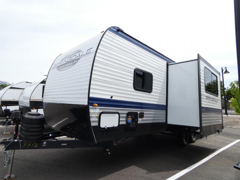 The Springdale Classic travel trailers by Keystone will provide you and your family many great outdoor experiences and it will also be kind to your pocketbook. Each one is constructed with an aluminum exterior, a walkable roof, and an I-beam frame with stamped steel cross-members and outriggers for added strength. There are also heavy duty stabilizer jacks and power tongue jacks outside, along with an XL entry assist handle for added convenience. Each travel trailer includes LED lighting, bedside outlets, and blackout night shades inside that will provide you with more privacy at night.