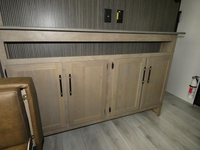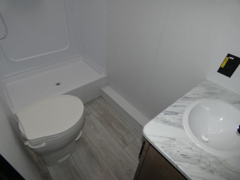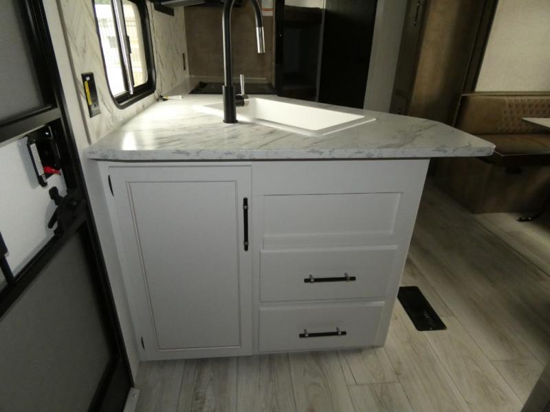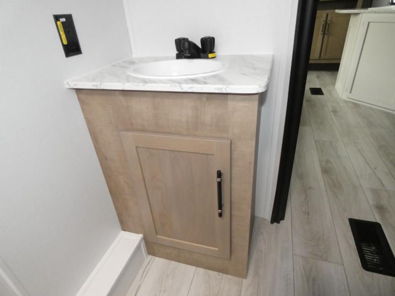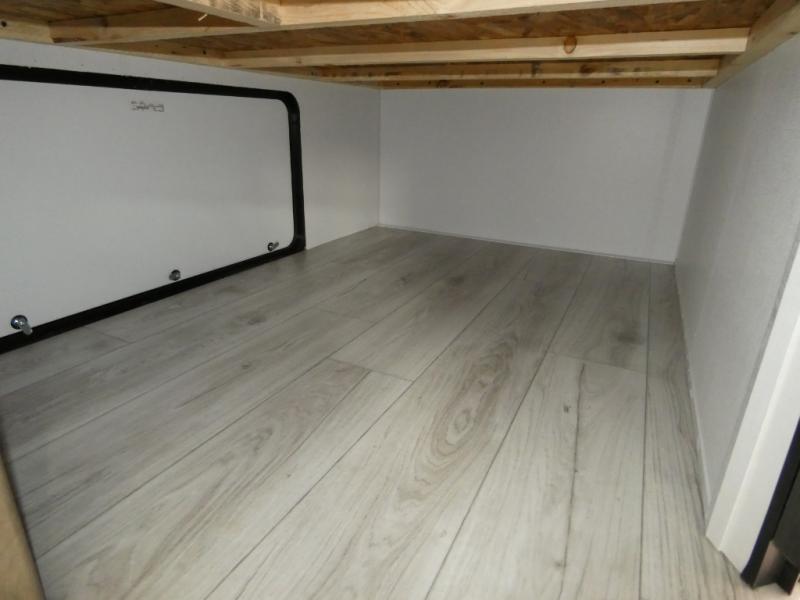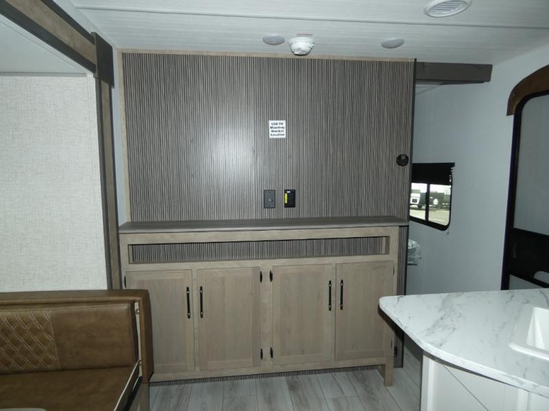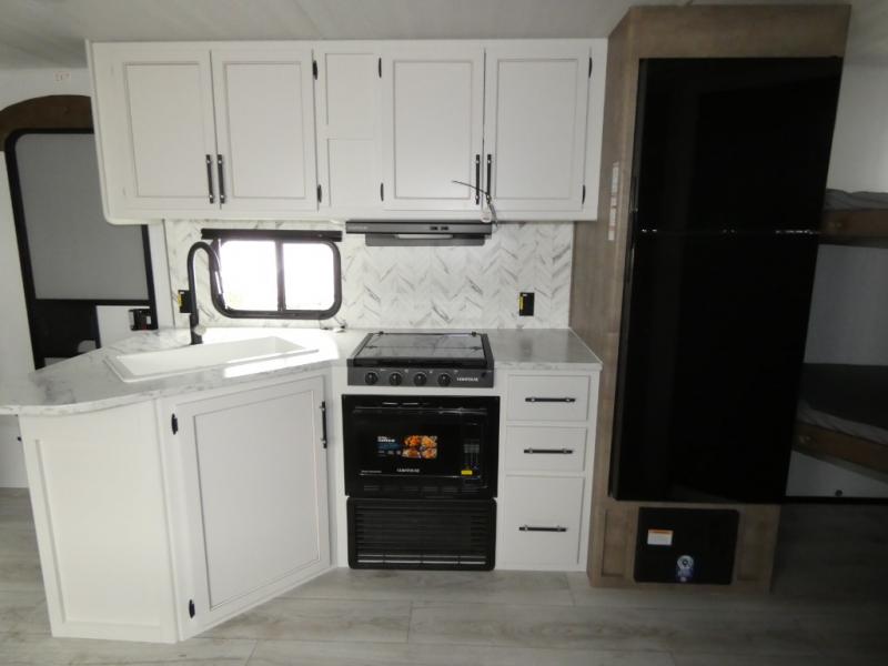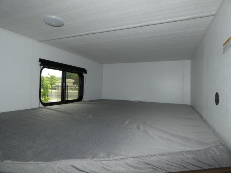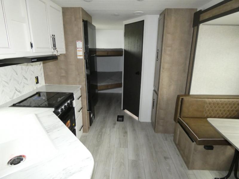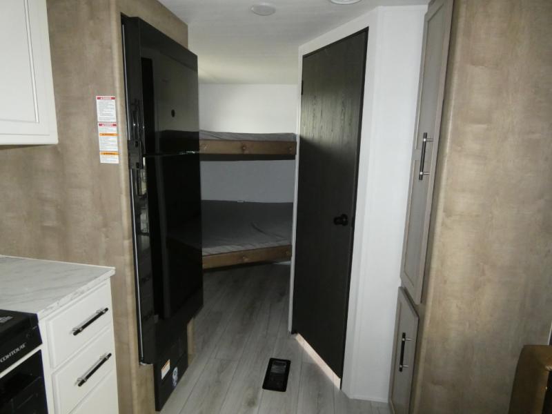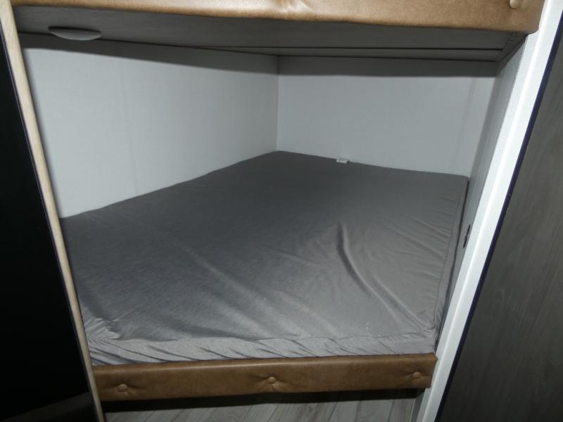 This bunkhouse travel trailer has room for your whole crowd! Enjoy the rear bunks or flip up the bottom one for more space. The front bedroom has a sliding door for privacy, plus dual closets and night stands. The kitchen features a three-burner range and 10 cu. ft. 12V refrigerator. Everyone will gather at the U-shape dinette. An entertainment center is standard and prepped for a TV. There is a front pass-through for housing all of your outdoor gear, as well as additional protection from the elements.