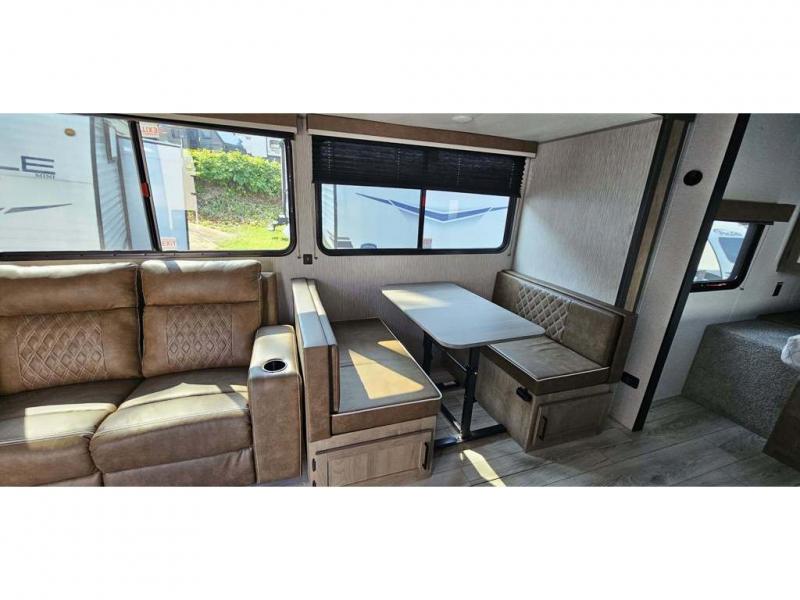 You will love the amount of space you have in this rear bath trailer! Once the large slide is put out, you can let the dog nap on the floor, relax on the tri-fold sofa, or play a game at the booth dinette. The chef will will be able to cook meals on the three burner cooktop and store leftovers in the 10 cu. ft. refrigerator. A full rear bath onboard lets you clean up each day, and the front private bedroom has a queen bed just like at home. There are also dual closets and dual nightstands for your things, and a convenient laundry chute. Head outdoors to enjoy the 16' awning and outdoor refrigerator!