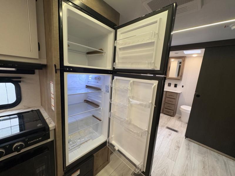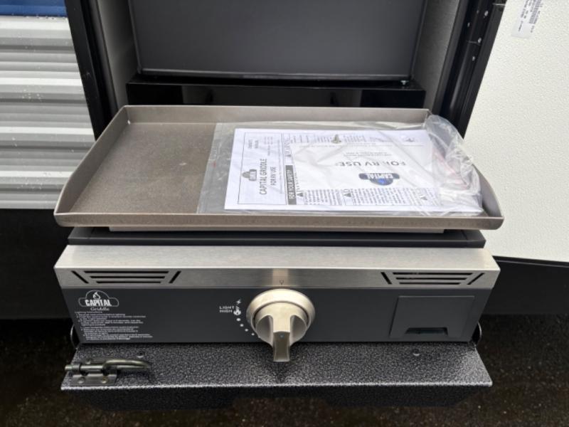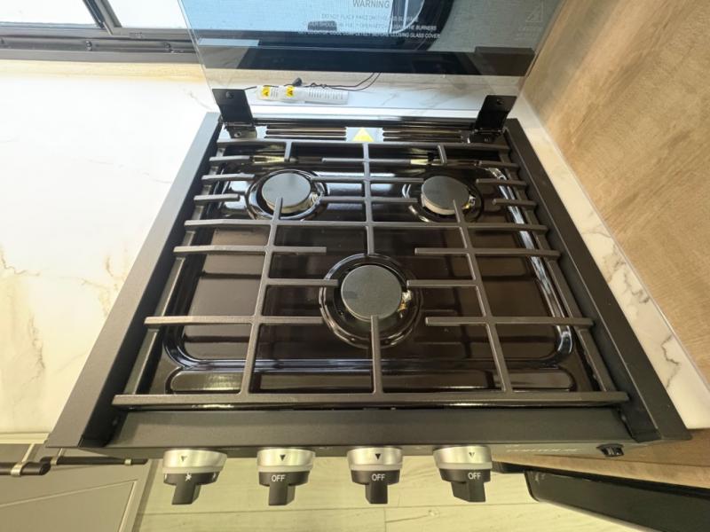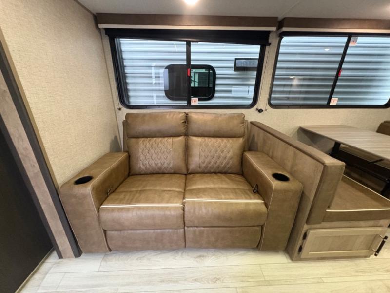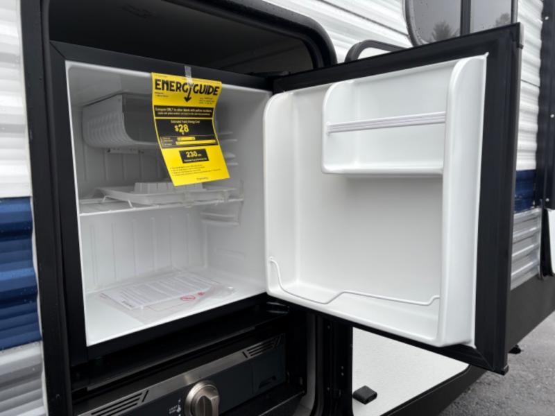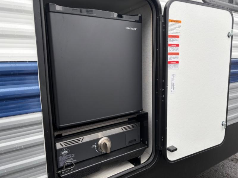 You will love the amount of space you have in this rear bath trailer! Once the large slide is put out, you can let the dog nap on the floor, relax on the tri-fold sofa, or play a game at the booth dinette. The chef will will be able to cook meals on the three burner cooktop and store leftovers in the 10 cu. ft. refrigerator. A full rear bath onboard lets you clean up each day, and the front private bedroom has a queen bed just like at home. There are also dual closets and dual nightstands for your things, and a convenient laundry chute. Head outdoors to enjoy the 16' awning and outdoor refrigerator!