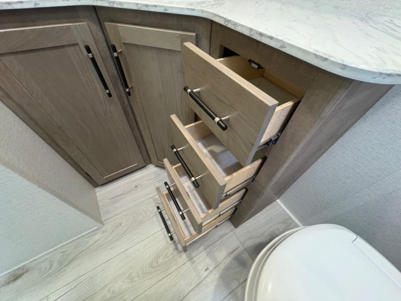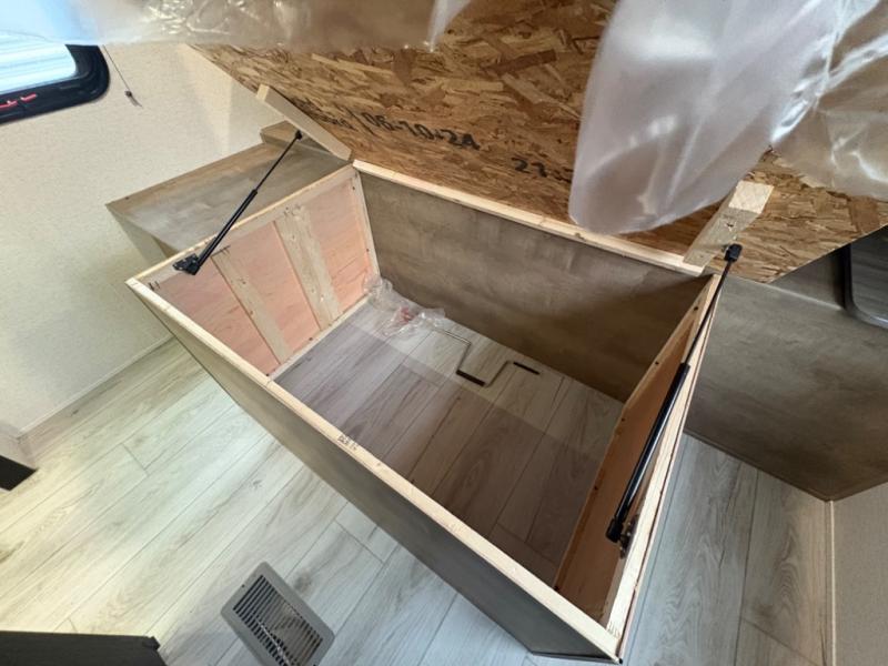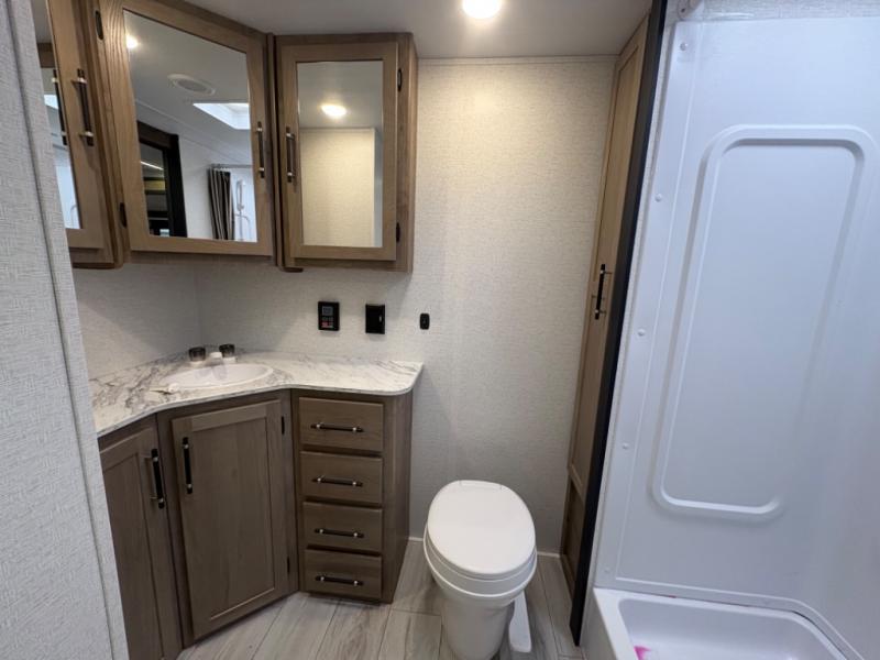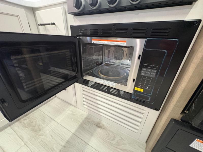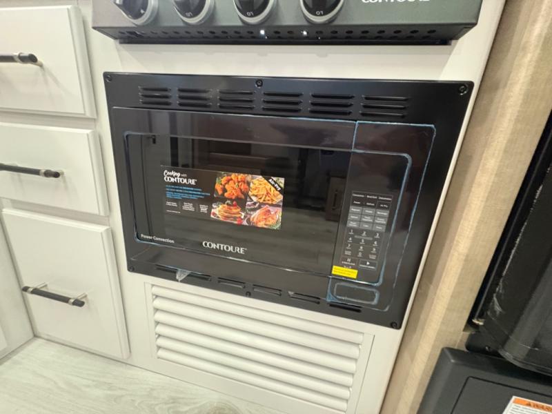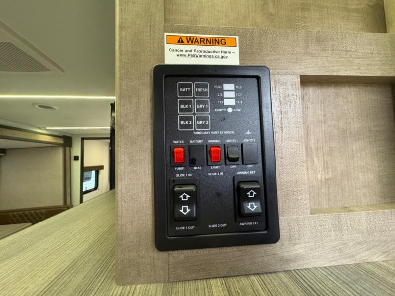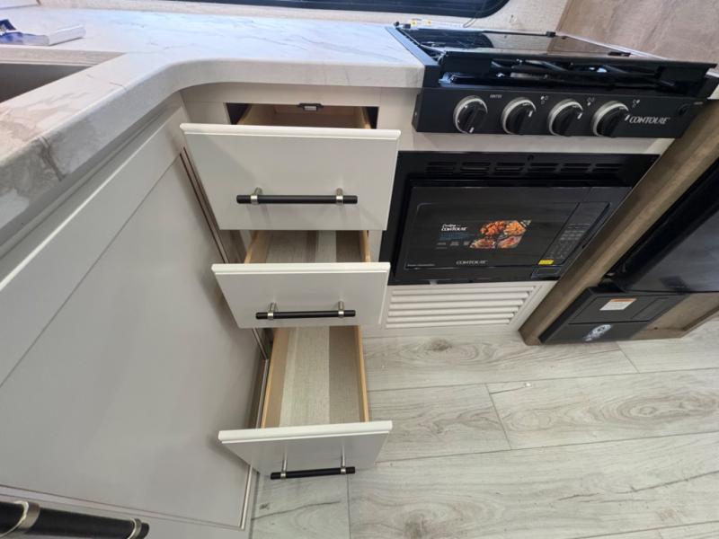 You will love the amount of space you have in this rear bath trailer! Once the large slide is put out, you can let the dog nap on the floor, relax on the tri-fold sofa, or play a game at the booth dinette. The chef will will be able to cook meals on the three burner cooktop and store leftovers in the 10 cu. ft. refrigerator. A full rear bath onboard lets you clean up each day, and the front private bedroom has a queen bed just like at home. There are also dual closets and dual nightstands for your things, and a convenient laundry chute. Head outdoors to enjoy the 16' awning and outdoor refrigerator!