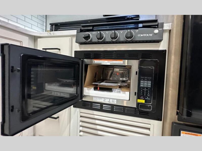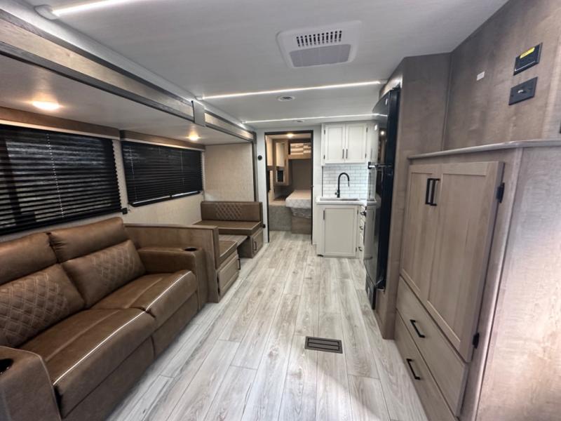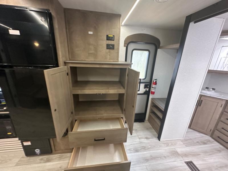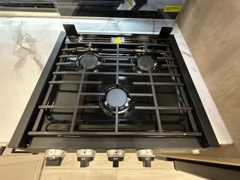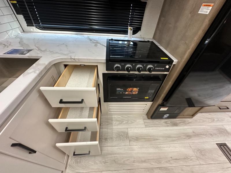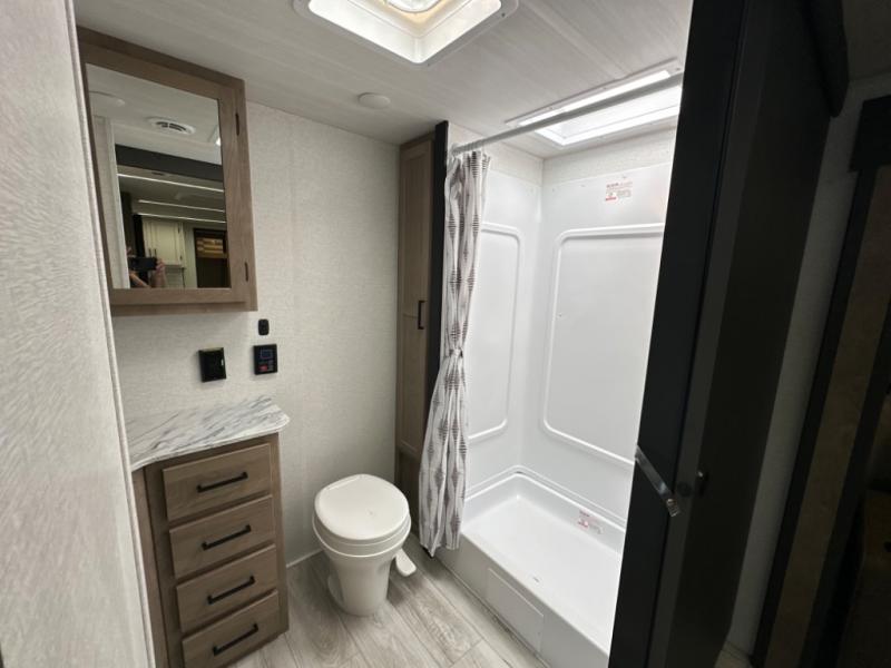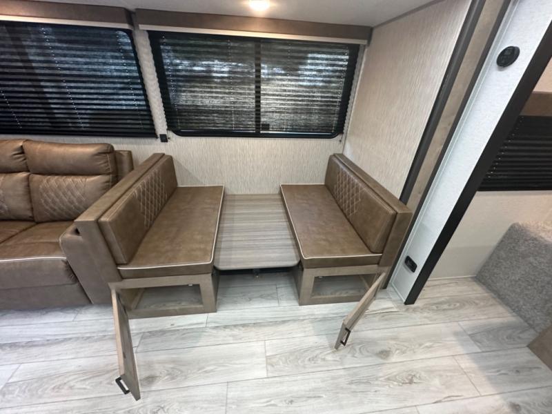 You will love the amount of space you have in this rear bath trailer! Once the super slide is put out, you can let the dog nap on the floor, relax on the sofa, or play a game at the booth dinette. The chef will will be able to cook meals on the three burner cooktop and store leftovers in the 10 cu. ft. 12V refrigerator. A full rear bath onboard lets you clean up each day, and the front private bedroom has a queen bed just like at home. There are also dual closets and dual nightstands for your things, and a convenient laundry chute. Head outdoors to enjoy the 16' awning and outdoor refrigerator!