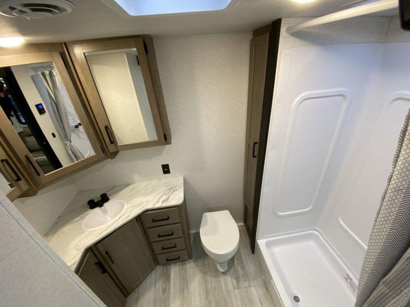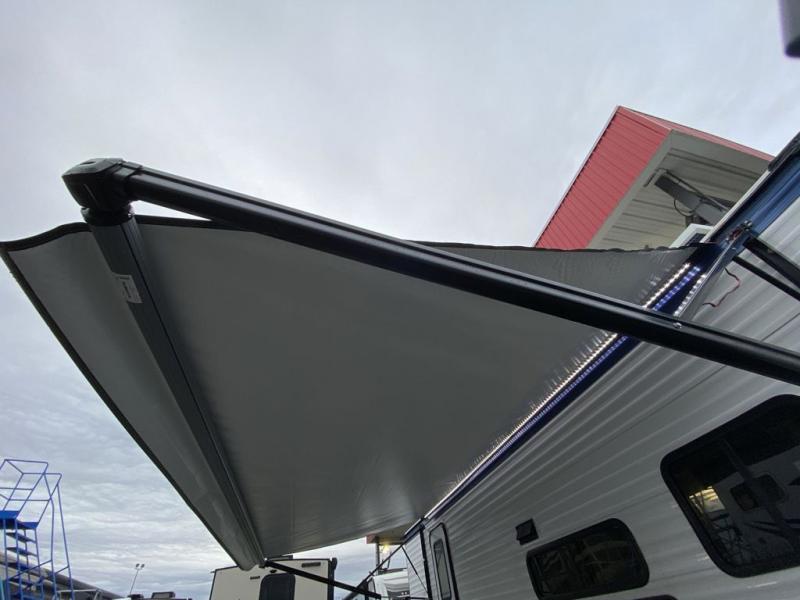 You will love the amount of space you have in this rear bath trailer! Once the large slide is put out, you can let the dog nap on the floor, relax on the jack knife sofa, or play a game at the booth dinette. The chef will will be able to cook meals on the three burner cooktop and store leftovers in the refrigerator. A full rear bath with a 38" walk-in shower onboard lets you clean up each day, and the front private bedroom has a queen bed just like at home. There are also dual closets and dual nightstands for your things, and a convenient laundry chute. Head outdoors to enjoy the 16' awning plus outdoor griddle and refrigerator!