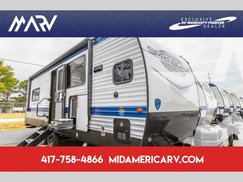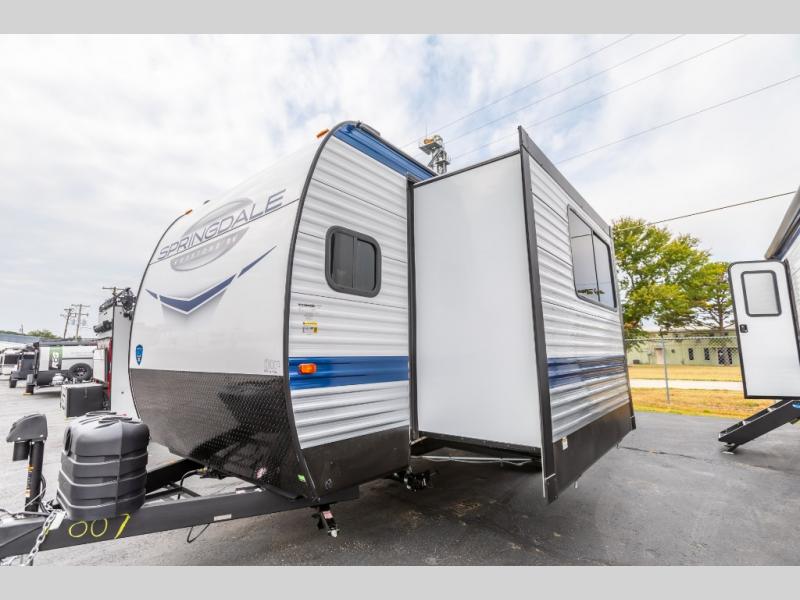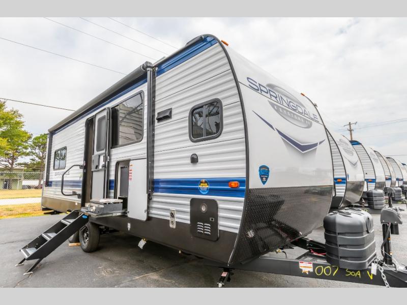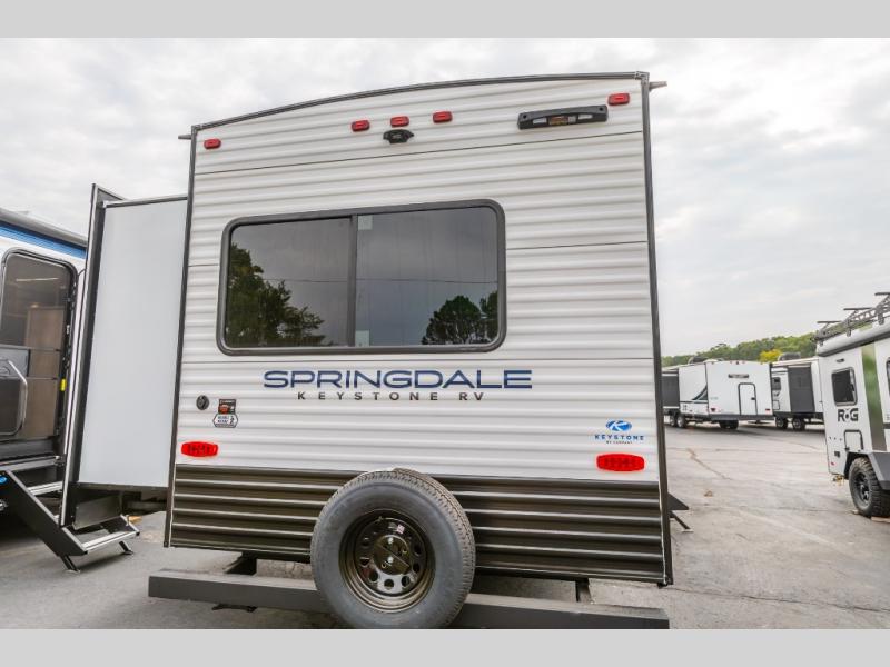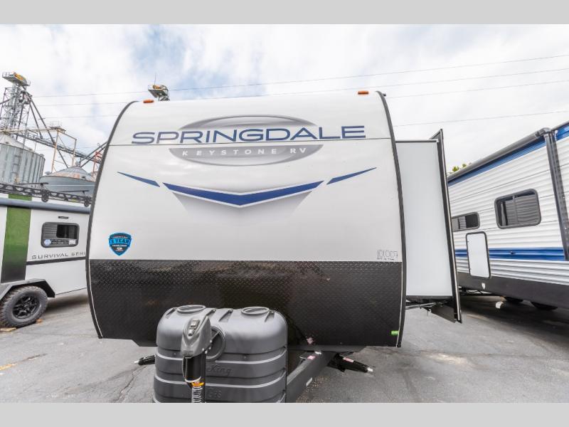 With any Springdale travel trailer by Keystone you will enjoy convenient amenities and comfortable camping features at every turn. The aluminum exterior will be easy to clean, and the power awning provides protection against the hot summer sun. There is also an exterior shower, a walkable roof, and an XL entry assist handle to safely enter and exit the unit. You will find many comforts inside, including a stainless steel sink, ample storage space for your belongings, and cozy sleeping spaces. Start a new adventure today in a Springdale travel trailer!