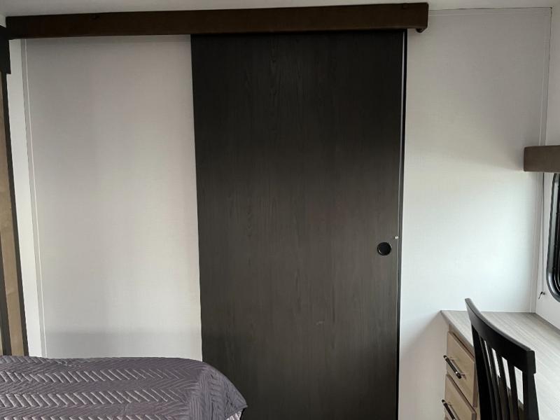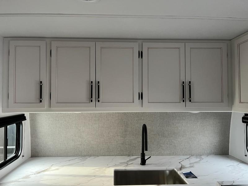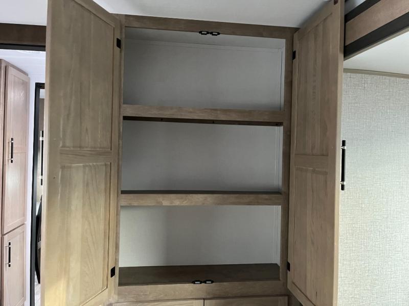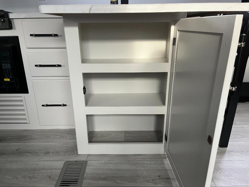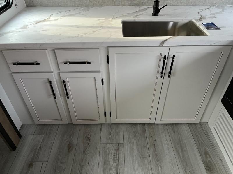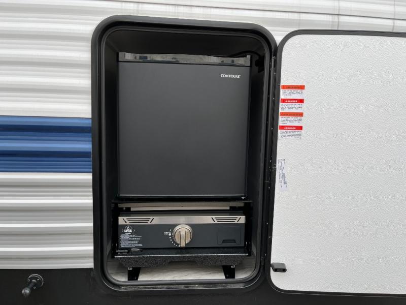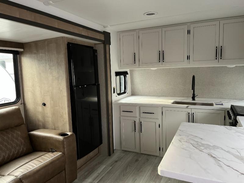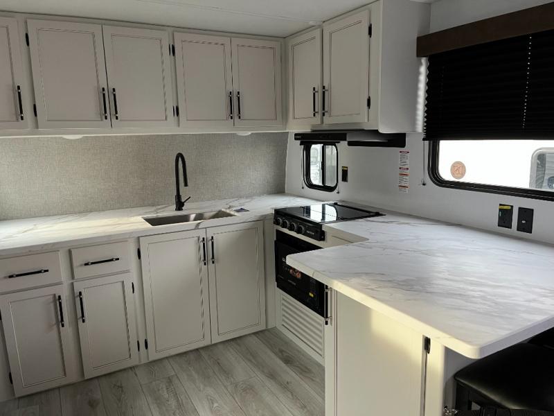 You'll love time spent at the campground in this front kitchen travel trailer. There is ample counter space to prep meals, along with a three burner range, air fryer microwave, and a countertop with chairs. You'll also appreciate the 10 cu. ft. refrigerator, pantry, and a second, lower pantry for tons of storage space. The front kitchen is inviting, but if the weather is nice, you may just find yourselves outdoors at the outside kitchen! A walk thru bath leads to the rear private bedroom where you'll enjoy a queen bed slide out, a wardrobe to keep your clothes tidy, and a desk with a chair if you need to get some work done. And if you have any guests, they can sleep on the tri-fold sofa slide in the main living area; how convenient!