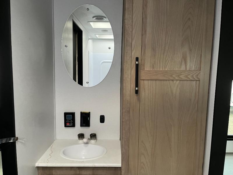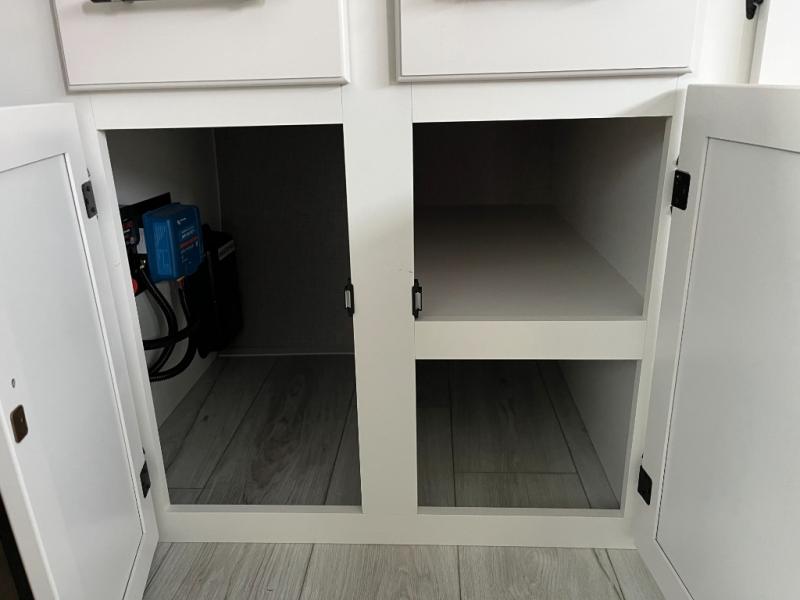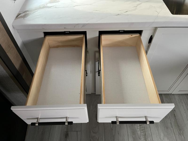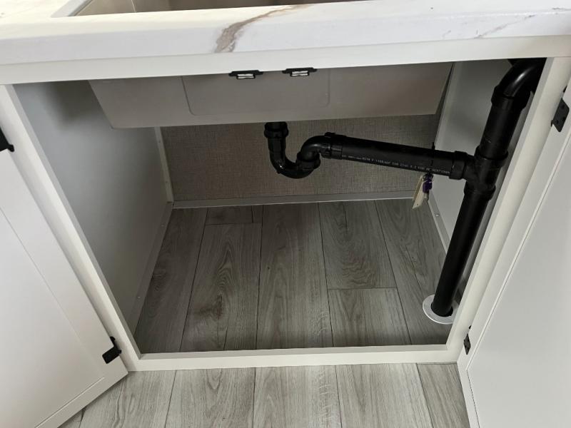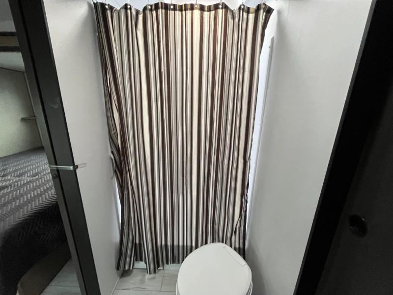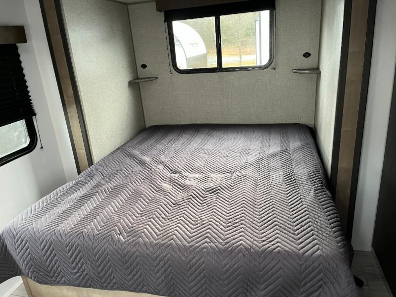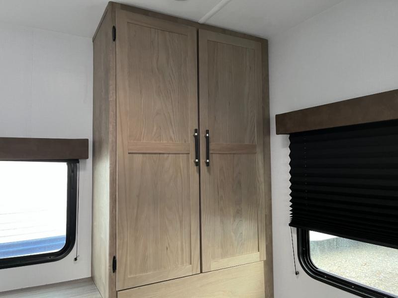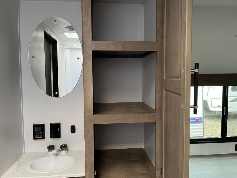 You'll love time spent at the campground in this front kitchen travel trailer. There is ample counter space to prep meals, along with a three burner range, air fryer microwave, and a countertop with chairs. You'll also appreciate the 10 cu. ft. refrigerator, pantry, and a second, lower pantry for tons of storage space. The front kitchen is inviting, but if the weather is nice, you may just find yourselves outdoors at the outside kitchen! A walk thru bath leads to the rear private bedroom where you'll enjoy a queen bed slide out, a wardrobe to keep your clothes tidy, and a desk with a chair if you need to get some work done. And if you have any guests, they can sleep on the tri-fold sofa slide in the main living area; how convenient!