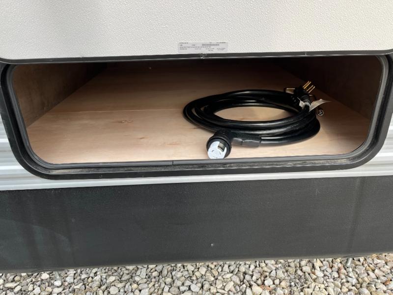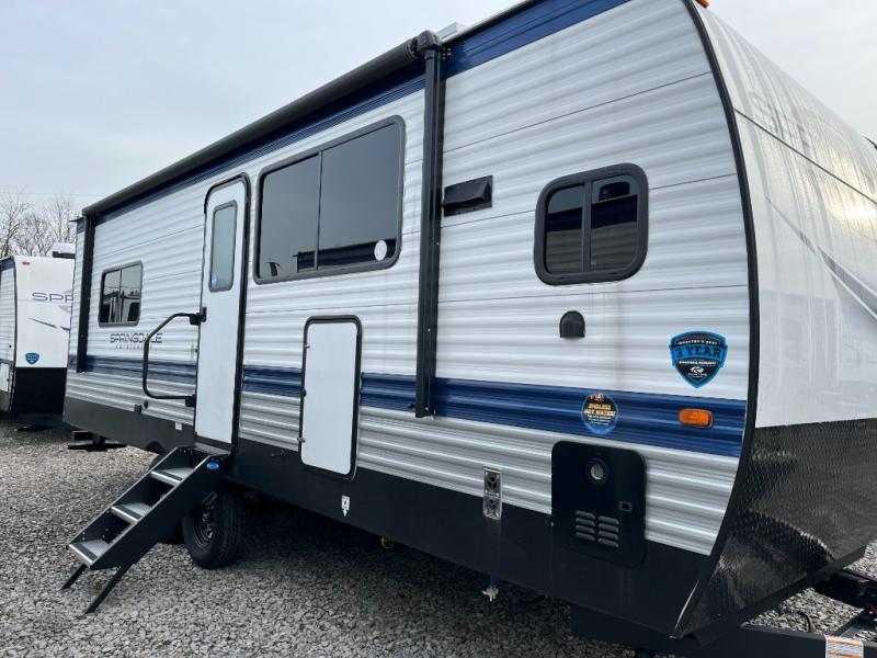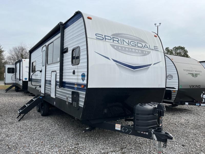 With any Springdale travel trailer by Keystone you will enjoy convenient amenities and comfortable camping features at every turn. The aluminum exterior will be easy to clean, and the power awning provides protection against the hot summer sun. There is also an exterior shower, a walkable roof, and an XL entry assist handle to safely enter and exit the unit. You will find many comforts inside, including a stainless steel sink, ample storage space for your belongings, and cozy sleeping spaces. Start a new adventure today in a Springdale travel trailer!