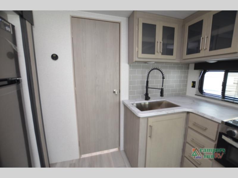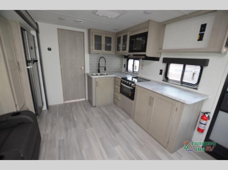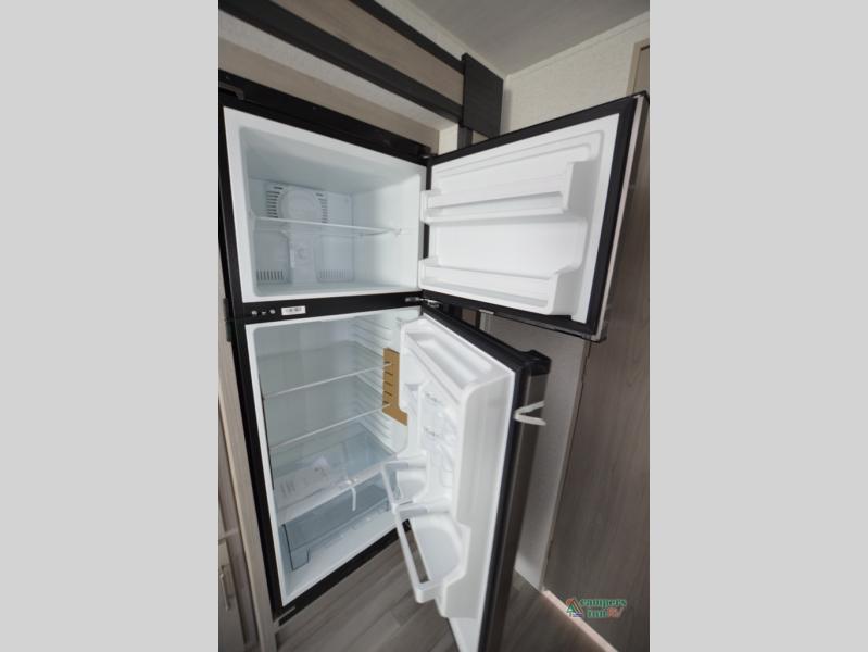 Load up and head to the lake in this cozy travel trailer. The large slide out will provide your crew with more space to stretch out, and the rear U-shaped dinette features a panoramic view to enjoy nature views. The kitchen includes a three burner cooktop, plus an air fryer microwave oven and an 10 cu. ft. refrigerator. You'll also find a tri-fold sofa within the slide out. Head through the bath to enjoy your private bedroom with a queen bed, dual closets and nightstands, plus a shelf over the bed for your belongings.