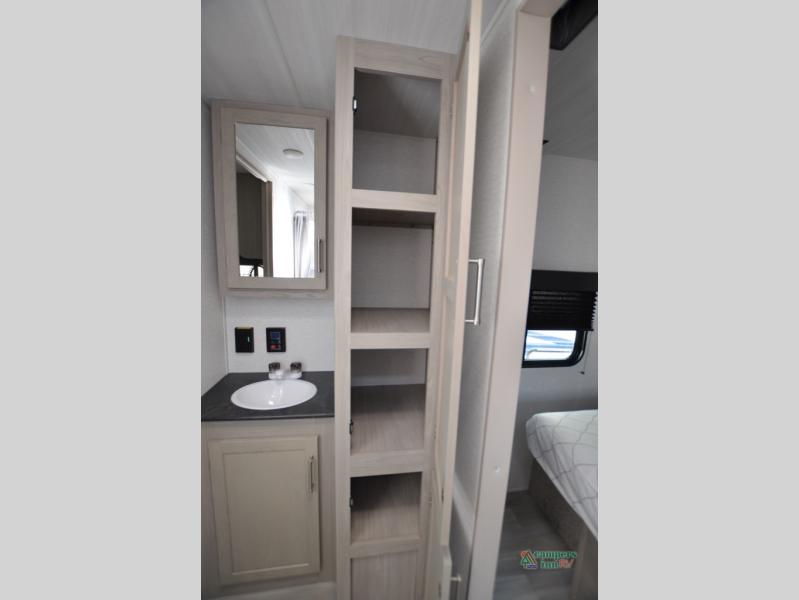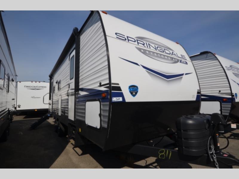 With any Springdale travel trailer by Keystone you will enjoy convenient amenities and comfortable camping features at every turn. The aluminum exterior will be easy to clean, and the power awning provides protection against the hot summer sun. There is also an exterior shower, a walkable roof, and an XL entry assist handle to safely enter and exit the unit. You will find many comforts inside, including a stainless steel sink, ample storage space for your belongings, and cozy sleeping spaces. Start a new adventure today in a Springdale travel trailer.