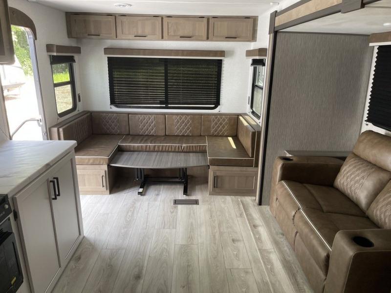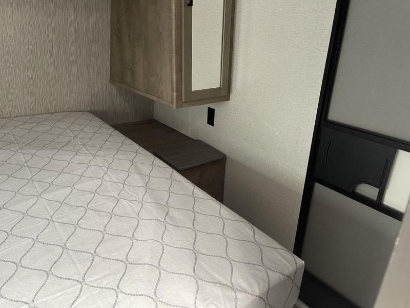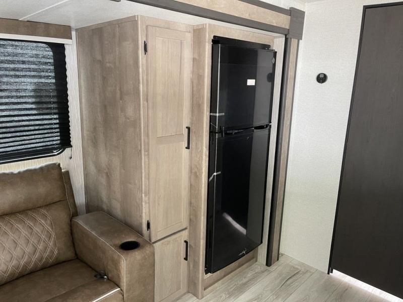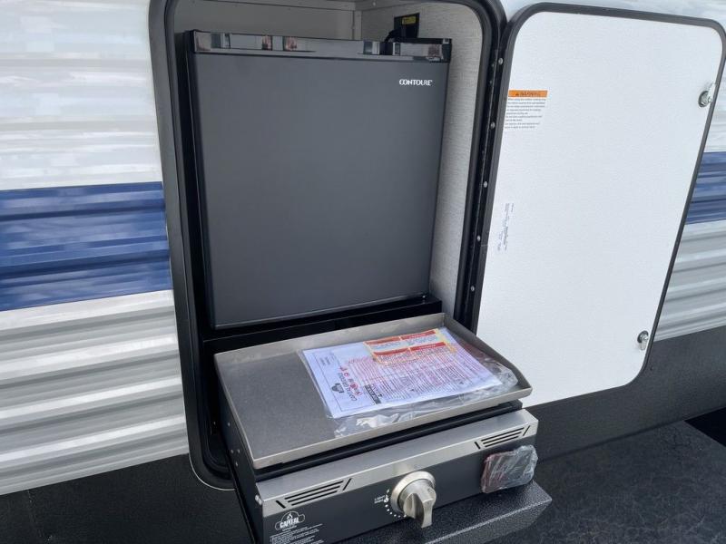 Load up and head to the lake in this cozy travel trailer. The large slide out will provide your crew with more space to stretch out, and the rear U-shaped dinette features a panoramic view to enjoy nature views. The kitchen includes a three burner cooktop, plus an air fryer microwave oven and an 10 cu. ft. refrigerator. You'll also find a tri-fold sofa within the slide out. Head through the bath to enjoy your private bedroom with a queen bed, dual closets and nightstands, plus a shelf over the bed for your belongings.