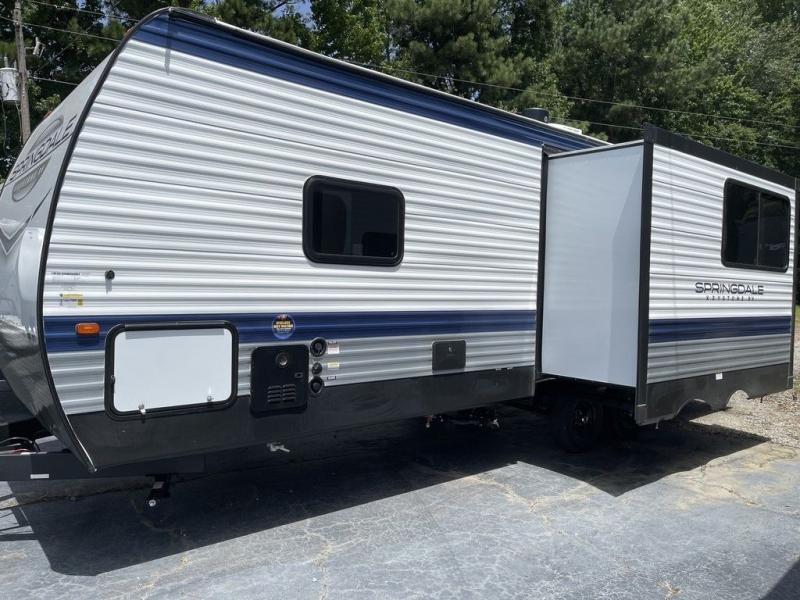 With any Springdale travel trailer by Keystone you will enjoy convenient amenities and comfortable camping features at every turn. The aluminum exterior will be easy to clean, and the power awning provides protection against the hot summer sun. There is also an exterior shower, a walkable roof, and an XL entry assist handle to safely enter and exit the unit. You will find many comforts inside, including a stainless steel sink, ample storage space for your belongings, and cozy sleeping spaces. Start a new adventure today in a Springdale travel trailer!