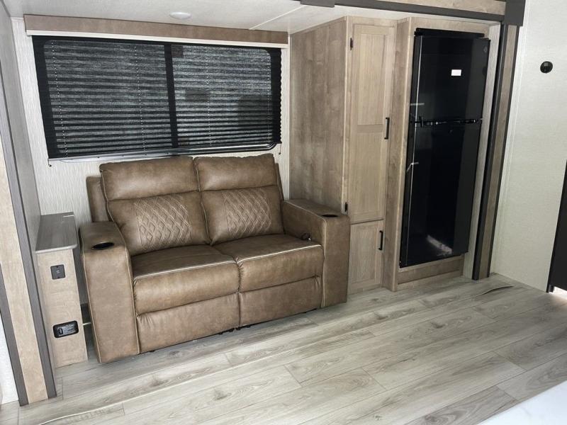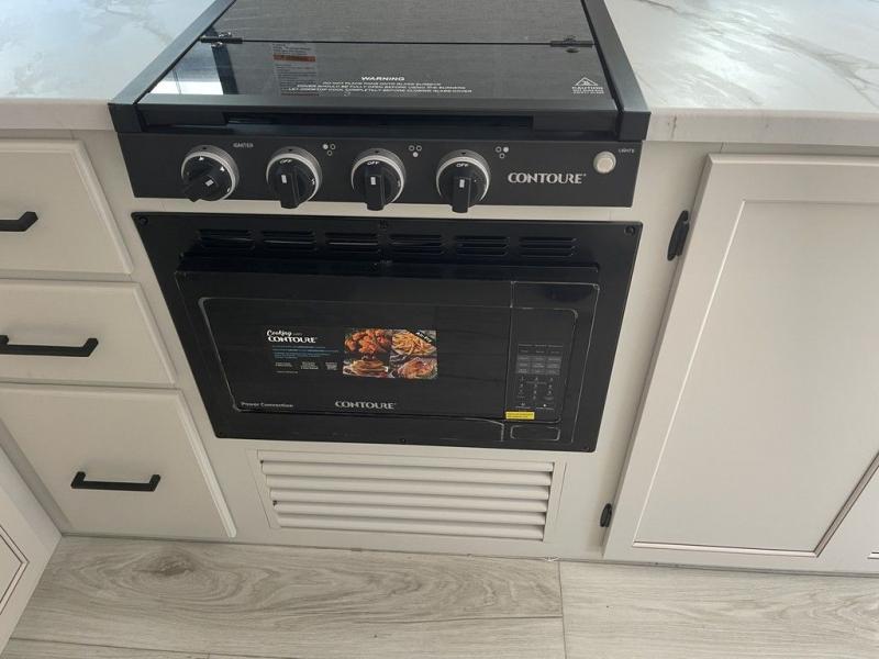 Equipped with electric awning, ducted air conditioner, ten cubic foot 12 volt refrigerator, 220 watt solar panel, fold out safety steps, outdoor cooking center with 120 volt refrigerator and gas griddle. power tongue jack. Three burner range along with convection/air fryer oven. On Demand water heater and more.