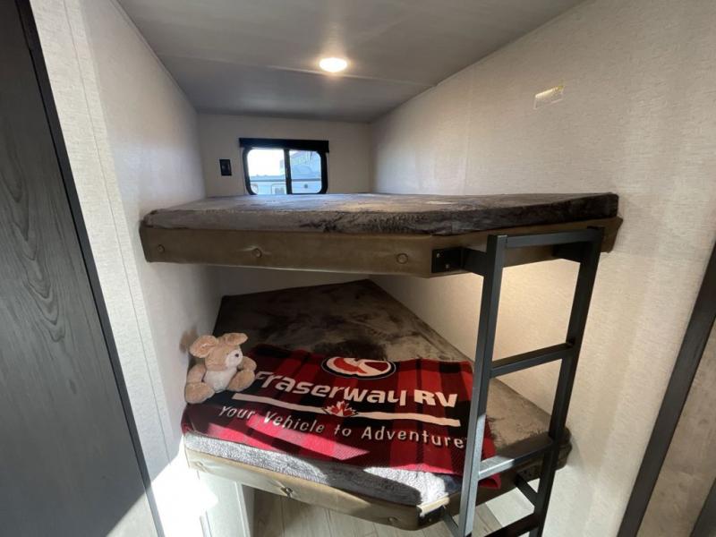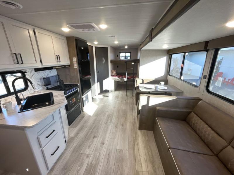 The 2025 Keystone Springdale 261BHCWE is a travel trailer designed to comfortably accommodate families and groups, with sleeping arrangements for up to ten people. Its spacious interior features a super slide-out that houses a booth dinette and a sofa, providing ample space for dining and relaxation. The front private bedroom includes a queen bed with dual closets and nightstands, while double-size bunks at the rear offer additional sleeping quarters. A full bathroom is conveniently located nearby for easy access. The kitchen is equipped with a two-burner flush mount gas range with a glass cover, extra tall overhead cabinets, and a high-rise faucet. Outside, the trailer boasts a 16-foot power awning and pass-through storage for added convenience. Constructed with an aluminum exterior, walkable roof, and I-beam frame with stamped steel cross-members and outriggers, the Springdale Classic 261BHCWE ensures durability and strength. Additional features include electric stabilizer jacks, a power tongue jack, blackout night shades, and bedside outlets. Optional SolarFlex 200 allows for off-grid capabilities. The trailer measures approximately 30 feet 8 inches in length, has a dry weight of around 6,090 pounds, and holds a fresh water capacity of 54 gallons.