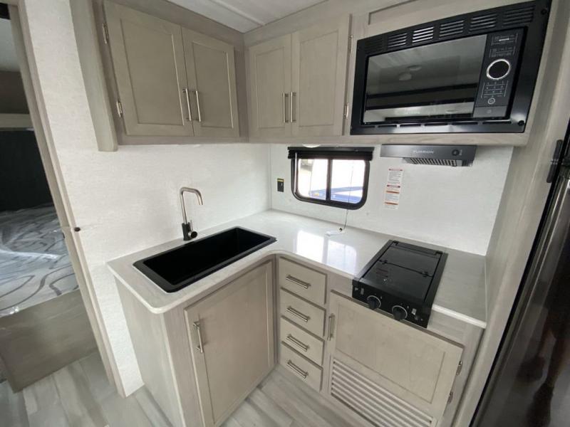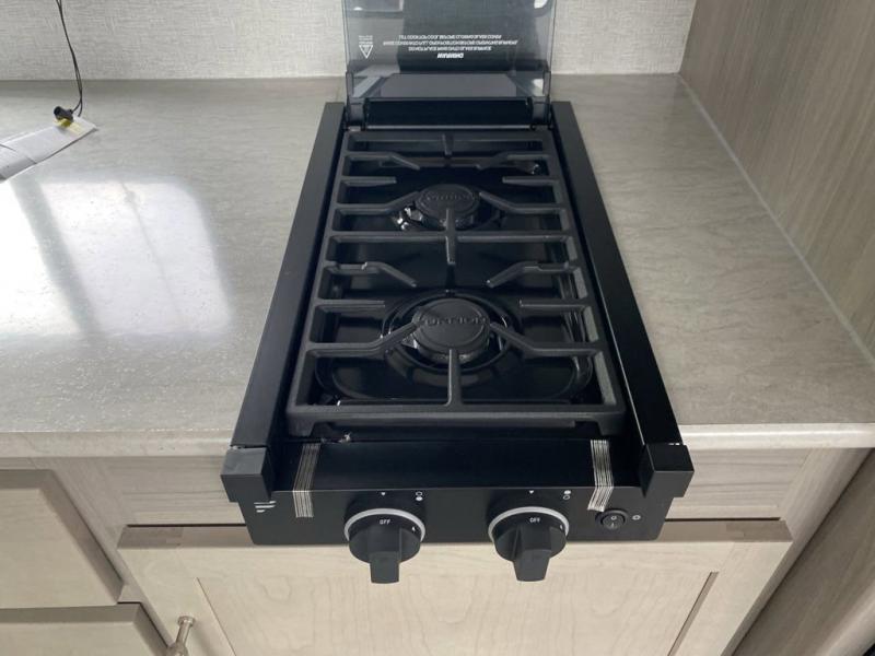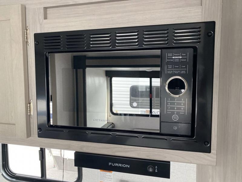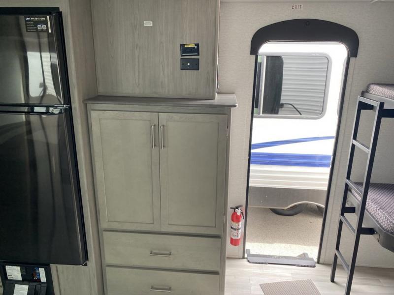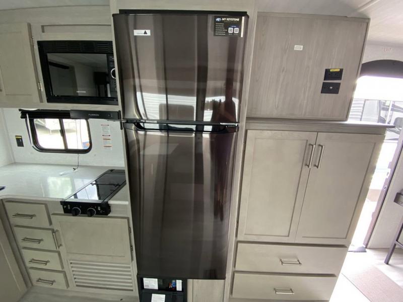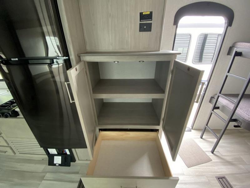 What could be better than camping with double-size bunks for guests? How about a front private bedroom for you, a full bath to clean up in, and a large slide out for maximum space! The chef of your group can prepare breakfast on the three burner gas range in the morning, or use the microwave if you're on the go. There is a U-shaped dinette to dine at, or you can take your plate outdoors to sit under the power awning.