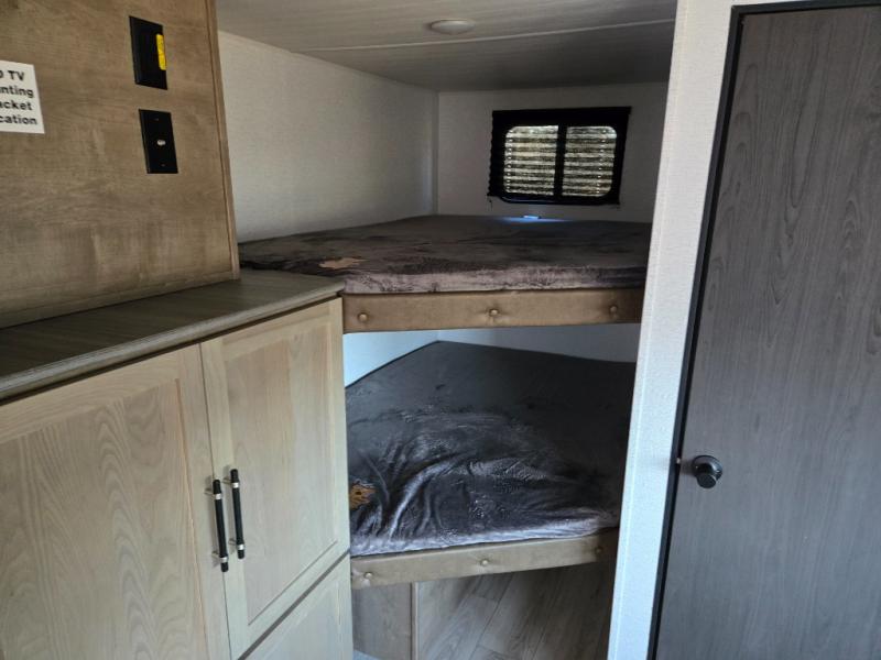 What could be better than camping with double-size bunks for guests? How about a front private bedroom for you, a full bath to clean up in, and a large slide out for maximum space! The chef of your group can prepare breakfast on the cooktop in the morning, or use the microwave if you're on the go. There is a booth dinette to dine at, or you can take your plate outdoors to sit under the power awning.