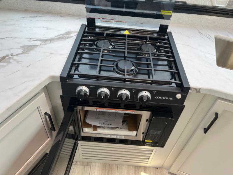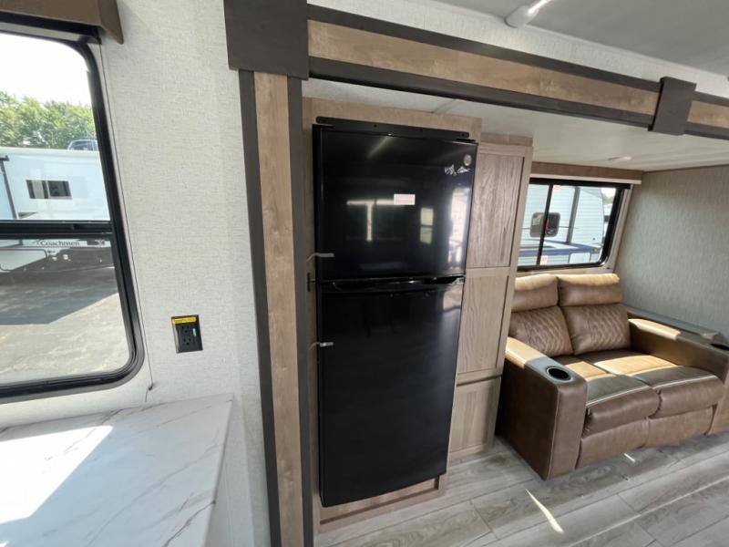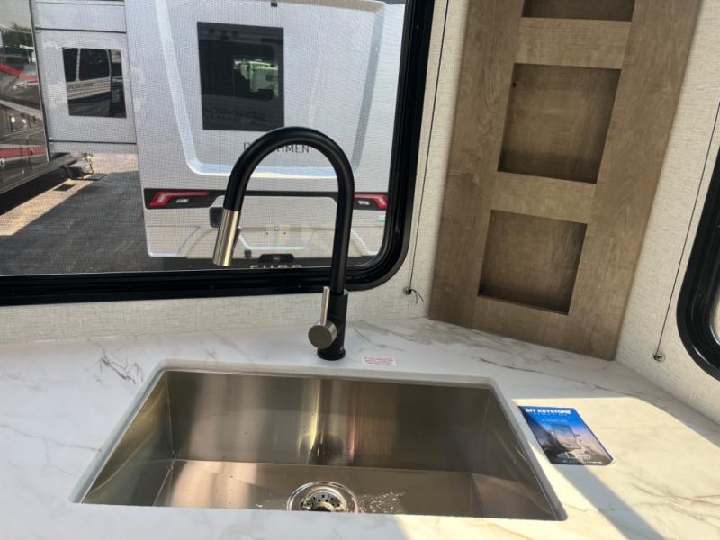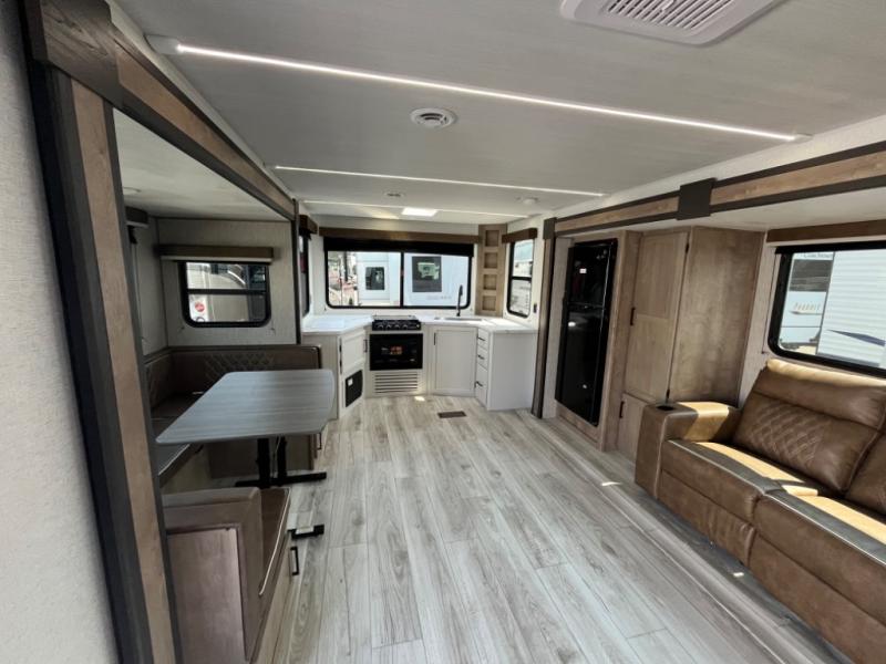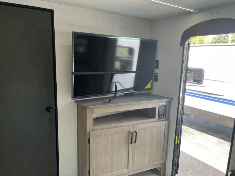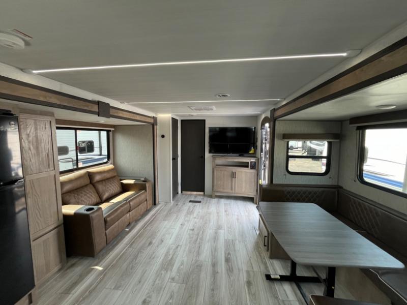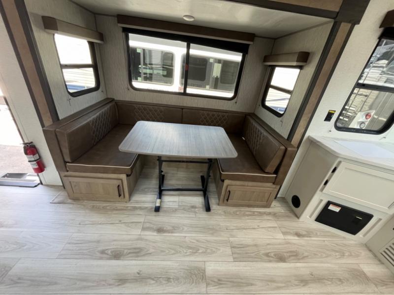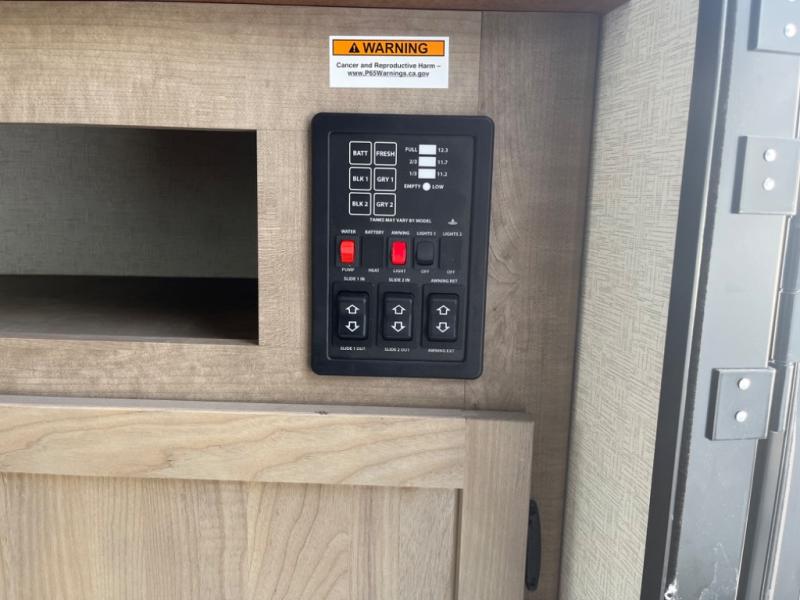 Enjoy all of your camping excursions in this rear kitchen, double slide unit. The rear kitchen features nice countertop space, plus a great view out the window in back. Dual slides opposite each other creates an open concept feel in this combined kitchen/living area featuring comfortable a sofa, a large U-shaped dinette, plus a corner entertainment center. There are also two pantries to hold all of your dry goods. Up front, you will appreciate the private bedroom featuring a queen bed with dual closets, overhead cabinets and a shelf for your things. The walk-through bath is spacious as it is the entire width of the unit and provides a nice shower, toilet, sink and closet. Outside, enjoy the 12' awning that offers added living space and a front pass-through storage compartment will easily house all of your outdoor camping gear.