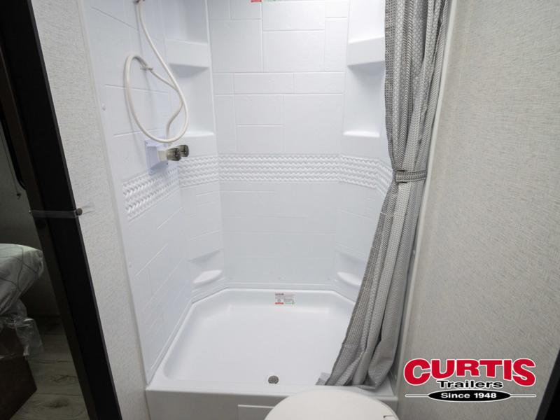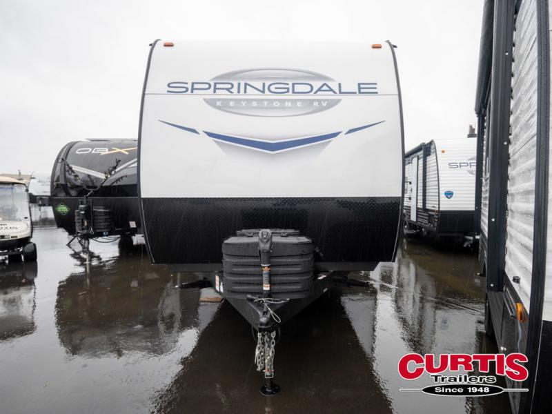 With any Springdale travel trailer by Keystone you will enjoy convenient amenities and comfortable camping features at every turn. The aluminum exterior will be easy to clean, and the power awning provides protection against the hot summer sun. There is also an exterior shower, a friction hinge entry door, and an XL entry assist handle to safely enter and exit the unit. You will find many comforts inside, including a stainless steel sink, ample storage space for your belongings, and cozy sleeping spaces. Start a new adventure today in a Springdale travel trailer!