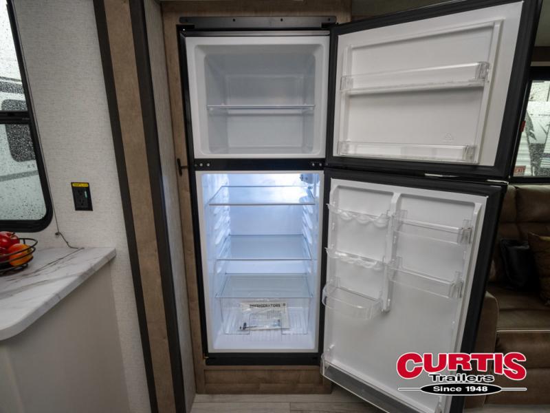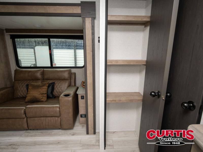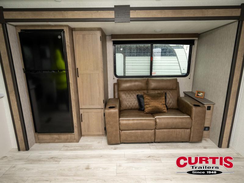 Enjoy all of your camping excursions in this rear kitchen, double slide unit. The rear kitchen features nice countertop space, plus a great view out the window in back. Dual slides opposite each other creates an open concept feel in this combined kitchen/living area featuring comfortable a sofa, a large U-shaped dinette, plus a corner entertainment center. There are also two pantries to hold all of your dry goods. Up front, you will appreciate the private bedroom featuring a queen bed with dual closets, overhead cabinets and a shelf for your things. The walk-through bath is spacious as it is the entire width of the unit and provides a nice shower, toilet, sink and closet. Outside, enjoy the 12' awning that offers added living space and a front pass-through storage compartment will easily house all of your outdoor camping gear.