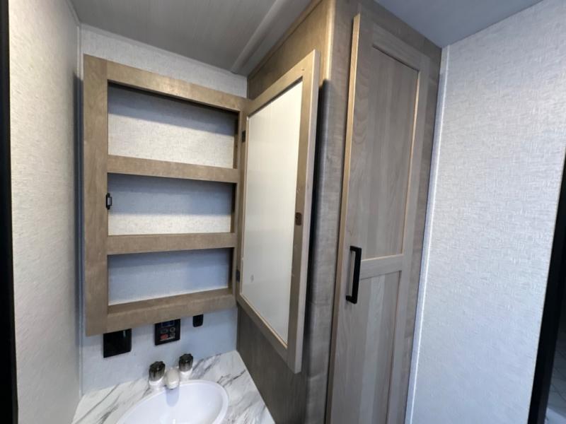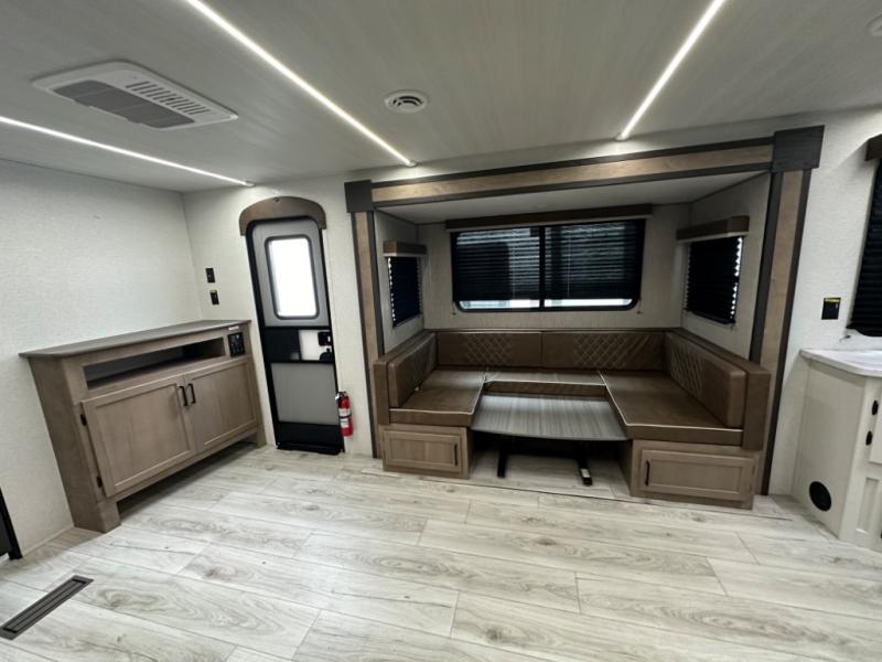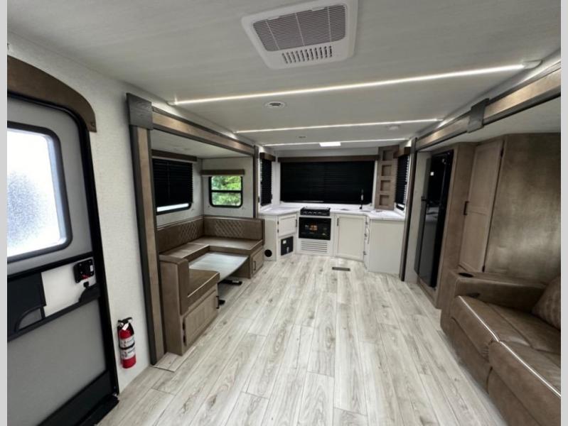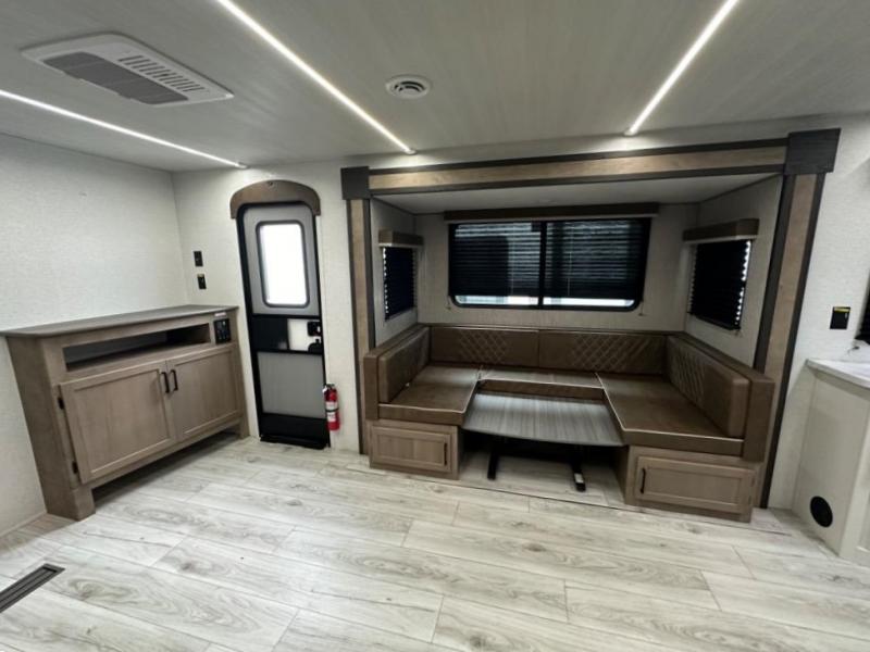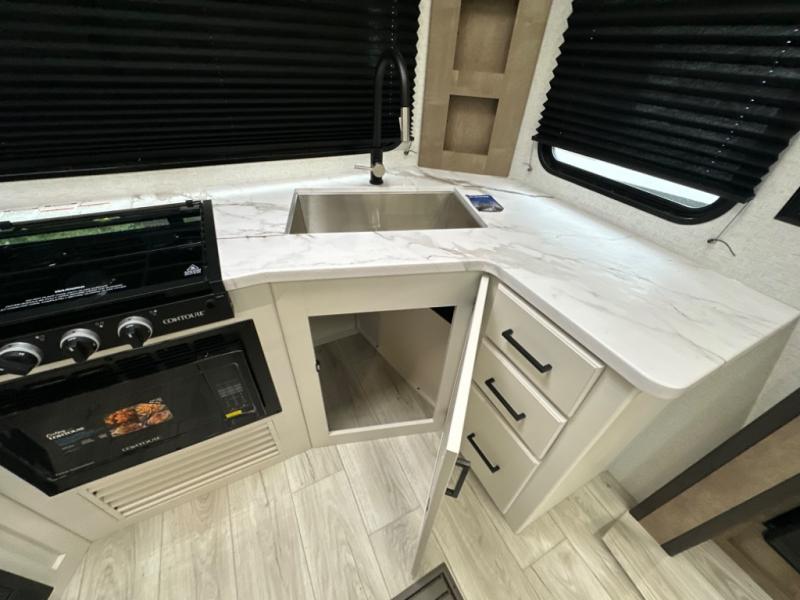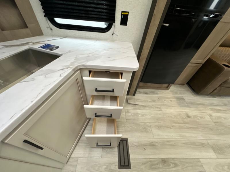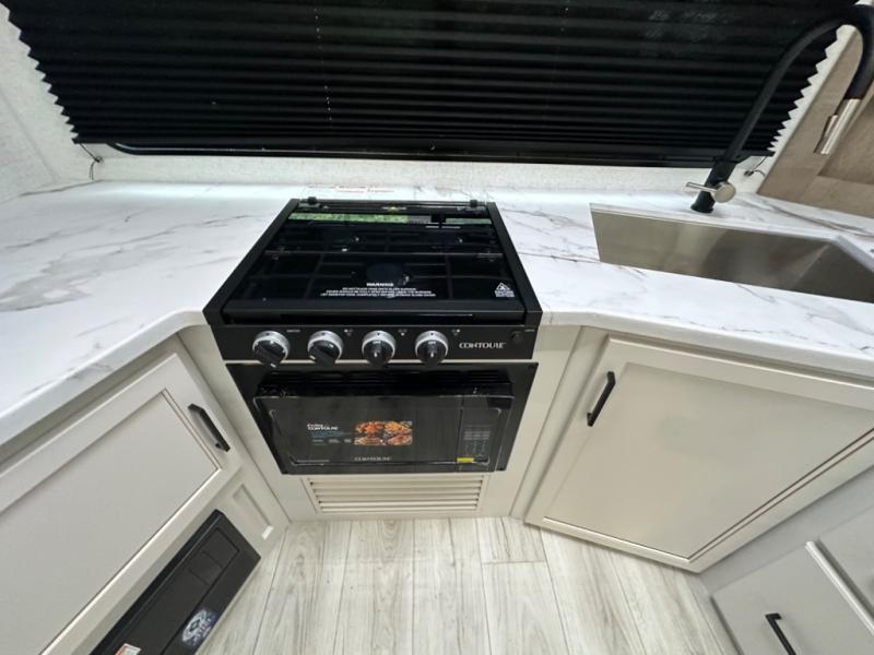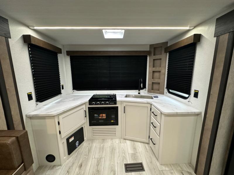 Rear Kitchen Design: The 281RK boasts a rear kitchen layout that offers plenty of counter space and all the appliances you need to cook up delicious meals wherever you go. Whether you're grilling outside or preparing a home-cooked meal inside, the kitchen is spacious and well-equipped to meet all your culinary needs.