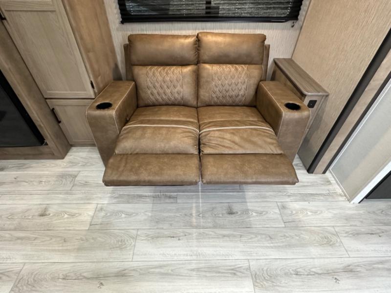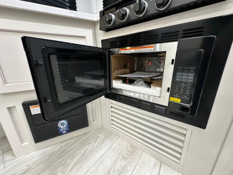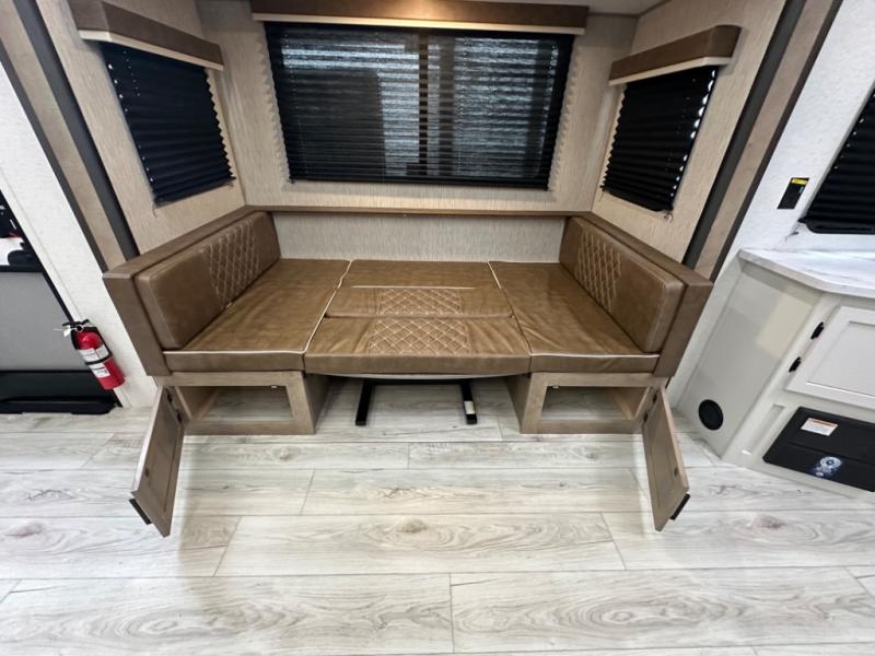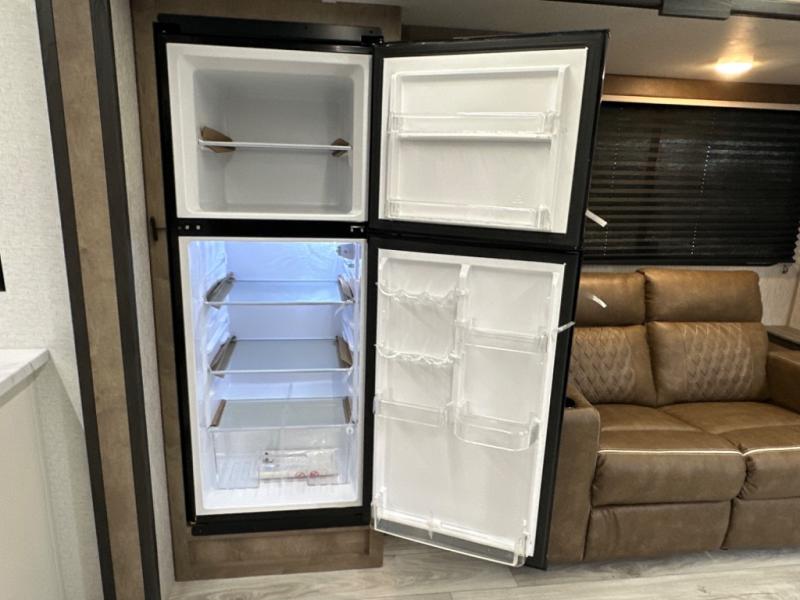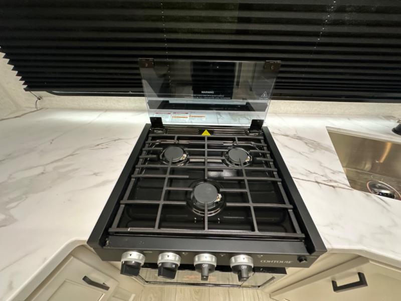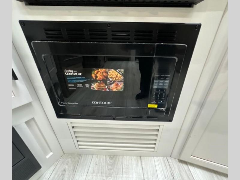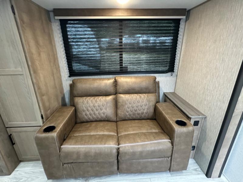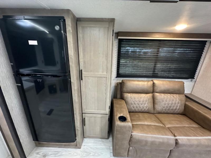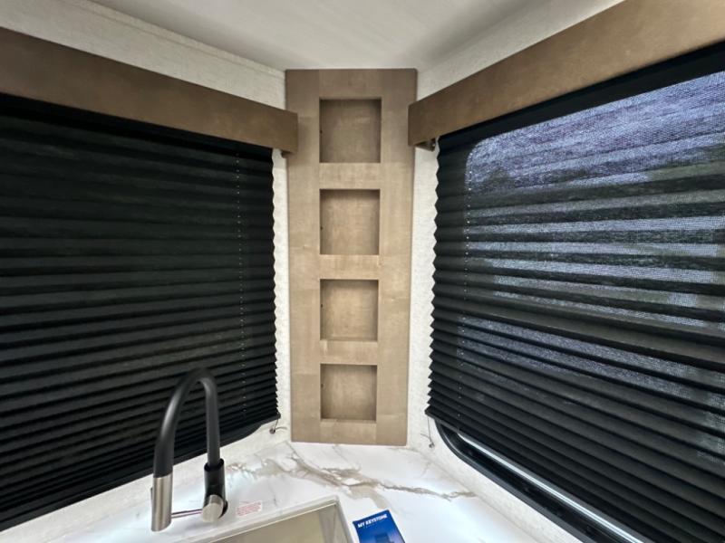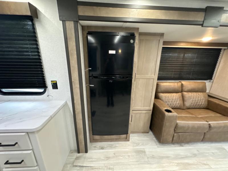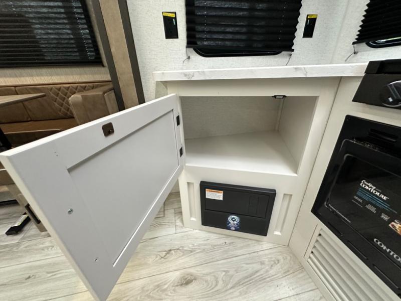 Spacious Living Area: Step inside and feel immediately at home with a wide-open living area. The generous floor plan is designed for relaxation, featuring a large slide-out that creates extra space for lounging with family and friends. The oversized windows invite natural light, creating a bright and airy atmosphere.