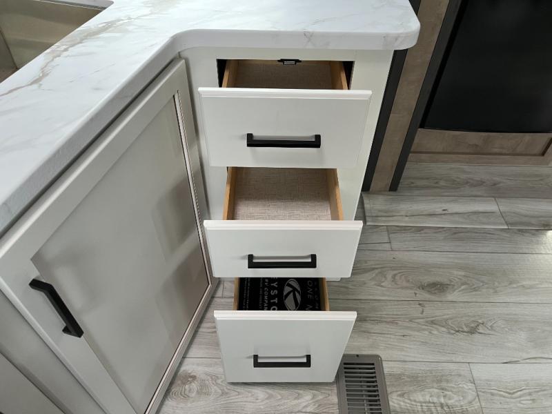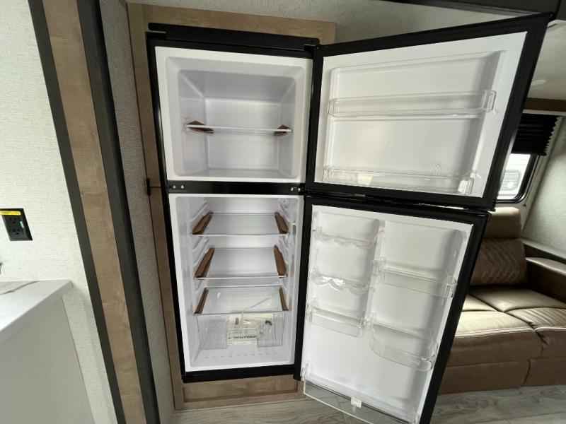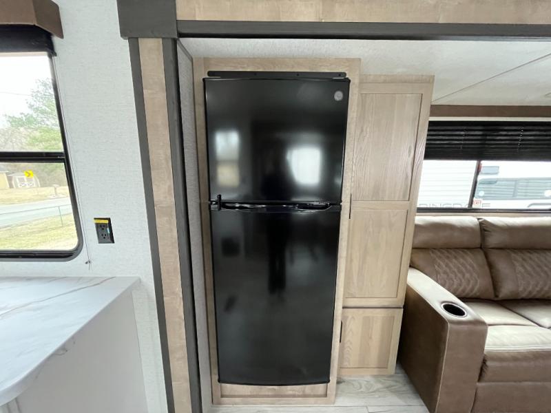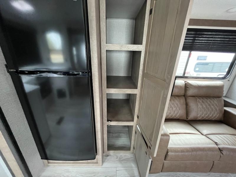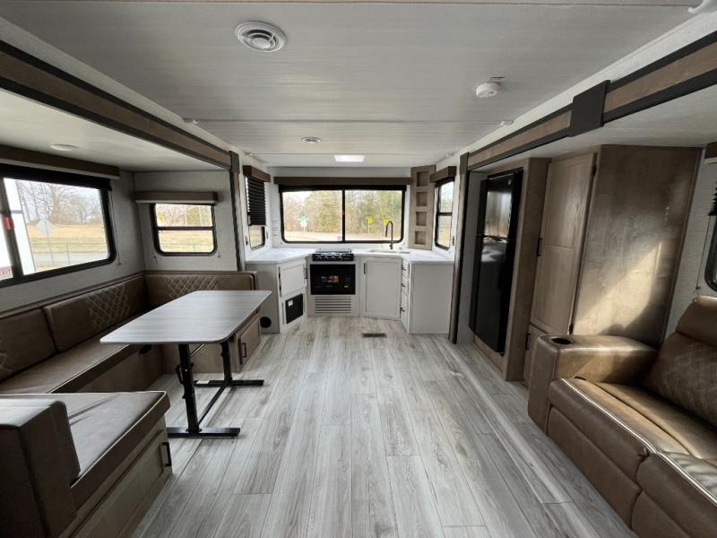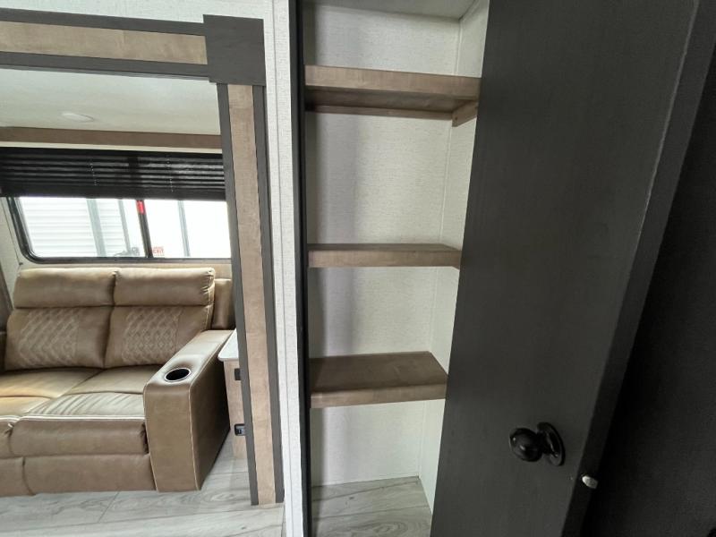 Enjoy all of your camping excursions in this rear kitchen, double slide unit. The rear kitchen features nice countertop space, plus a great view out the window in back. Dual slides opposite each other creates an open concept feel in this combined kitchen/living area featuring comfortable a sofa, a large U-shaped dinette, plus a corner entertainment center. There is also a pantry and closet for storage space. Up front, you will appreciate the private bedroom featuring a queen bed with dual closets, overhead cabinets and a shelf for your things. The walk-through bath is spacious as it is the entire width of the unit and provides a nice shower, toilet, sink and closet. Outside, enjoy the 12' power awning that offers added living space and a front pass-through storage compartment will easily house all of your outdoor camping gear.