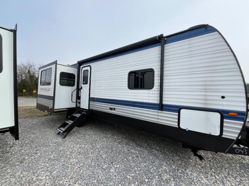 With any Springdale travel trailer by Keystone you will enjoy convenient amenities and comfortable camping features at every turn. The aluminum exterior will be easy to clean, and the power awning provides protection against the hot summer sun. There is also an exterior shower, a walkable roof, and an XL entry assist handle to safely enter and exit the unit. You will find many comforts inside, including a stainless steel sink, ample storage space for your belongings, and cozy sleeping spaces. Start a new adventure today in a Springdale travel trailer!