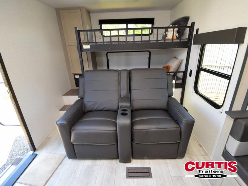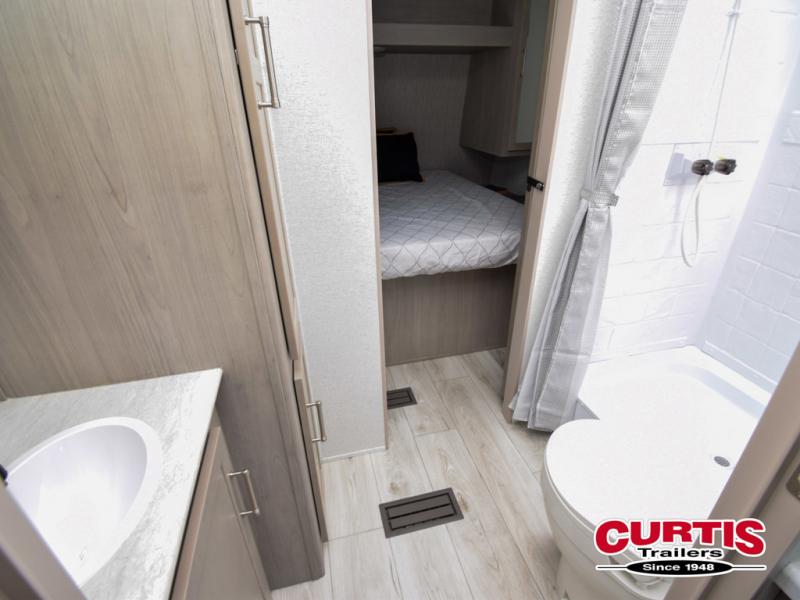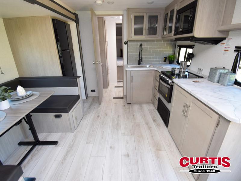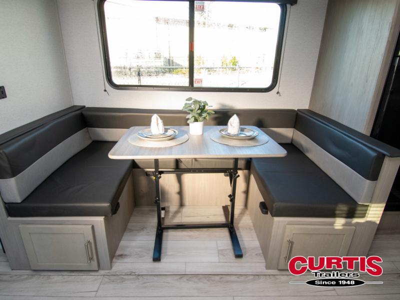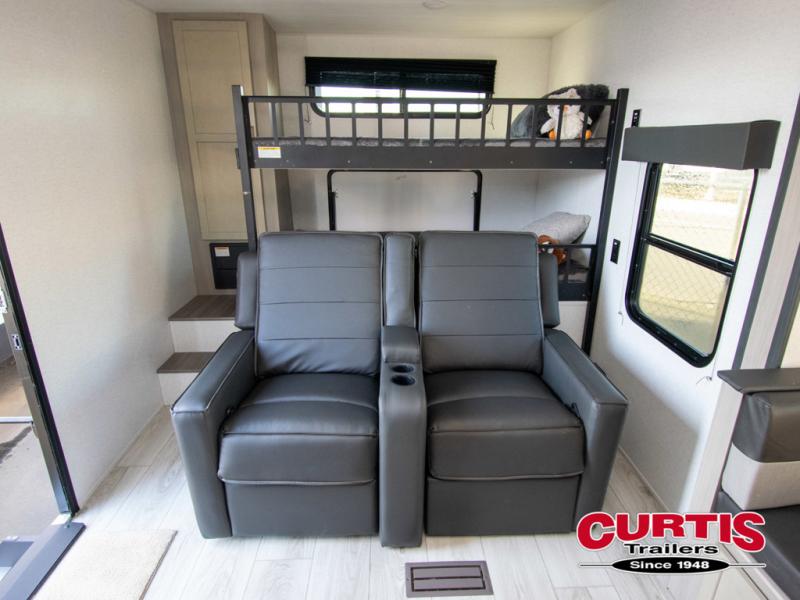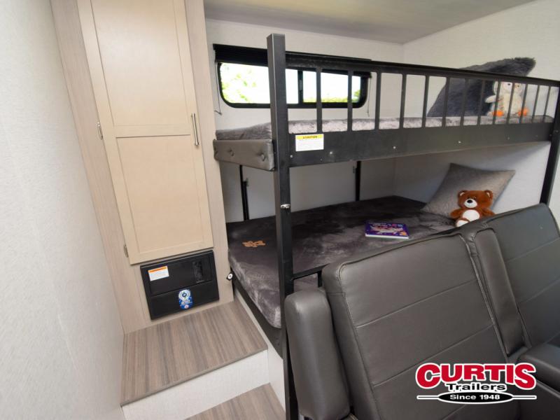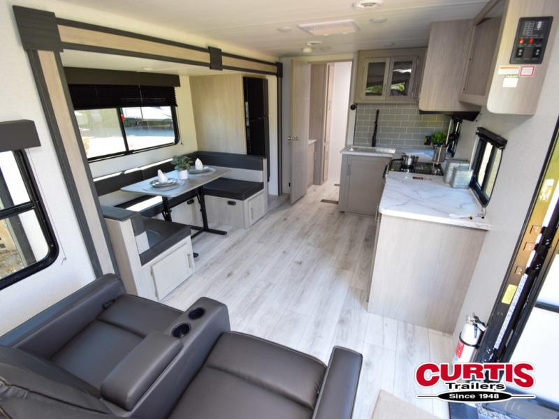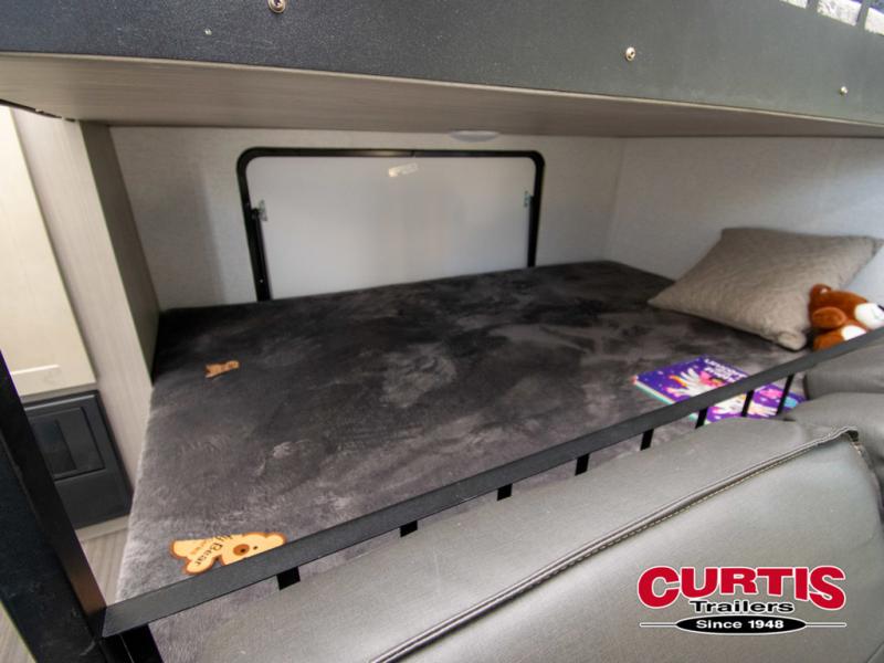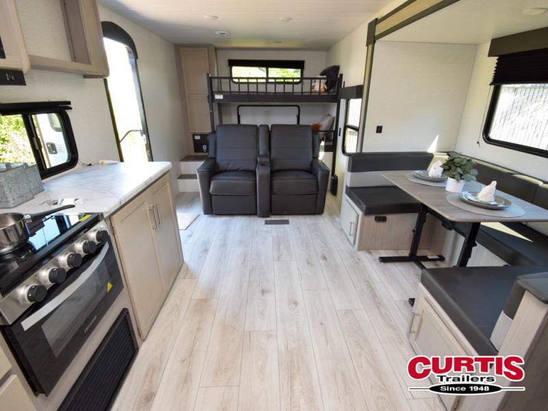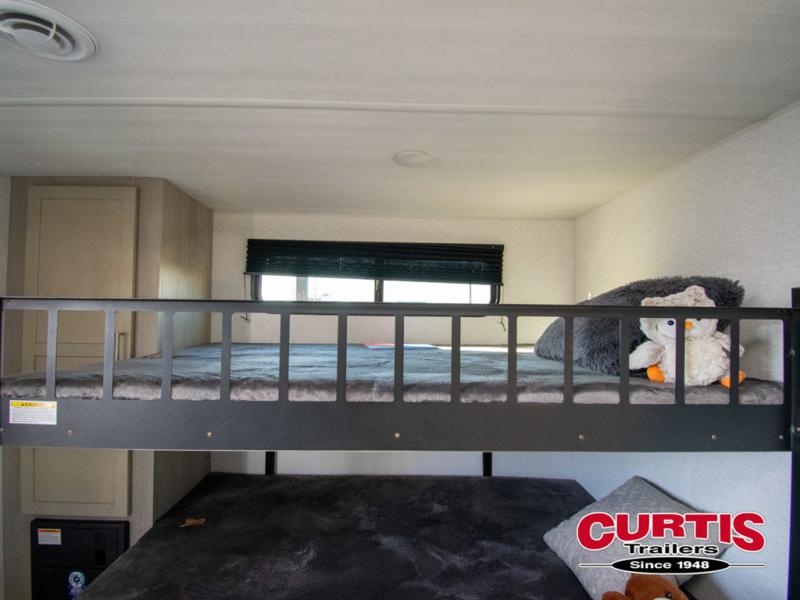 Thanks to the large slide in this travel trailer, you'll have plenty of space to stretch out and relax. There is a U-shape dinette where you can dine together or play a game of cards after dinner. Your guests or the kids will have bunk beds with a flip-up bunk to easily store belongings on the way home. Whip up your meals in the full kitchen with a three burner cooktop, and leftovers can go in the 10 cu. ft. refrigerator. This model also features a walk-through bath that will create a front master bedroom you are sure to love. Here, you'll find a walk-around queen bed, dual closets and nightstands, plus one of the dual entry doors!