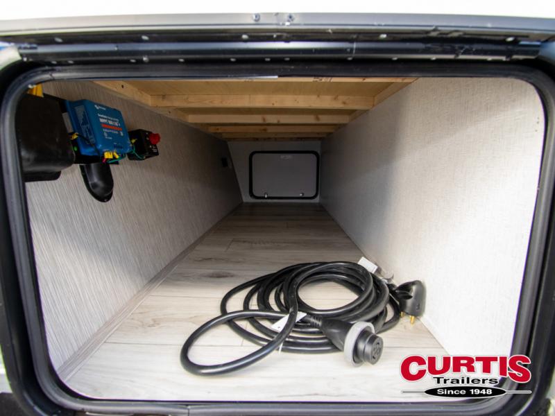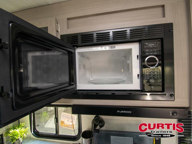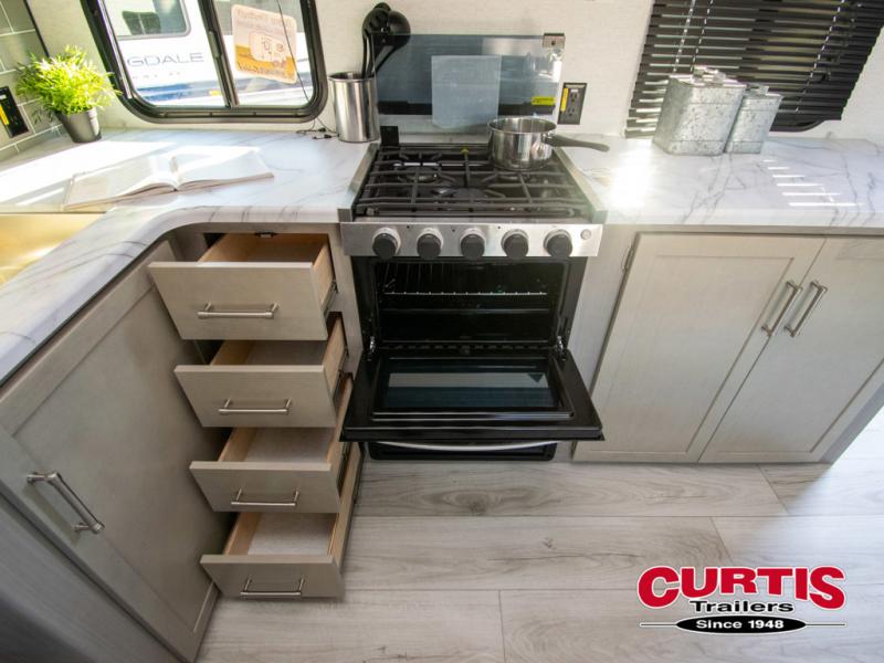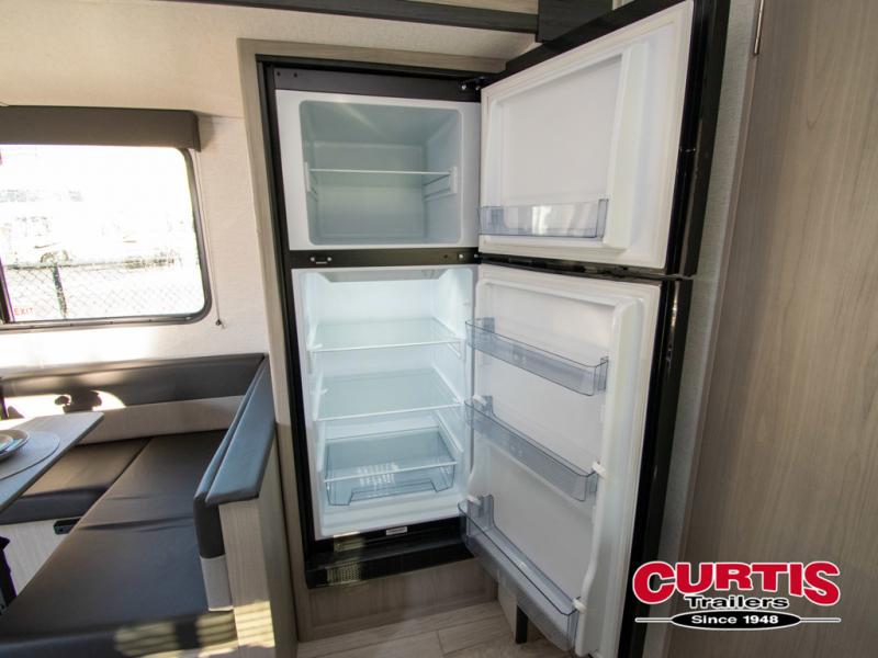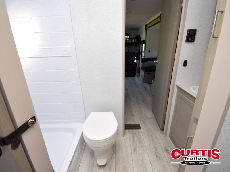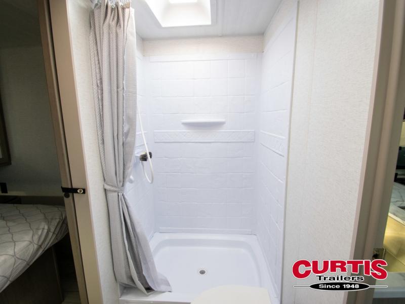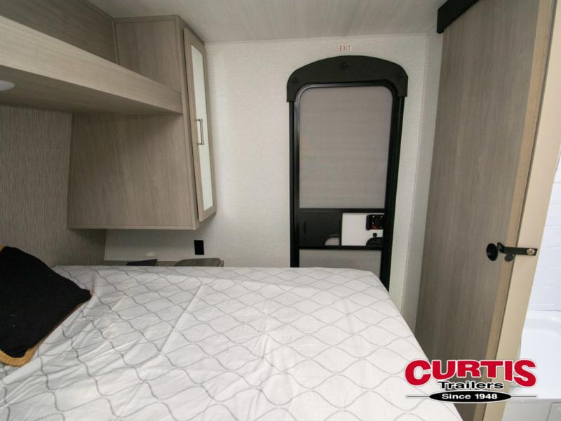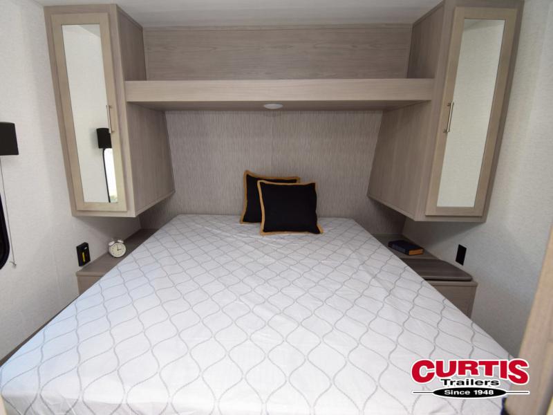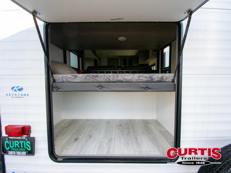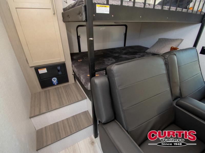 Thanks to the large slide in this travel trailer, you'll have plenty of space to stretch out and relax. There is a U-shape dinette where you can dine together or play a game of cards after dinner. Your guests or the kids will have bunk beds with a flip-up bunk to easily store belongings on the way home. Whip up your meals in the full kitchen with a three burner cooktop, and leftovers can go in the 10 cu. ft. refrigerator. This model also features a walk-through bath that will create a front master bedroom you are sure to love. Here, you'll find a walk-around queen bed, dual closets and nightstands, plus one of the dual entry doors!