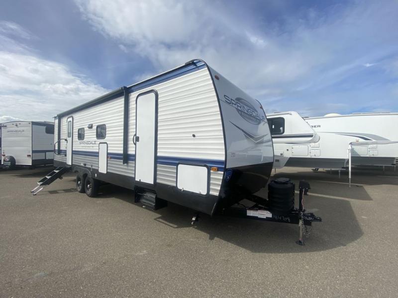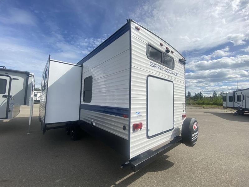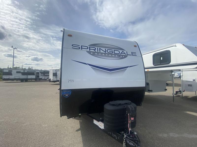 With any Springdale travel trailer by Keystone you will enjoy convenient amenities and comfortable camping features at every turn. The aluminum exterior will be easy to clean, and the power awning provides protection against the hot summer sun. There is also an exterior shower, a walkable roof, and an XL entry assist handle to safely enter and exit the unit. You will find many comforts inside, including a stainless steel sink, ample storage space for your belongings, and cozy sleeping spaces. Start a new adventure today in a Springdale travel trailer!