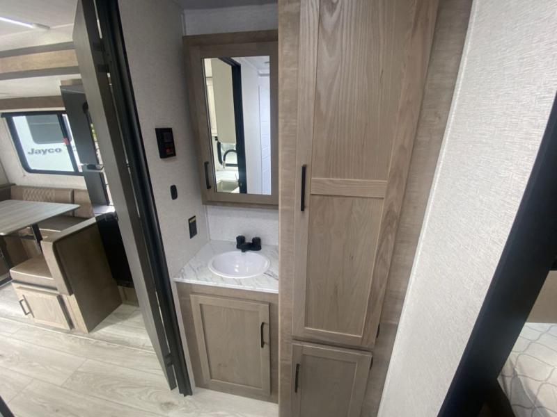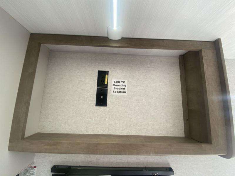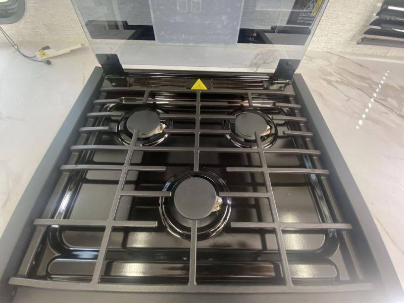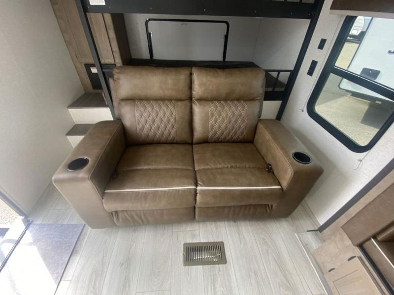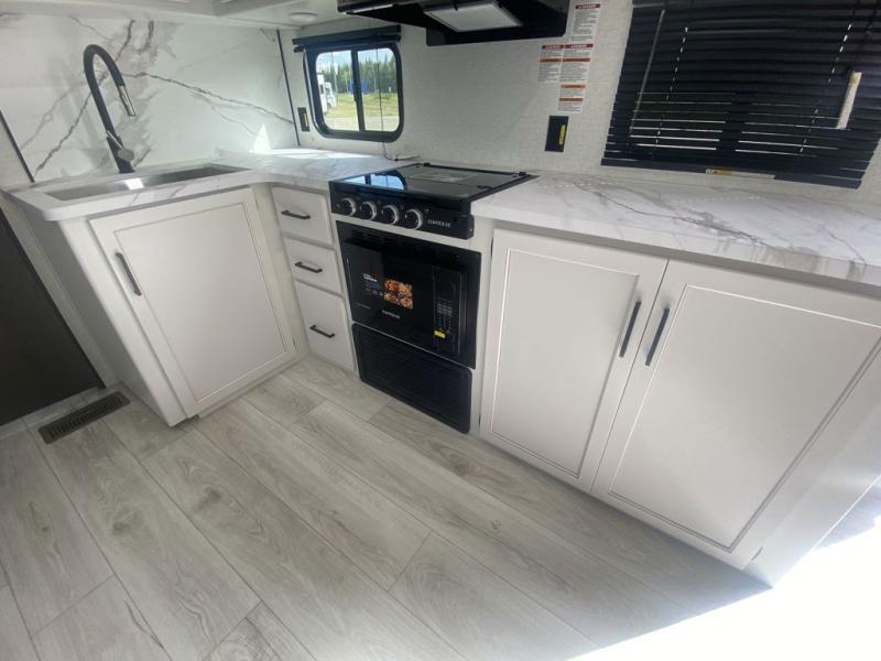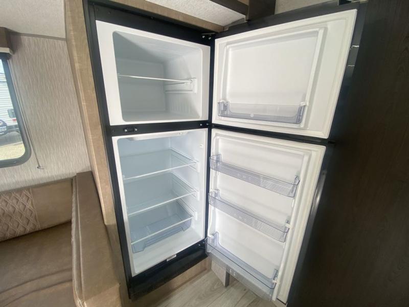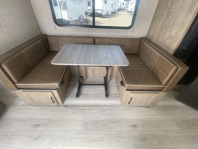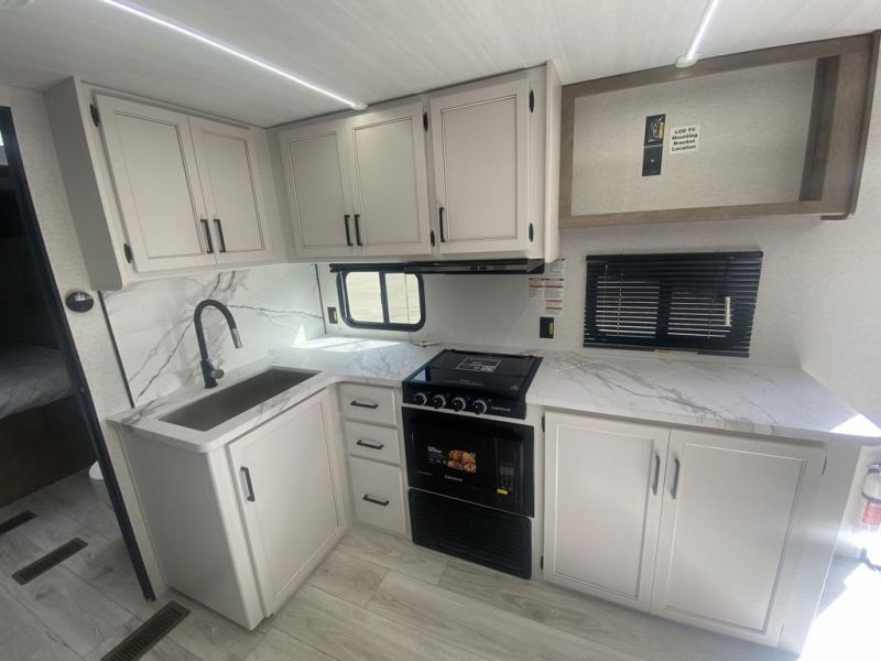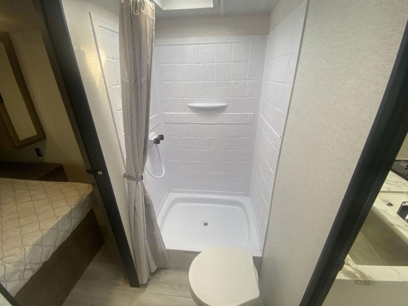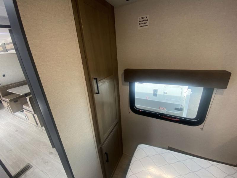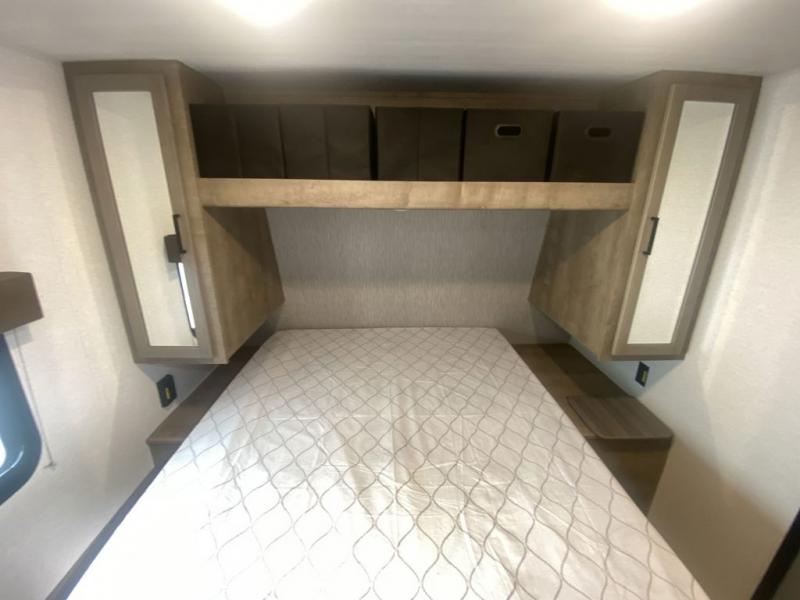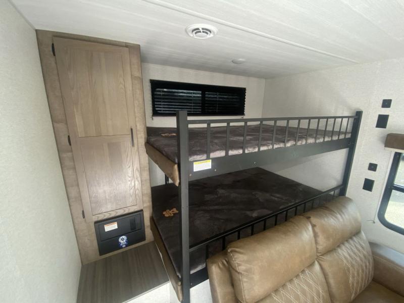 Thanks to the large slide in this travel trailer, you'll have plenty of space to stretch out and relax. There is a U-shape dinette where you can dine together or play a game of cards after dinner. Your guests or the kids will have bunk beds with a flip-up bunk to easily store belongings on the way home. Whip up your meals in the full kitchen with a three burner cooktop, and leftovers can go in the 10 cu. ft. refrigerator. This model also features a walk-through bath that will create a front master bedroom you are sure to love. Here, you'll find a walk-around queen bed, dual closets and nightstands, plus one of the dual entry doors!