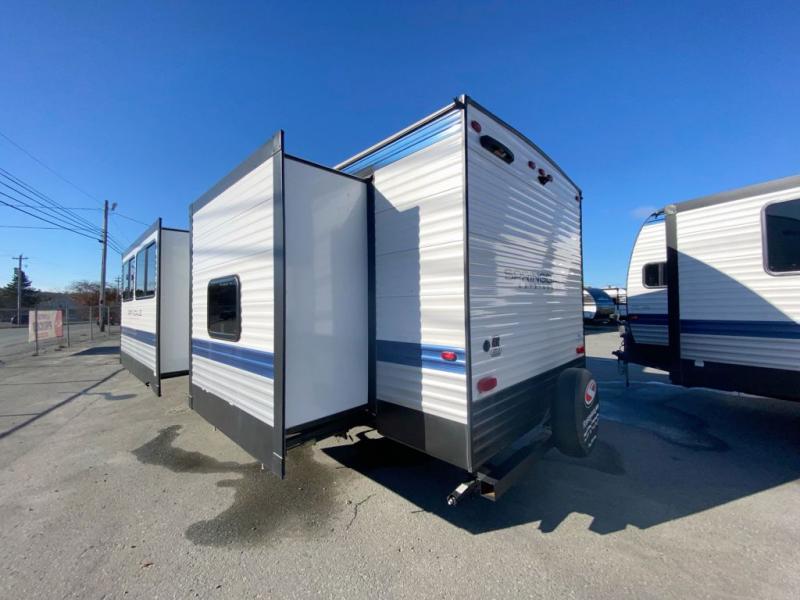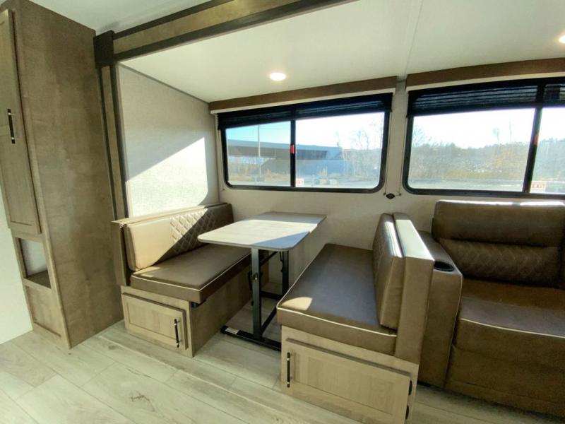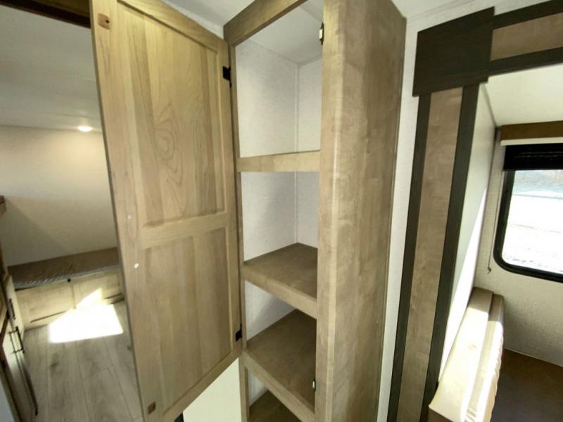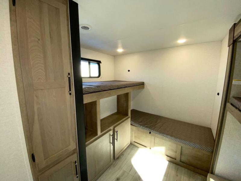 If you enjoy camping with larger groups, this travel trailer is for you! Once you arrive at the campsite, grab your gear from the pass-through storage, put out the 18' awning, then grab a cold drink from the outdoor refrigerator. There is also an outdoor sink to wash up! The main living area includes a large slide out where you can relax on the tri-fold sofa or booth dinette, and there is an entertainment center with TV prep if you want the option to watch movies at night. Your guests will love the rear private bunkhouse with a flip-up bed, two bunks, and a toy chest if this room is for littles ones. You will find the front private bedroom to be accommodating with its queen bed, dual nightstands and closets, plus a convenient laundry chute. There is even a full bath with its own exterior entry door!