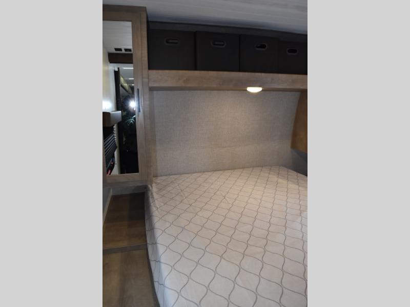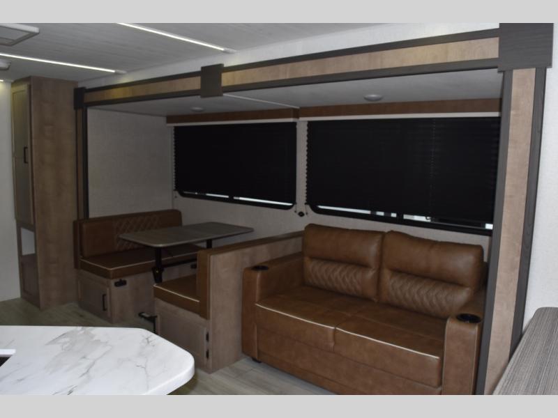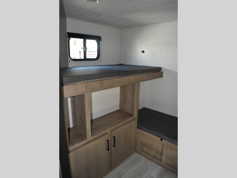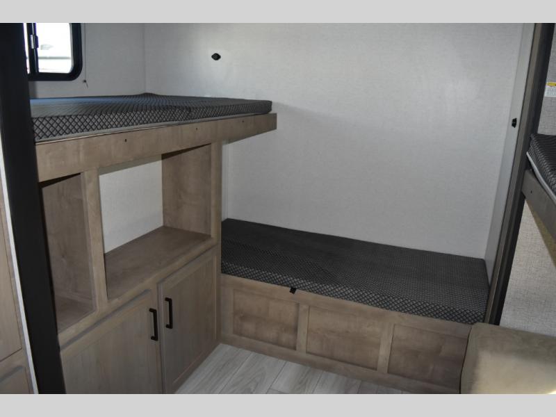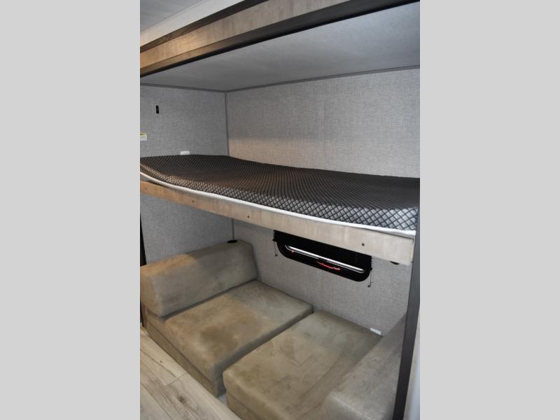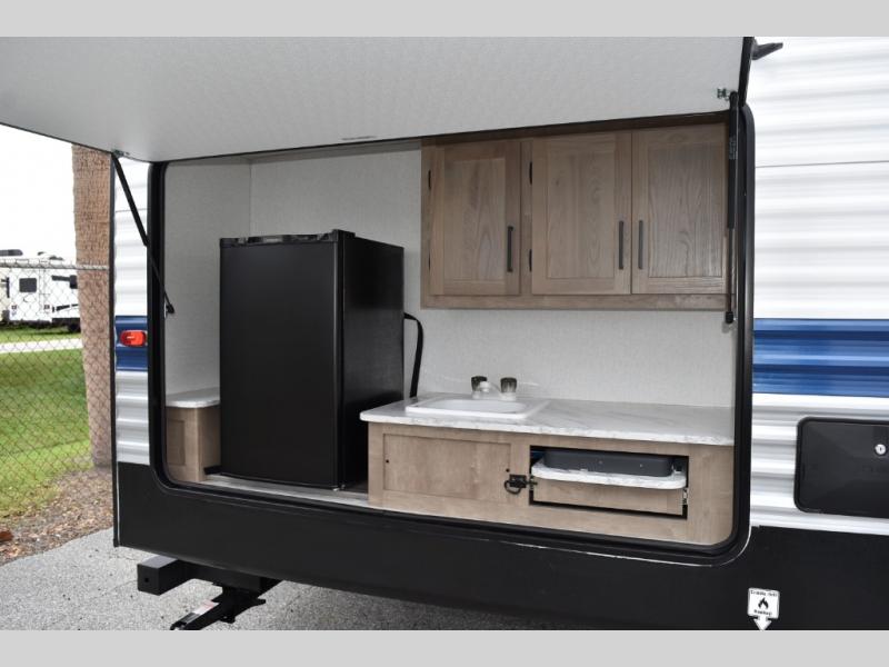 If you enjoy camping with larger groups, this travel trailer is for you! Once you arrive at the campsite, grab your gear from the pass-through storage, put out the 18' awning, then grab a cold drink from the outdoor refrigerator. There is also an outdoor sink to wash up! The main living area includes a large slide out where you can relax on the tri-fold sofa or booth dinette, and there is an entertainment center with TV prep if you want the option to watch movies at night. Your guests will love the rear private bunkhouse with a flip-up bed, two bunks, and a toy chest if this room is for littles ones. You will find the front private bedroom to be accommodating with its queen bed, dual nightstands and closets, plus a convenient laundry chute. There is even a full bath with its own exterior entry door!