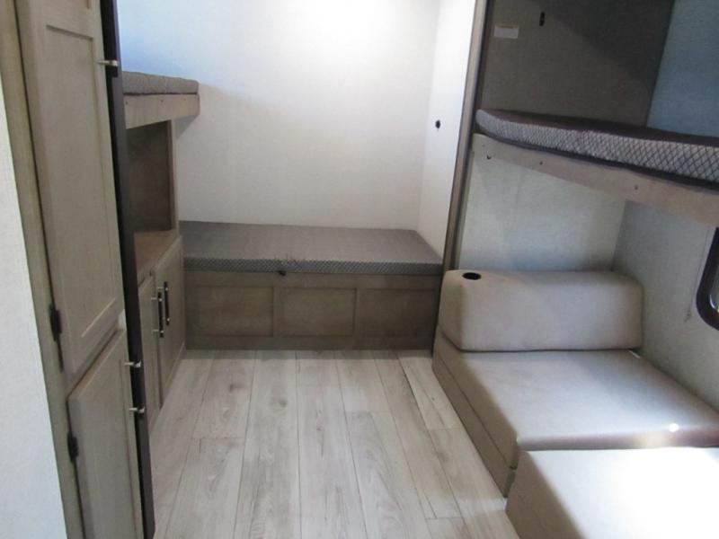Rear bunkhouse with flip-up bed, two bunks, and toy chest for kids or guests