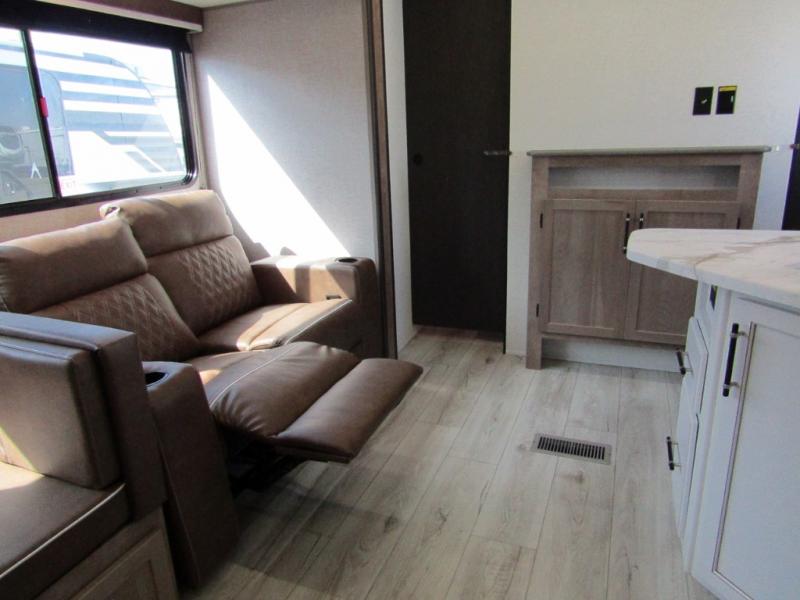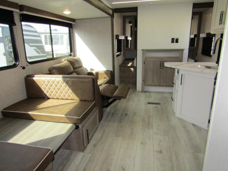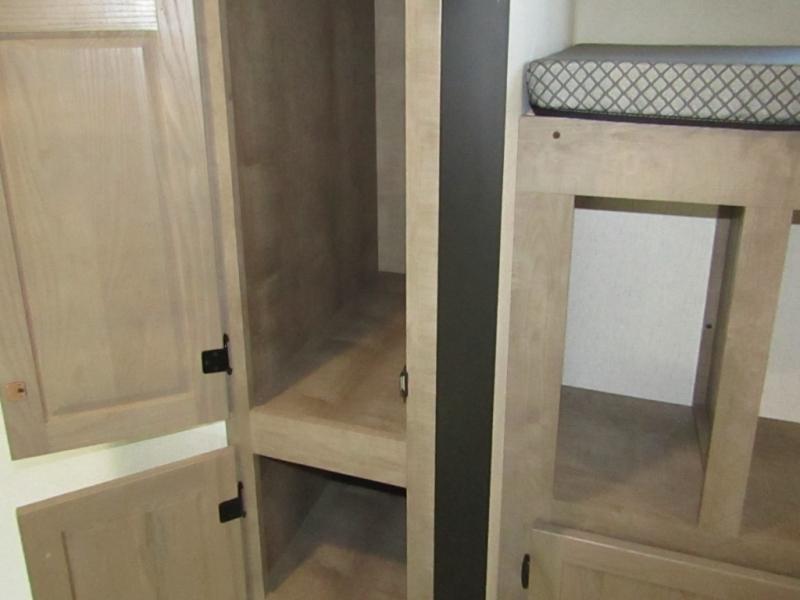 Inside, the 310BR offers a front private bedroom with queen bed, dual nightstands, and closets, while the rear bunkhouse provides a flip-up bed, two bunks, and a toy chest for kids or extra guests. The main living area features a large double slide with theater seating, tri-fold sofa, and booth dinette, along with an entertainment center with TV prep for movie nights. The full kitchen includes a 12V refrigerator (10 cf), premium finishes, and plenty of storage, making meal prep easy. Enjoy a full bath with exterior entry for convenience, and with Solar Flex Protect, 50 AMP Service, and a 2nd A/C included, this trailer is ready for extended stays and off-grid adventures. Outside, the outdoor kitchen, pass-through storage, and 18’ power awning extend your living space and enhance your campsite experience.