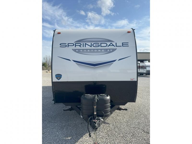 With any Springdale travel trailer by Keystone you will enjoy convenient amenities and comfortable camping features at every turn. The aluminum exterior will be easy to clean, and the power awning provides protection against the hot summer sun. There is also an exterior shower, a walkable roof, and an XL entry assist handle to safely enter and exit the unit. You will find many comforts inside, including a stainless steel sink, ample storage space for your belongings, and cozy sleeping spaces. Start a new adventure today in a Springdale travel trailer!