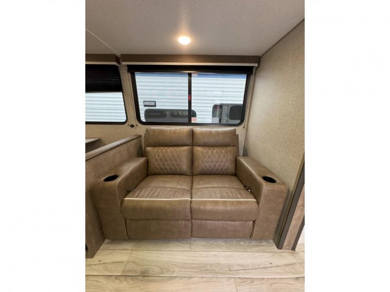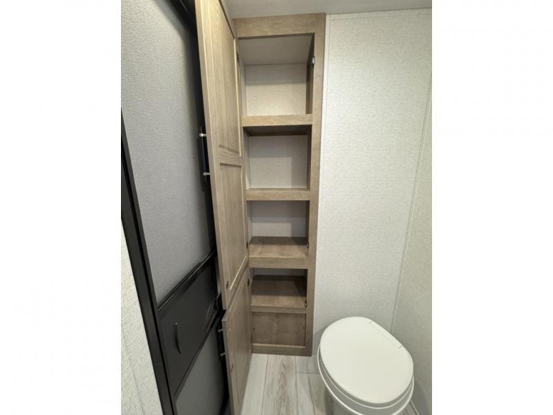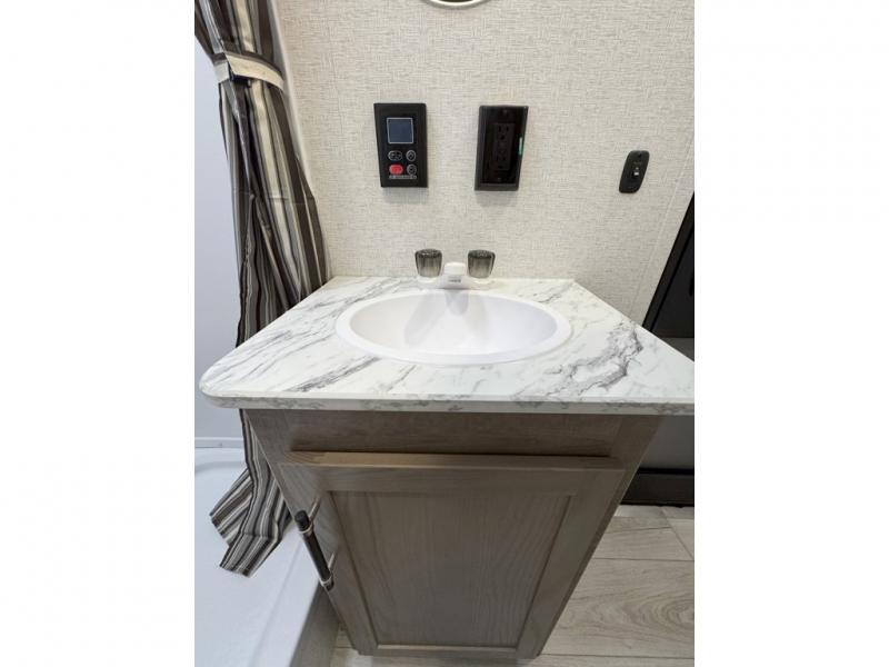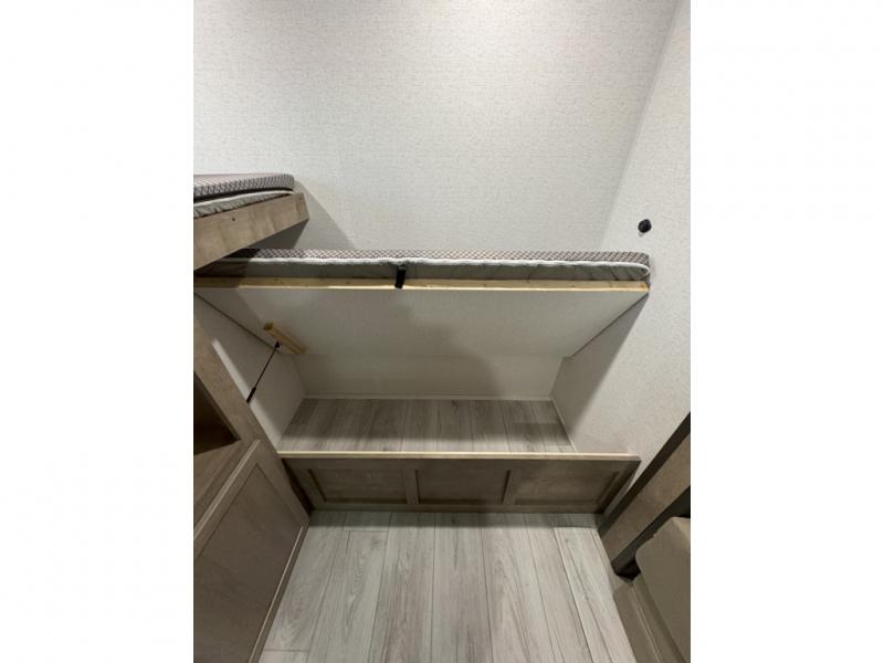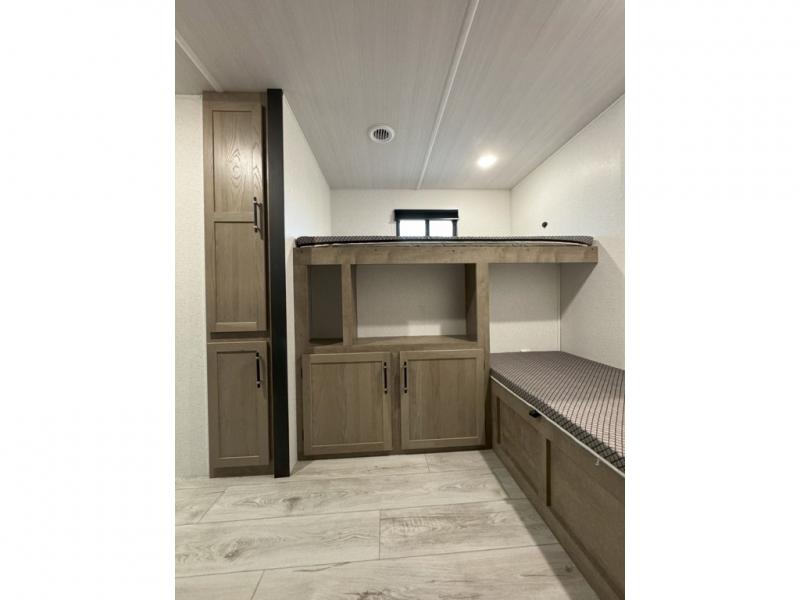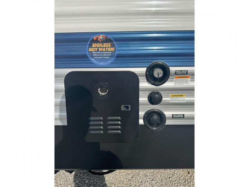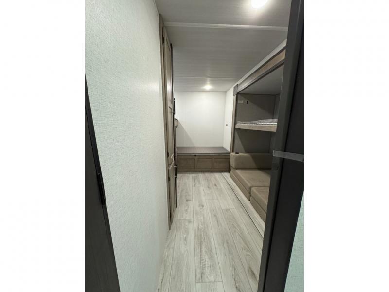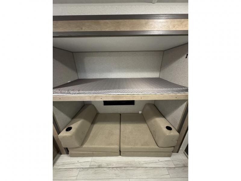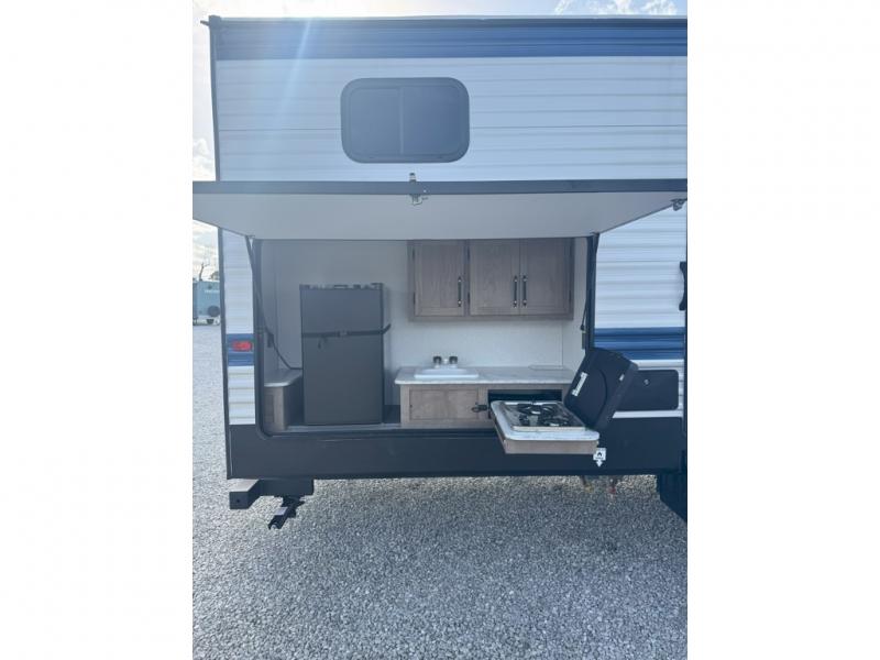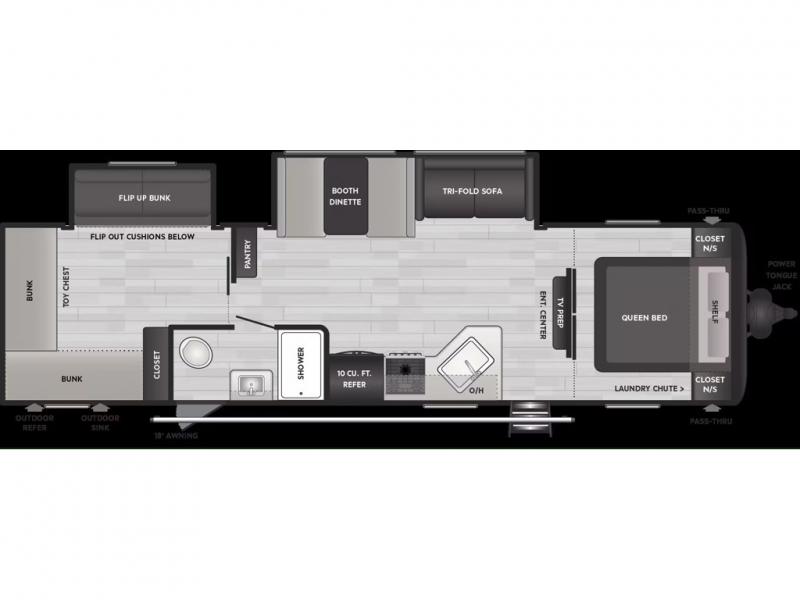 If you enjoy camping with larger groups, this travel trailer is for you! Once you arrive at the campsite, grab your gear from the pass-through storage, put out the 18' awning, then grab a cold drink from the outdoor refrigerator. There is also an outdoor sink to wash up! The main living area includes a large slide out where you can relax on the tri-fold sofa or booth dinette, and there is an entertainment center with TV prep if you want the option to watch movies at night. Your guests will love the rear private bunkhouse with a flip-up bed, two bunks, and a toy chest if this room is for littles ones. You will find the front private bedroom to be accommodating with its queen bed, dual nightstands and closets, plus a convenient laundry chute. There is even a full bath with its own exterior entry door!