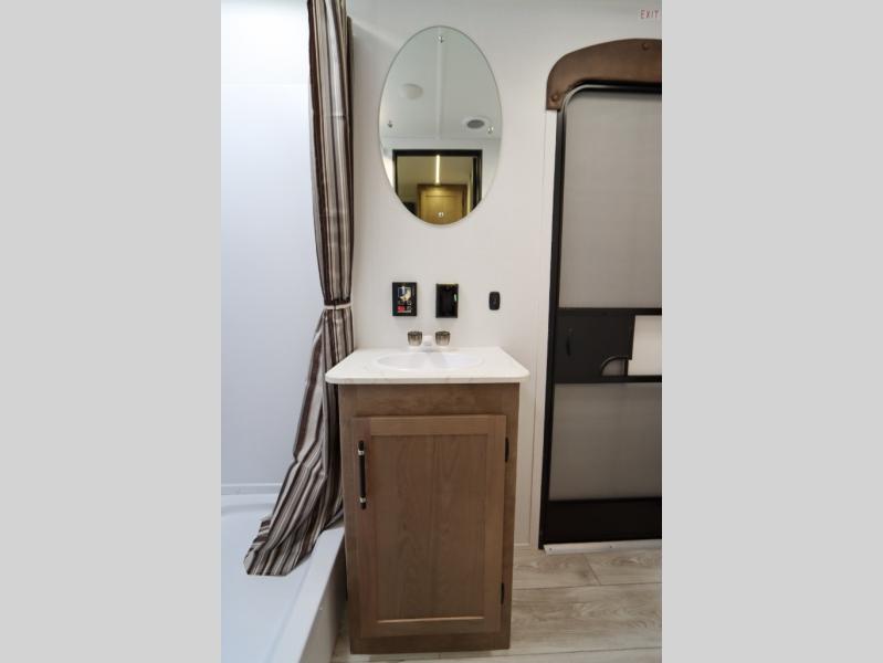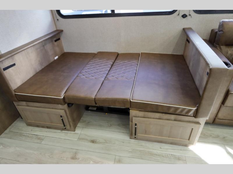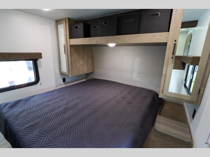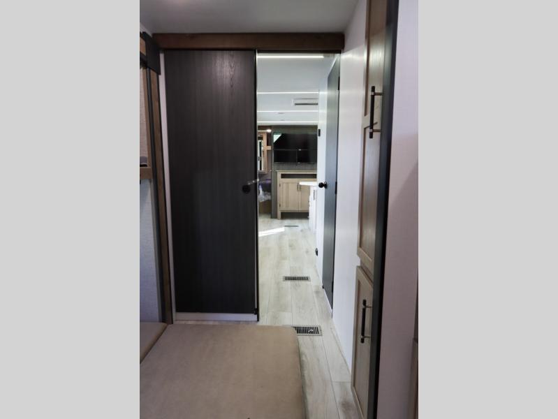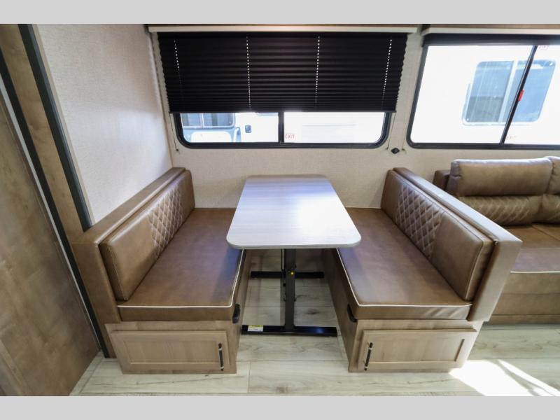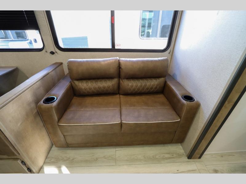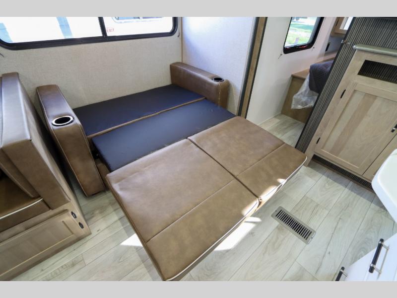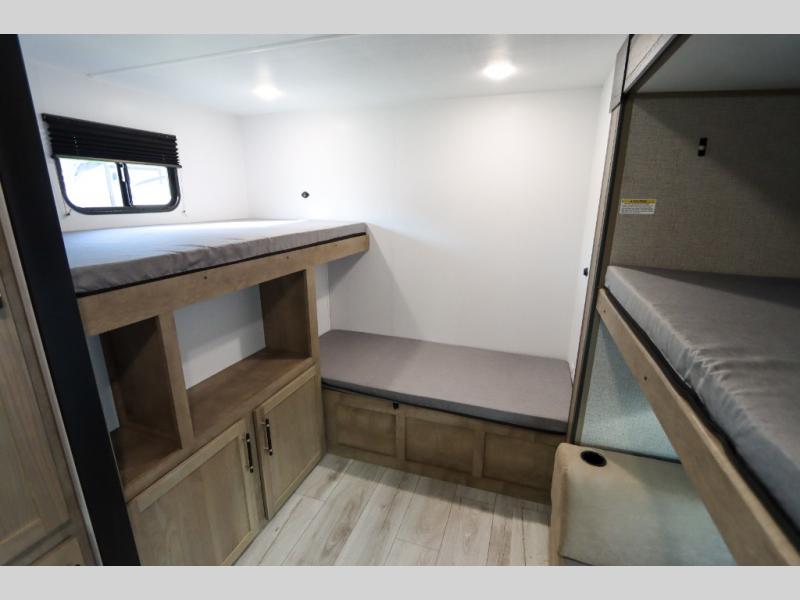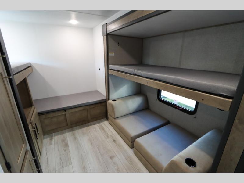 If you enjoy camping with larger groups, this travel trailer is for you! Once you arrive at the campsite, grab your gear from the pass-through storage, put out the 18' awning, then grab a cold drink from the outdoor refrigerator. There is also an outdoor sink to wash up! The main living area includes a large slide out where you can relax on the tri-fold sofa or booth dinette, and there is an entertainment center with TV prep if you want the option to watch movies at night. Your guests will love the rear private bunkhouse with a flip-up bed, two bunks, and a toy chest if this room is for littles ones. You will find the front private bedroom to be accommodating with its queen bed, dual nightstands and closets, plus a convenient laundry chute. There is even a full bath with its own exterior entry door!