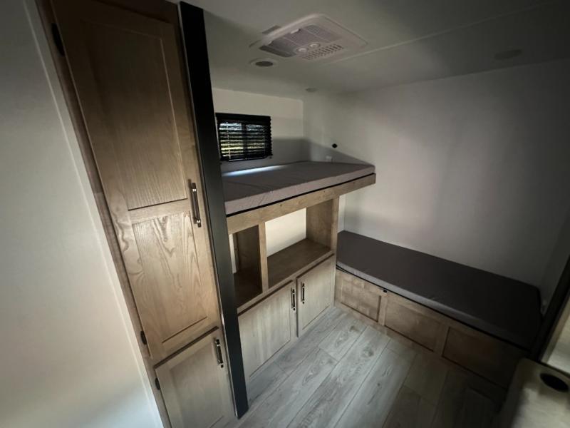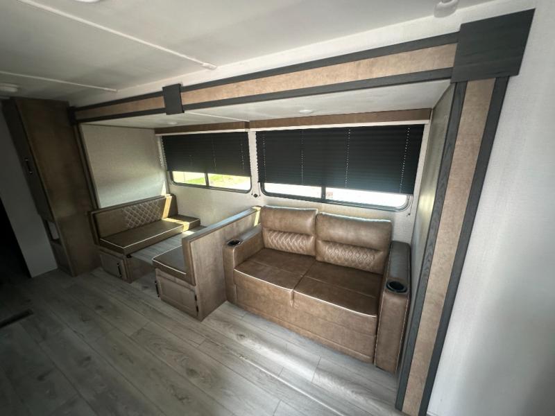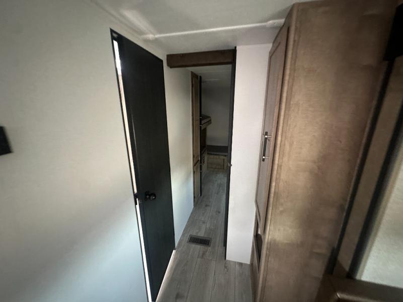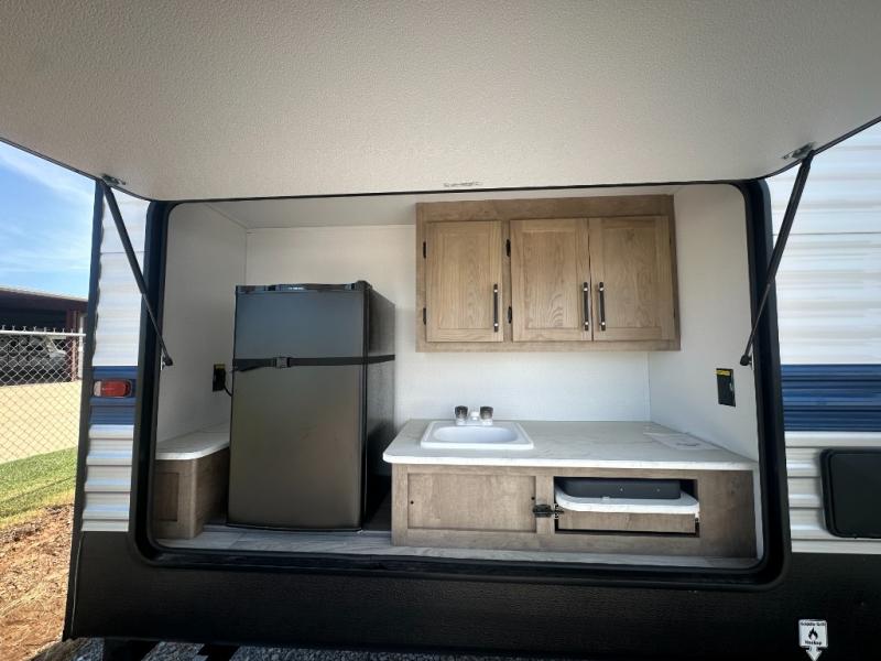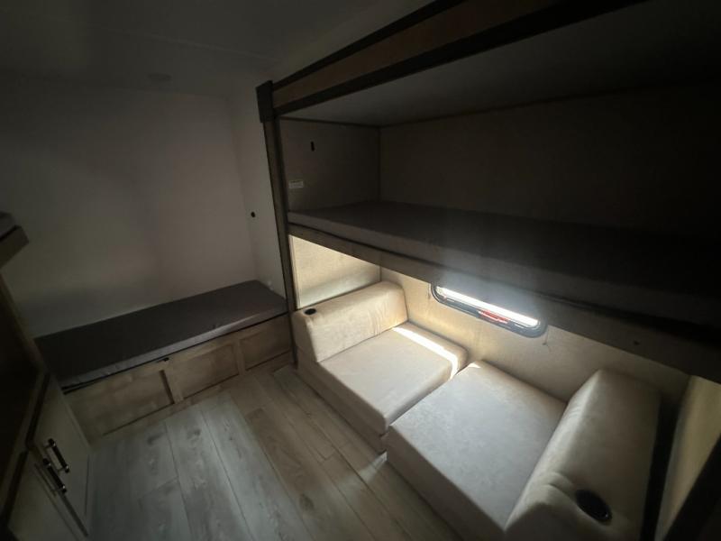 If you enjoy camping with larger groups, this travel trailer is for you! Once you arrive at the campsite, grab your gear from the pass-through storage, put out the 18' awning, then grab a cold drink from the outdoor refrigerator. There is also an outdoor sink to wash up! The main living area includes a large slide out where you can relax on the tri-fold sofa or booth dinette, and there is an entertainment center with TV prep if you want the option to watch movies at night. Your guests will love the rear private bunkhouse with a flip-up bed, two bunks, and a toy chest if this room is for littles ones. You will find the front private bedroom to be accommodating with its queen bed, dual nightstands and closets, plus a convenient laundry chute. There is even a full bath with its own exterior entry door!