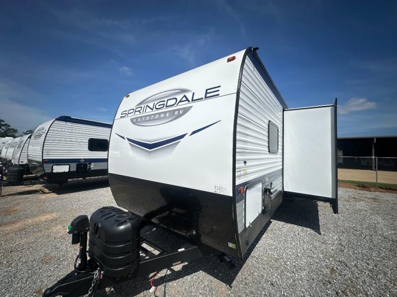 With any Springdale travel trailer by Keystone you will enjoy convenient amenities and comfortable camping features at every turn. The aluminum exterior will be easy to clean, and the power awning provides protection against the hot summer sun. There is also an exterior shower, a walkable roof, and an XL entry assist handle to safely enter and exit the unit. You will find many comforts inside, including a stainless steel sink, ample storage space for your belongings, and cozy sleeping spaces. Start a new adventure today in a Springdale travel trailer!