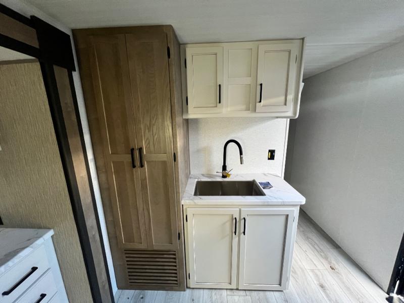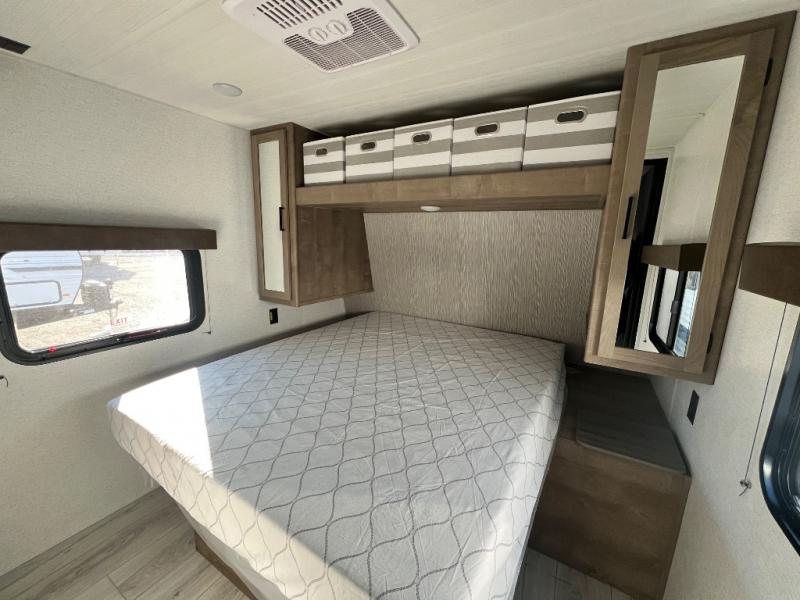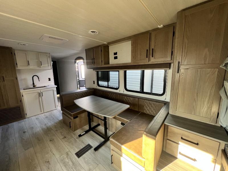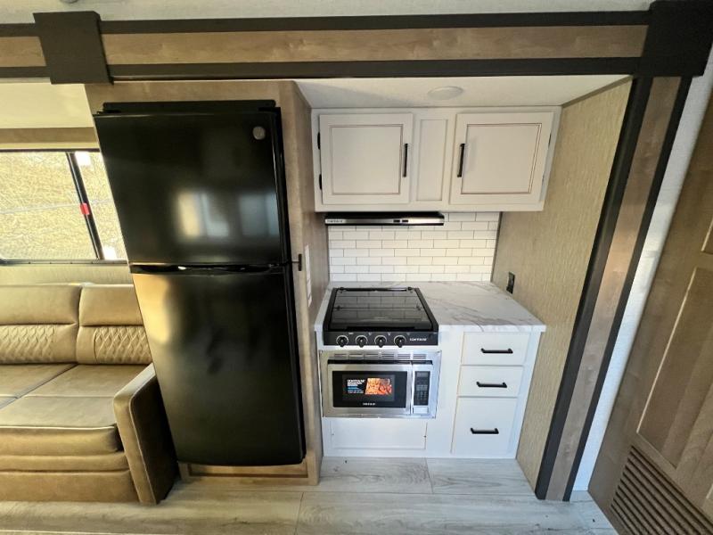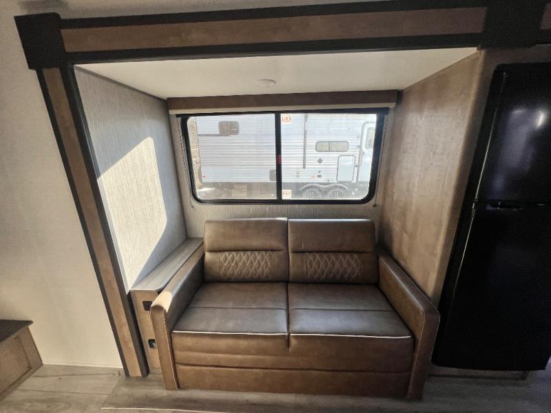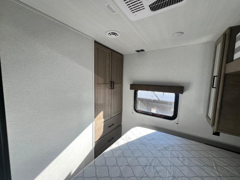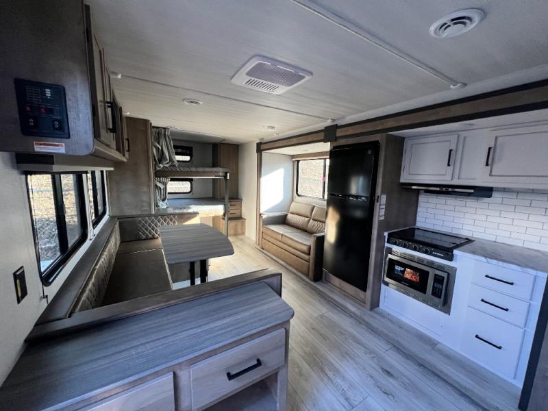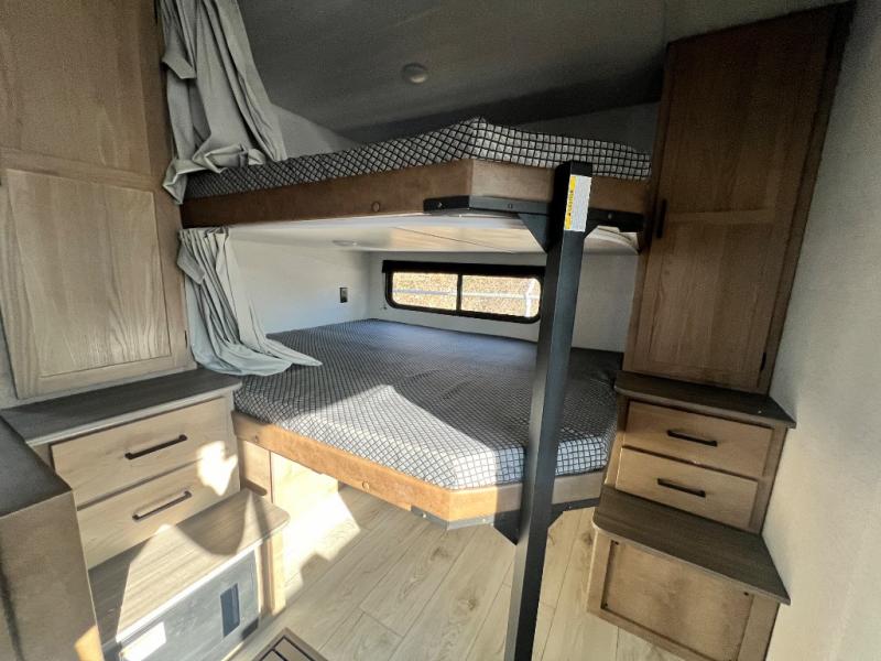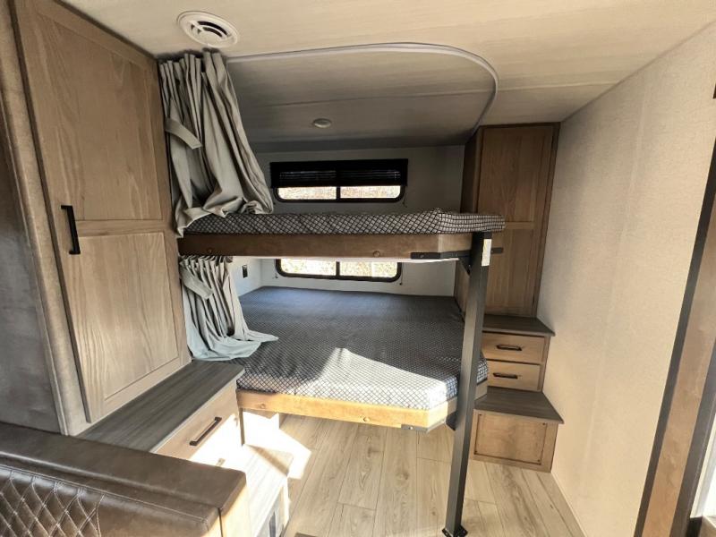 Take your adventures up a notch with this travel trailer in tow! There are queen bunk beds in the back with steps leading up to them and a closet with drawers. The U-shaped dinette will provide space to dine, play games and sleep more guests, and the tri-fold sofa provides even more seating/sleeping space. You will feel right at home in the front private bedroom with a queen bed, dual bedside closets plus a bedroom wardrobe and convenient laundry chute!