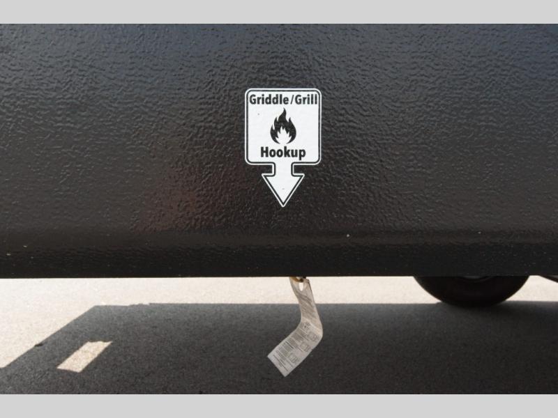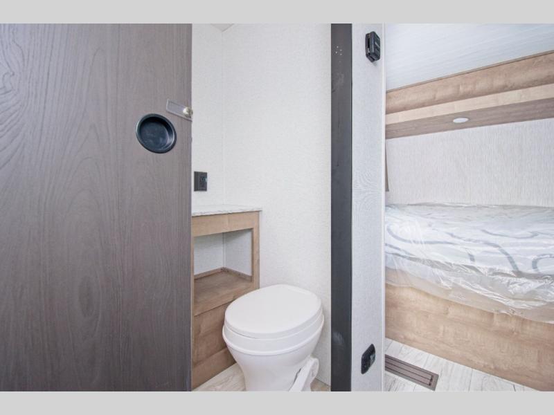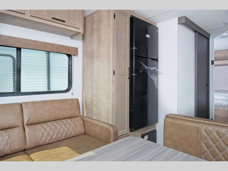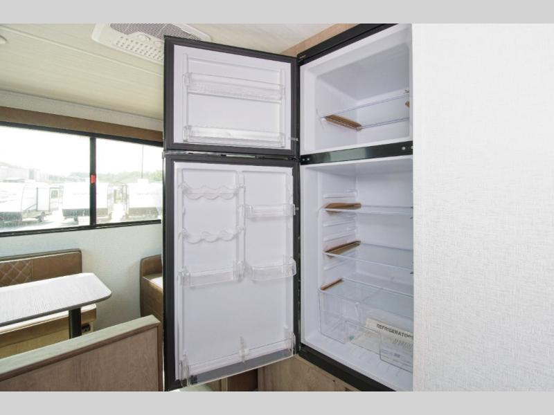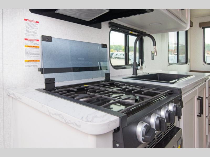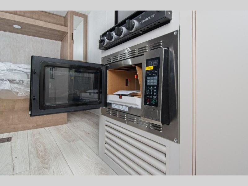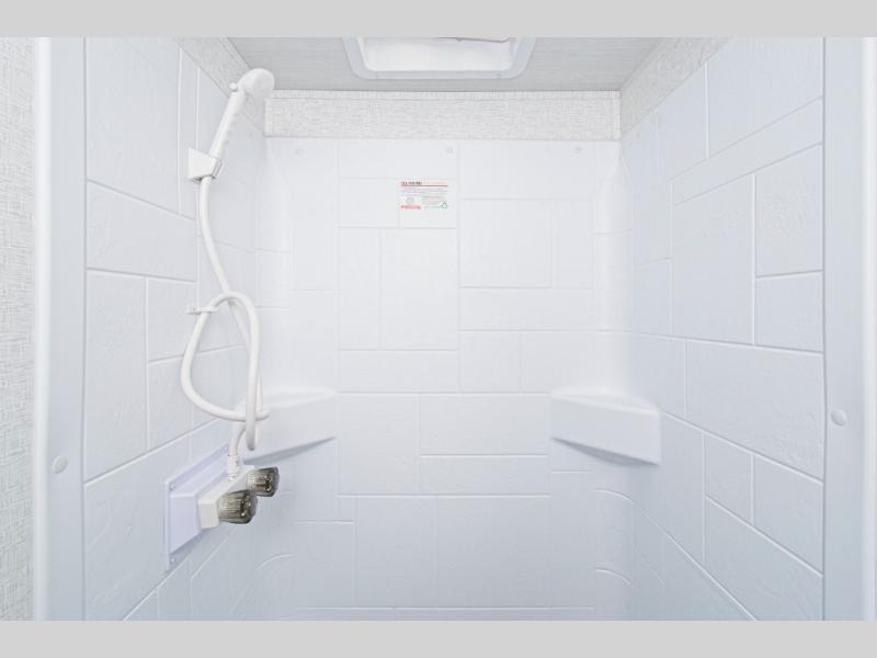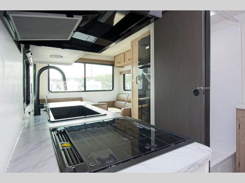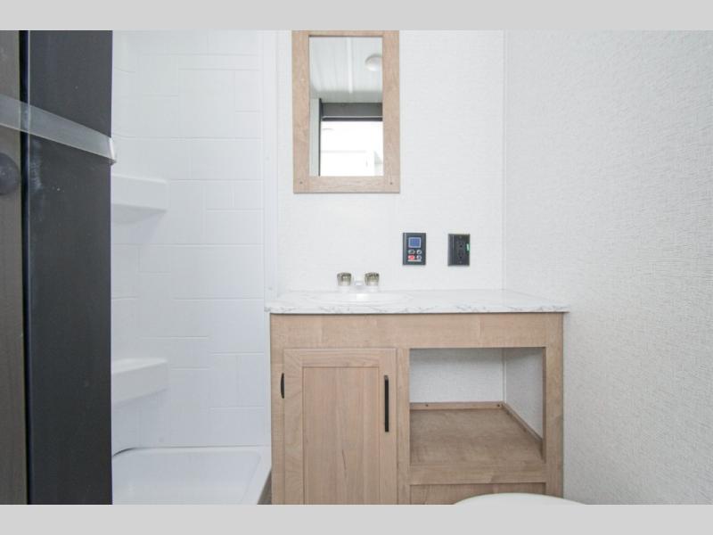 The fully-equipped kitchen includes a gas range, microwave, and a spacious 10 cu. ft. 12V refrigerator for storing all your essentials. And with the full bath on board, staying clean during your trip is hassle-free.