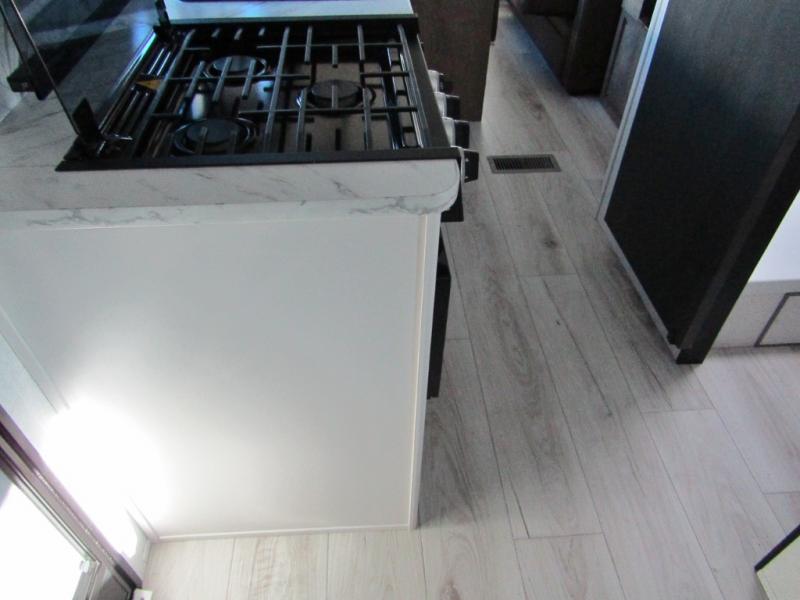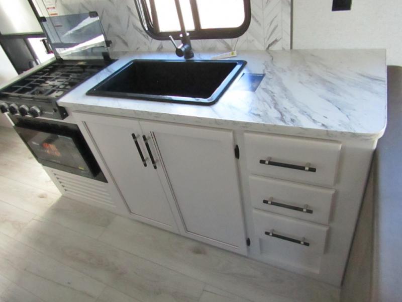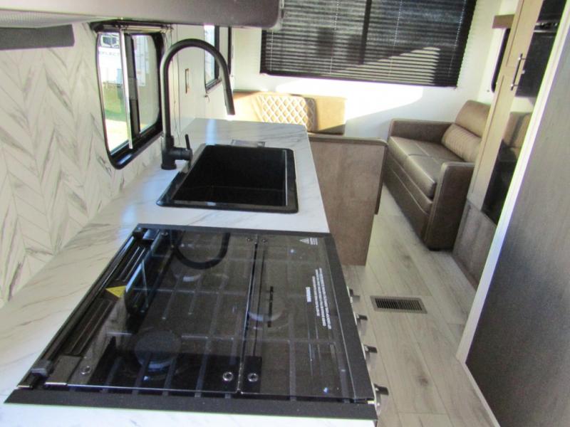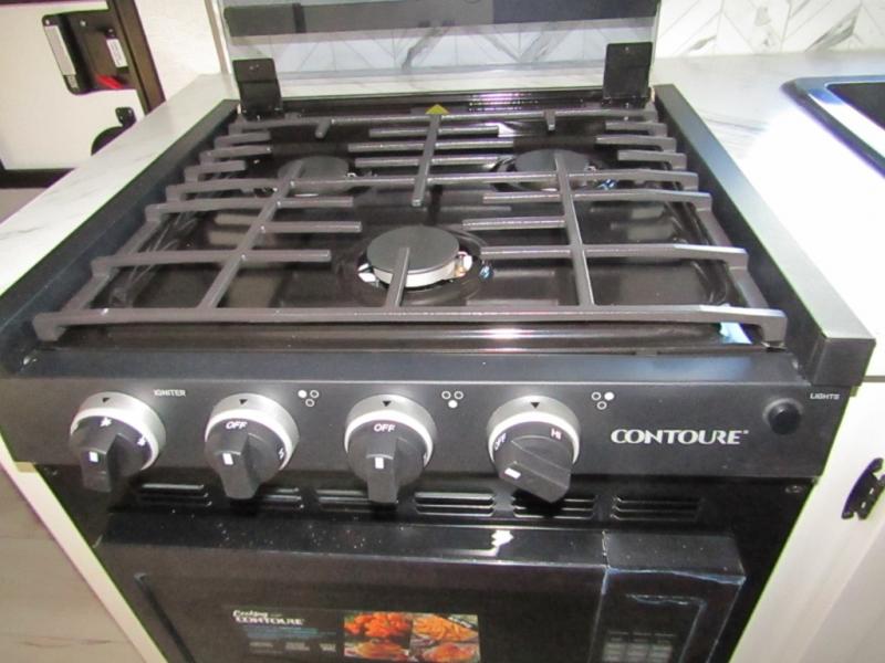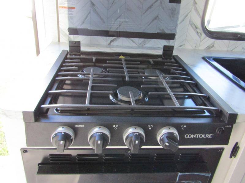 Full kitchen with microwave, stove, and 12V refrigerator (10 cf) for fresh meals on the road