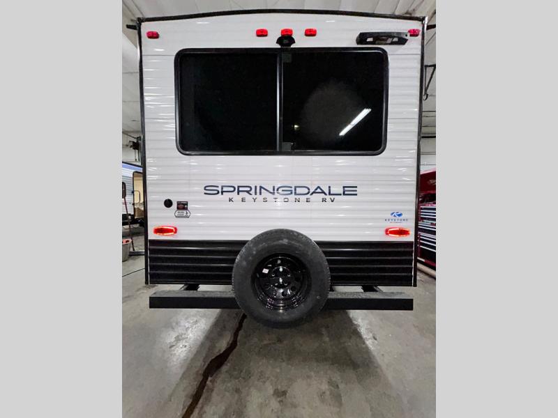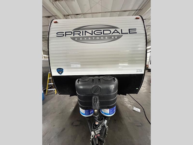 The Springdale Classic travel trailers by Keystone will provide you and your family many great outdoor experiences and it will also be kind to your pocketbook. Each one is constructed with an aluminum exterior, a walkable roof, and an I-beam frame with stamped steel cross-members and outriggers for added strength. There are also electric stabilizer jacks and power tongue jacks outside, along with a friction hinge entry door and an XL entry assist handle for added convenience. Each travel trailer includes a two burner flush mount gas range with a glass cover, LED lighting, bedside outlets, and blackout night shades inside that will provide you with more privacy at night.