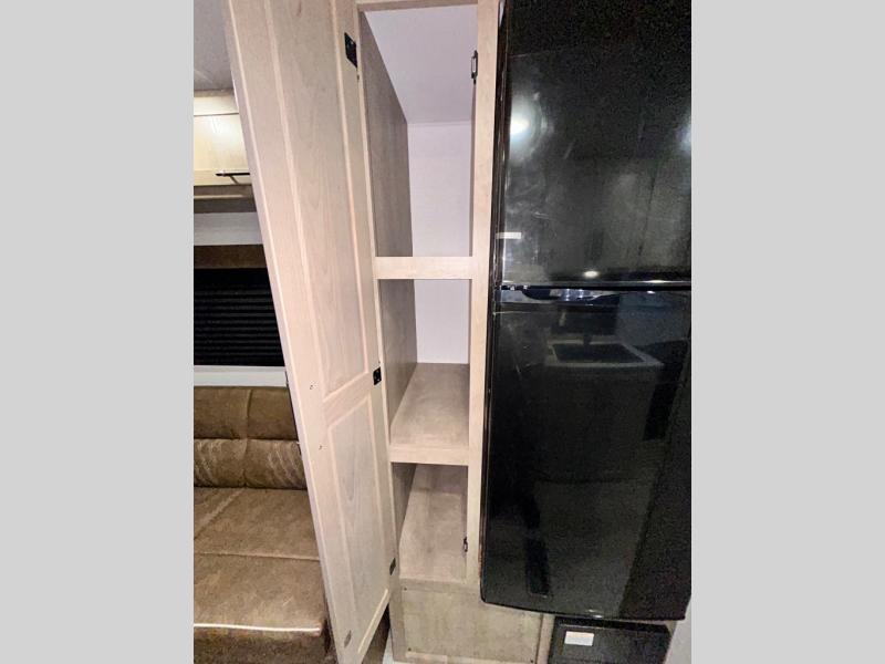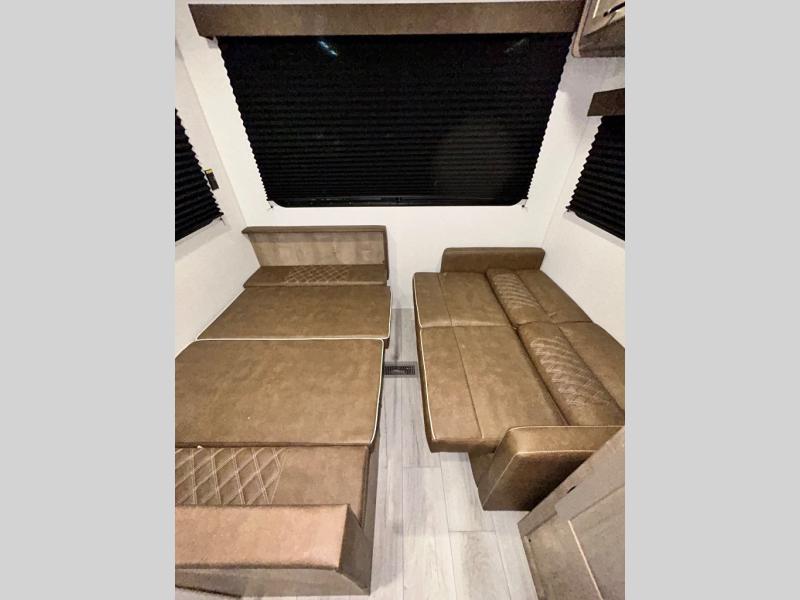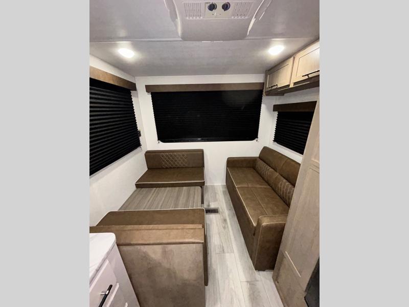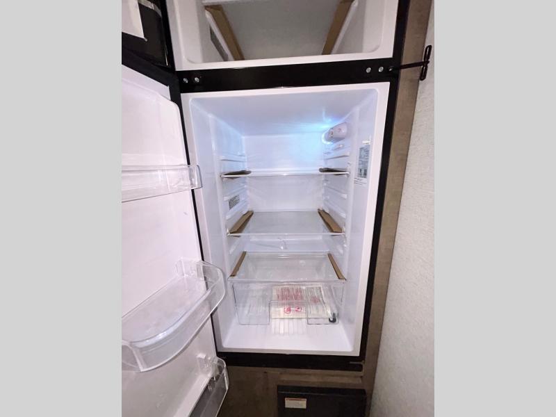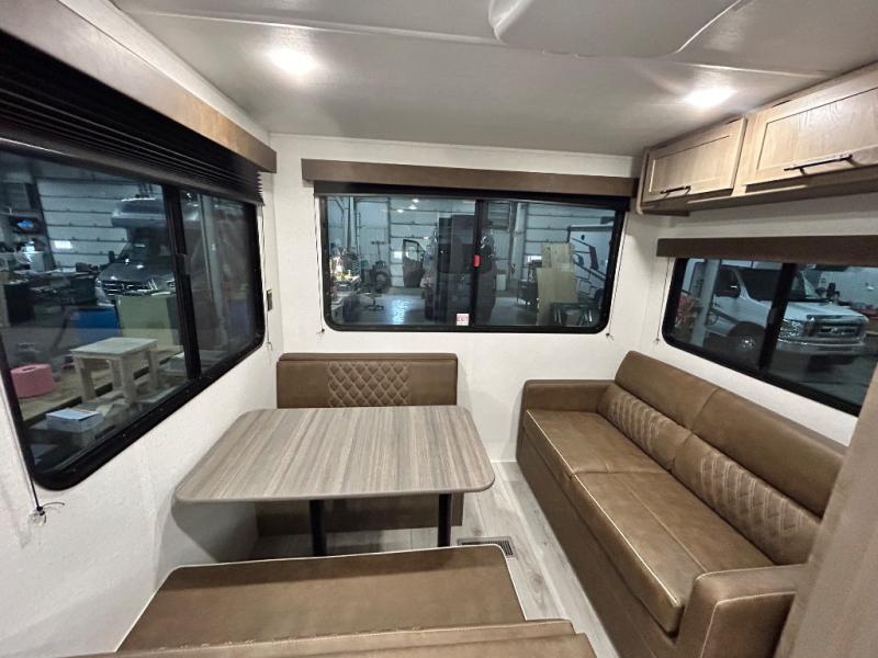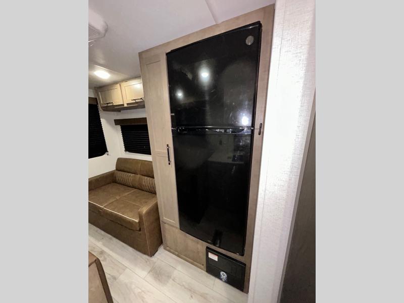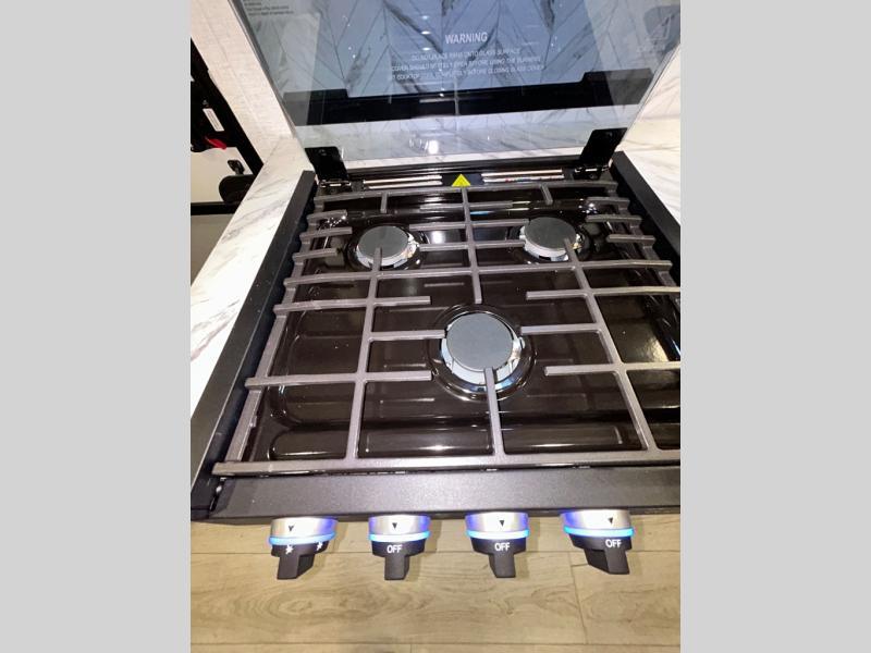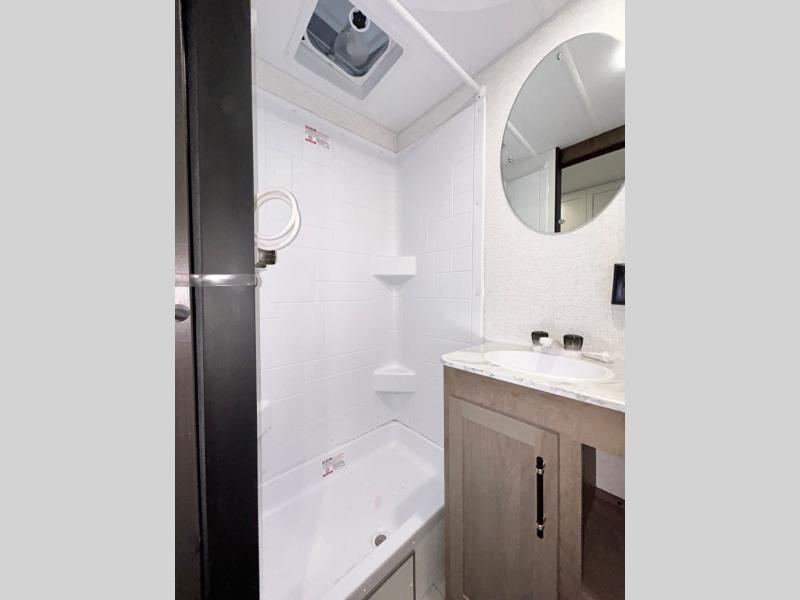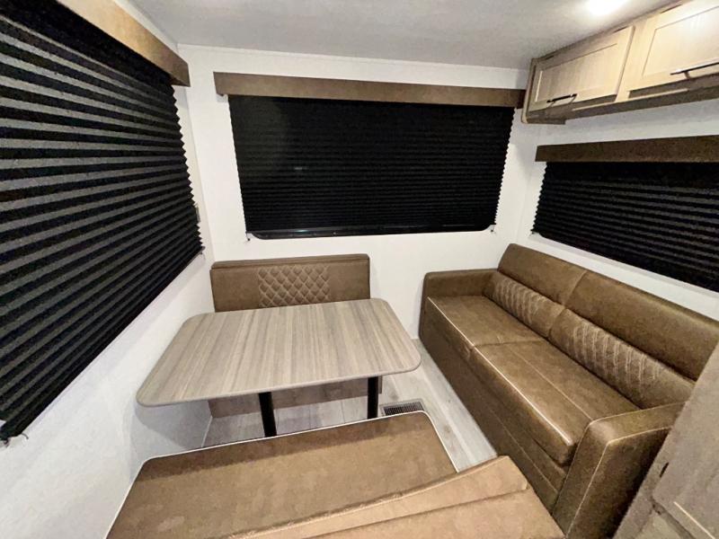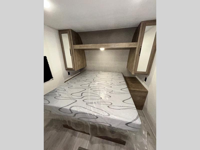 This trailer is perfect for your crew of four to six. There is a queen bed in the semi-private bedroom, along with dual closets and nightstands to keep your things tidy. You can dine each day on the booth dinette, relax on the sofa, and house additional guests here at night. The kitchen includes everything you need to prepare meals each day, including a gas range, microwave, and a 10 cu. ft. 12V refrigerator for cold items. And the full bath on board lets you stay clean throughout each camping trip!