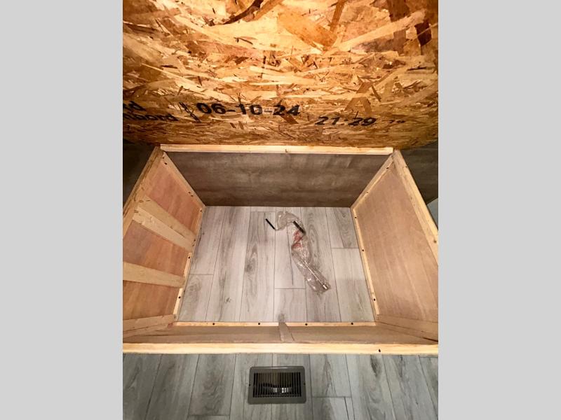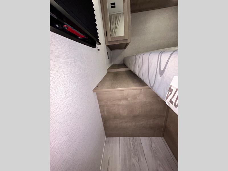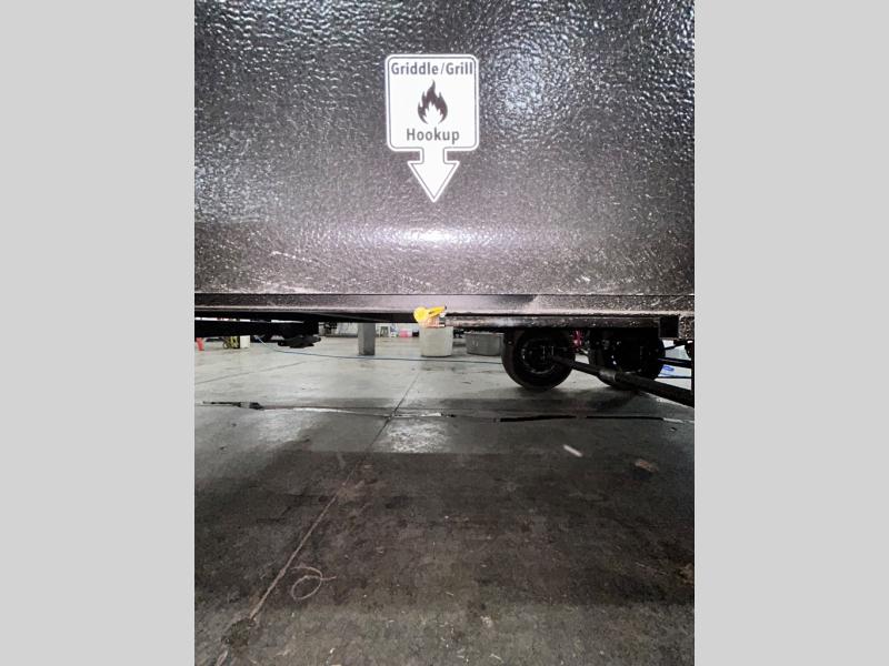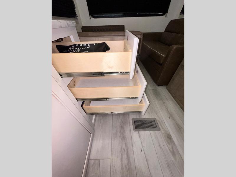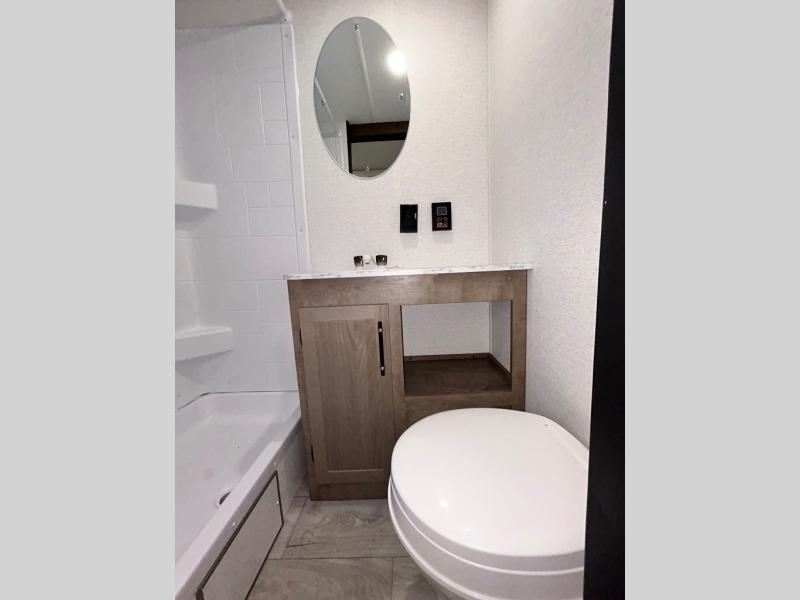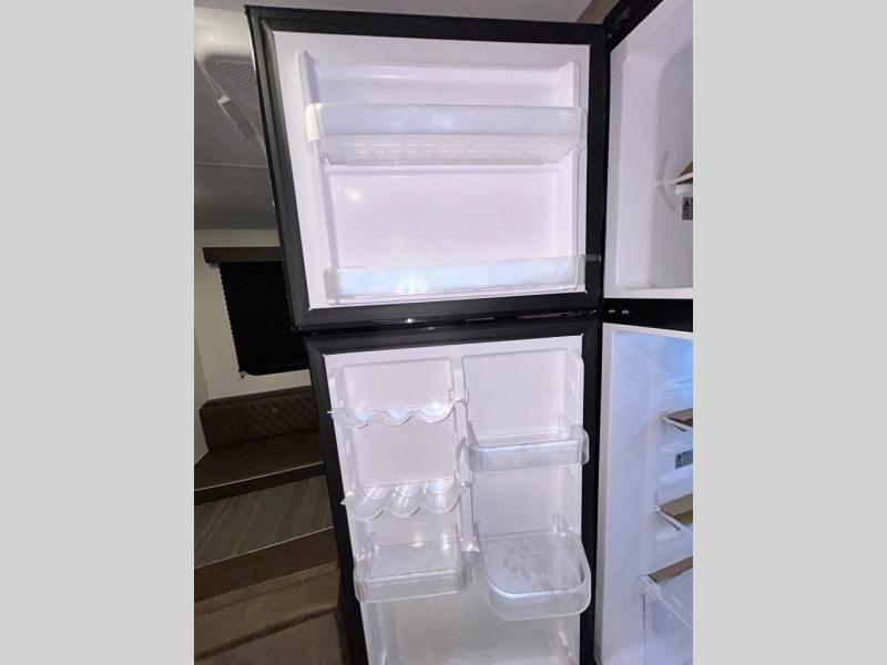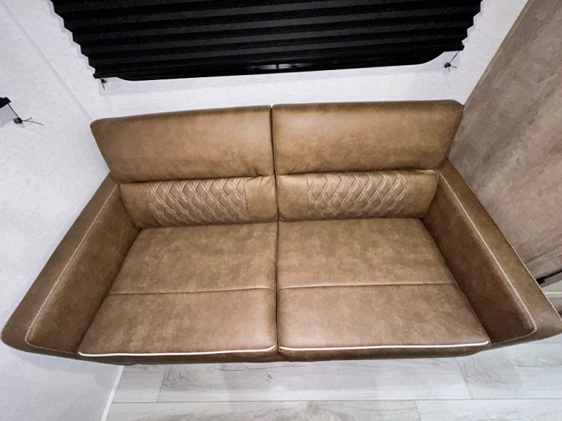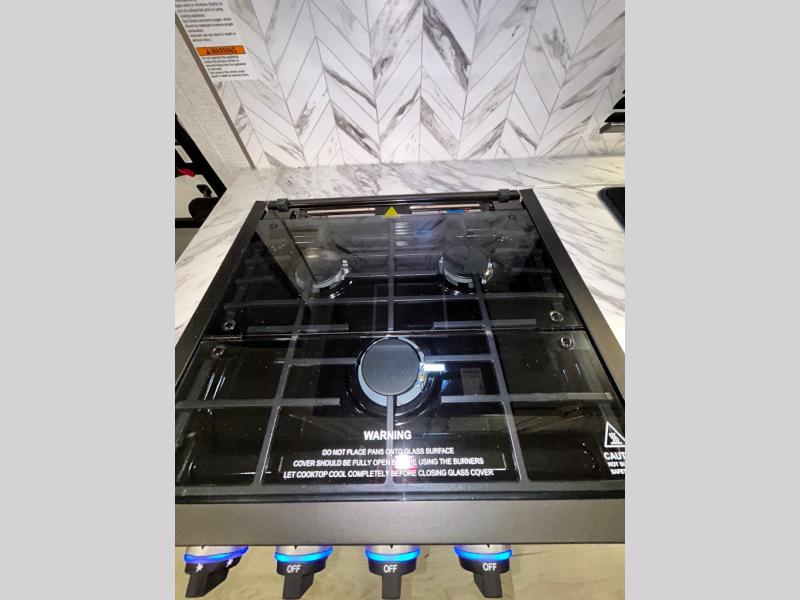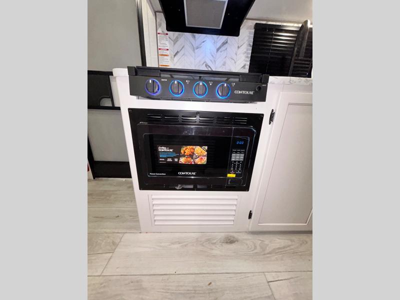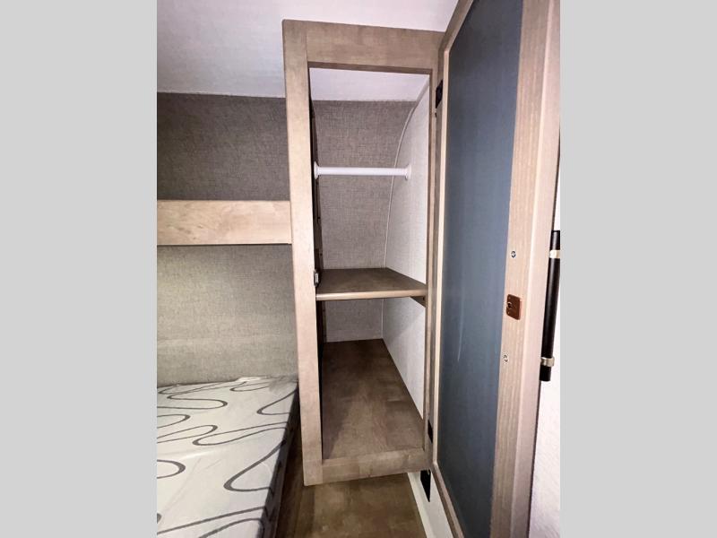 This trailer is perfect for your crew of four to six. There is a queen bed in the semi-private bedroom, along with dual closets and nightstands to keep your things tidy. You can dine each day on the booth dinette, relax on the sofa, and house additional guests here at night. The kitchen includes everything you need to prepare meals each day, including a gas range, microwave, and a 10 cu. ft. 12V refrigerator for cold items. And the full bath on board lets you stay clean throughout each camping trip!