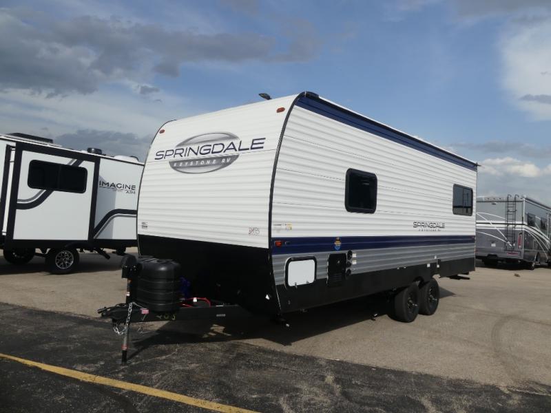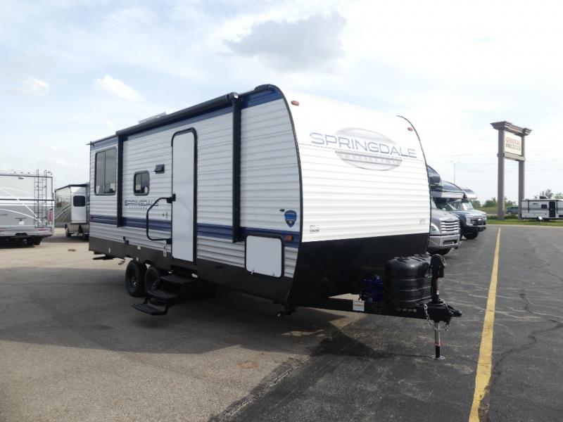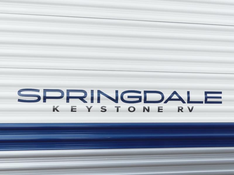The Springdale Classic travel trailers by Keystone will provide you and your family many great outdoor experiences and it will also be kind to your pocketbook. Each one is constructed with an aluminum exterior, a walkable roof, and an I-beam frame with stamped steel cross-members and outriggers for added strength. There are also electric stabilizer jacks and power tongue jacks outside, along with a friction hinge entry door and an XL entry assist handle for added convenience. Each travel trailer includes a two burner flush mount gas range with a glass cover, LED lighting, bedside outlets, and blackout night shades inside that will provide you with more privacy at night.
