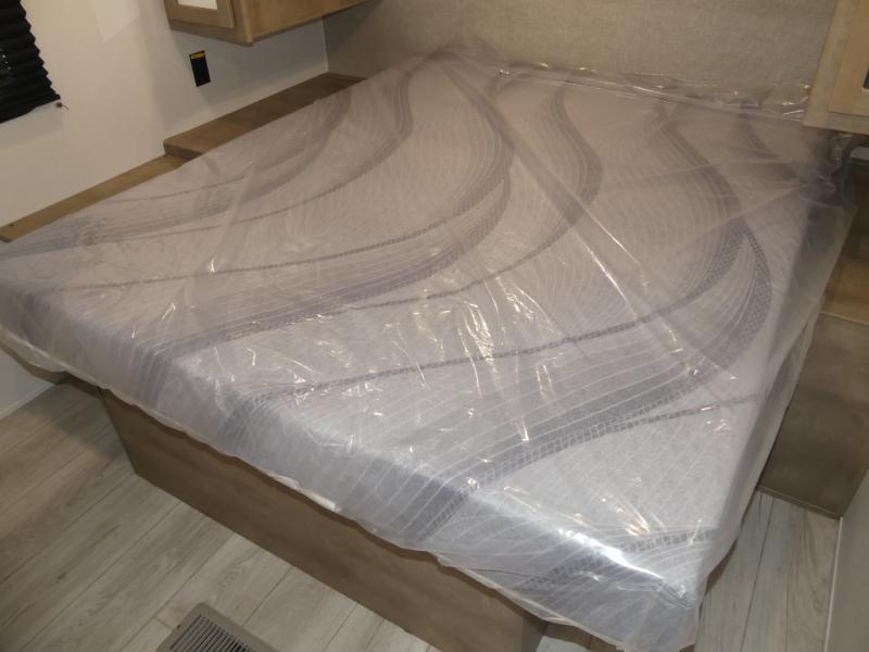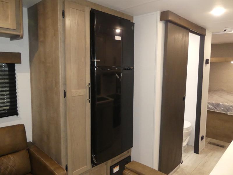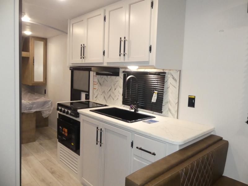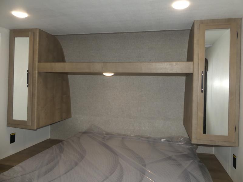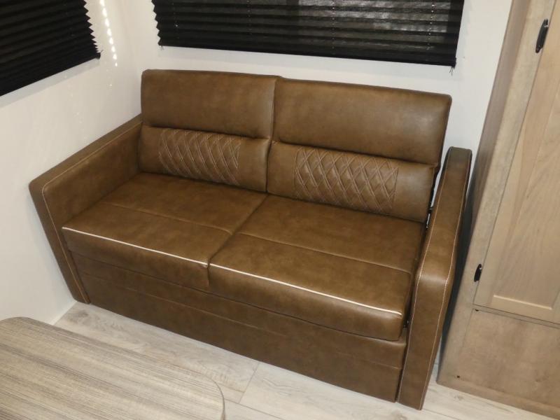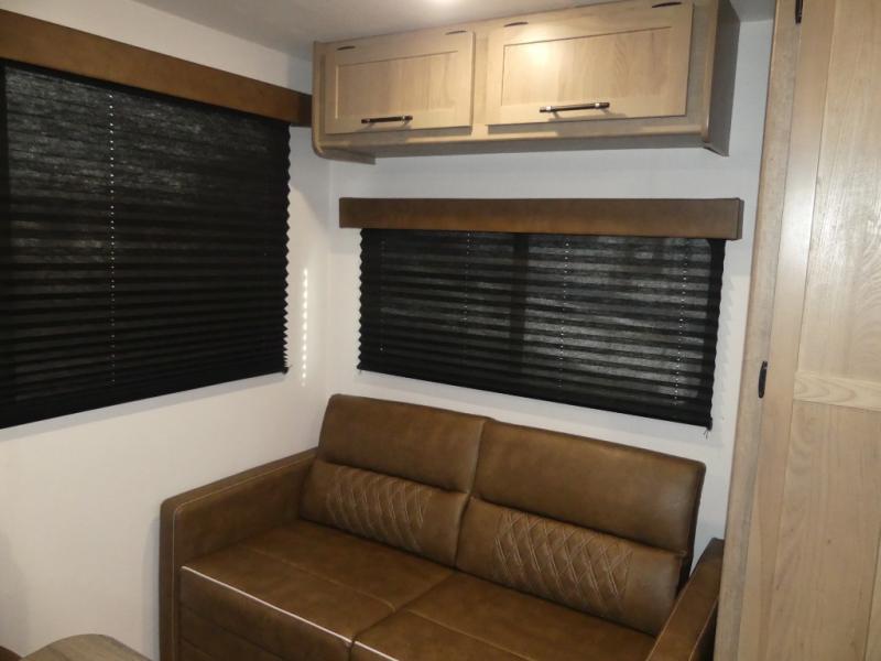 This trailer is perfect for your crew of four to six. There is a queen bed in the semi-private bedroom, along with dual closets and nightstands to keep your things tidy. You can dine each day on the booth dinette, relax on the sofa, and house additional guests here at night. The kitchen includes everything you need to prepare meals each day, including a gas range, microwave, and a 10 cu. ft. 12V refrigerator for cold items. And the full bath on board lets you stay clean throughout each camping trip!
